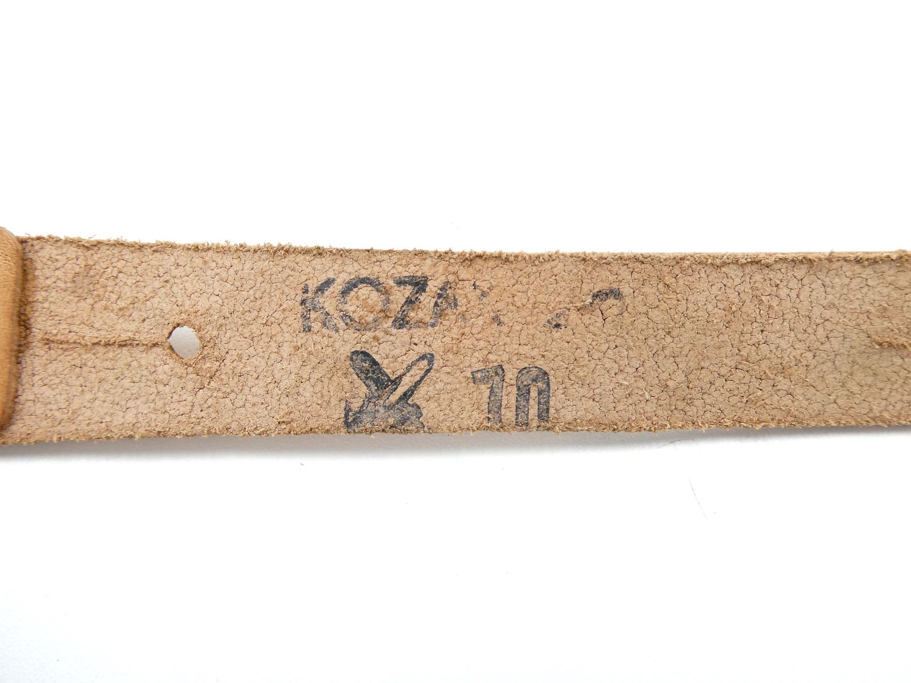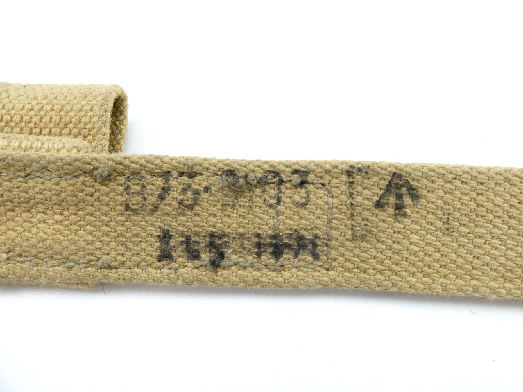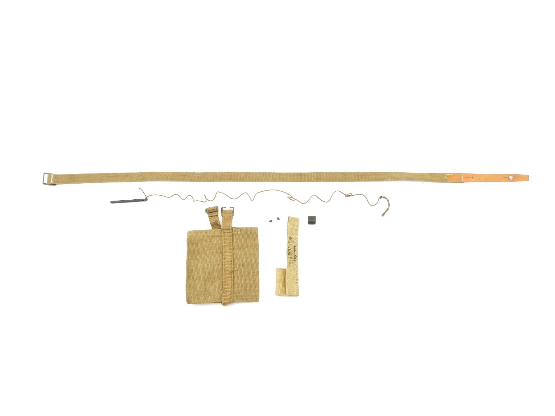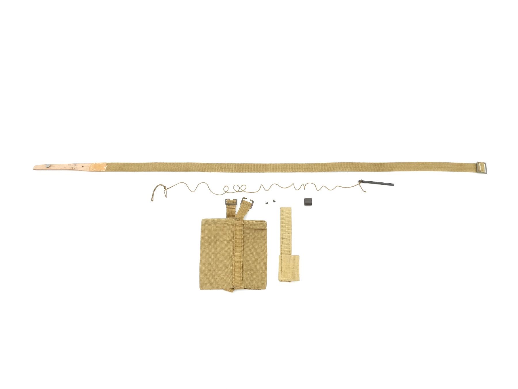 LOT INCLUDES; (1) BRITISH MILITARY TAN P37 WEB BAYONET FROG, FITS P1907 BAYONETS, MARKED: "973-9103" WITH BROAD ARROW, VARIOUS OTHER FAINT / UN-CLEAR MARKINGS, OVERALL LENGTH APPROX. 8", (1) WWII BRITISH MILITARY TAN P37 WEB CANTEEN CARRIER, MARKED: "A.G. T.V. LTD 1943" WITH BROAD ARROW, BROAD ARROW OVER "179", (1) CZECH MILITARY TAN WEB SLING, LEATHER END MARKED: "KOZAK" CROSSED SWORDS "10", OVERALL LENGTH APPROX. 51", (1) K98 FRONT SIGHT HOOD, BLUED STEEL, NO VISIBLE MARKINGS, (2) SCREWS & (1) ROPE PULL-THRU WITH STEEL EIGHT, WEIGHT OVERALL LENGTH APPROX. 4". SEE PHOTOS.