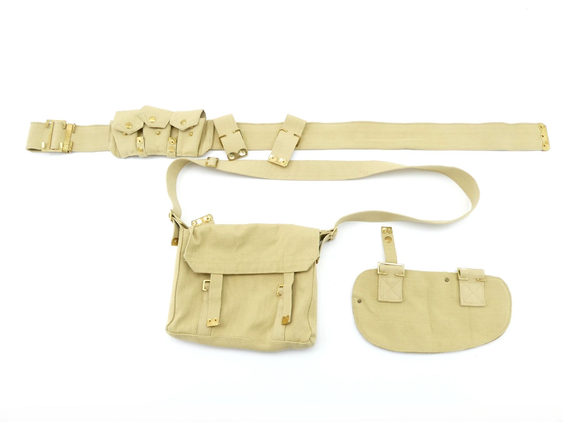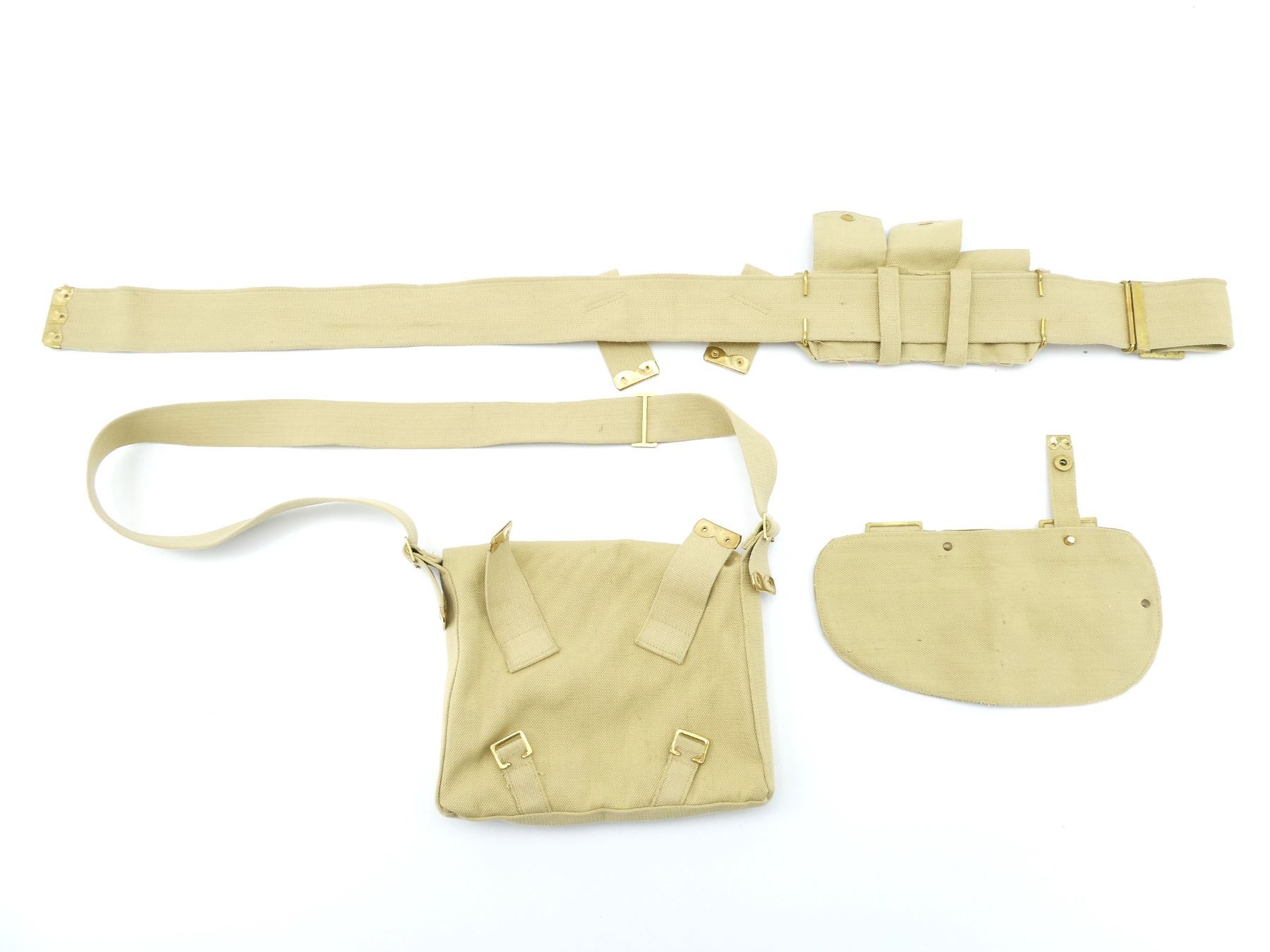 ALL WWI BRITISH STYLE, LOT INCLUDES; (1) NEW MANUFACTURE P1908 TAN WEB CANVAS HAVERSACK WITH CROSS BODY STRAP, BRASS FITTINGS, NO VISIBLE MARKINGS, (1) NEW MANUFACTURE P1908 TAN WEB CANVAS ENTRENCHING TOOL COVER, BRASS FITTINGS, NO VISIBLE MARKINGS & (1) NEW MANUFACTURE P1908 TAN WEB CANVAS WEB BELT WITH 3-POCKET AMMO POUCH ATTACHED, POUCH FITS .303 BRITISH AMMO ON STRIPPER CLIPS, NO VISIBLE MARKINGS, BELT OVERALL LENGTH APPROX. 53", ADJUSTABLE. SEE PHOTOS.