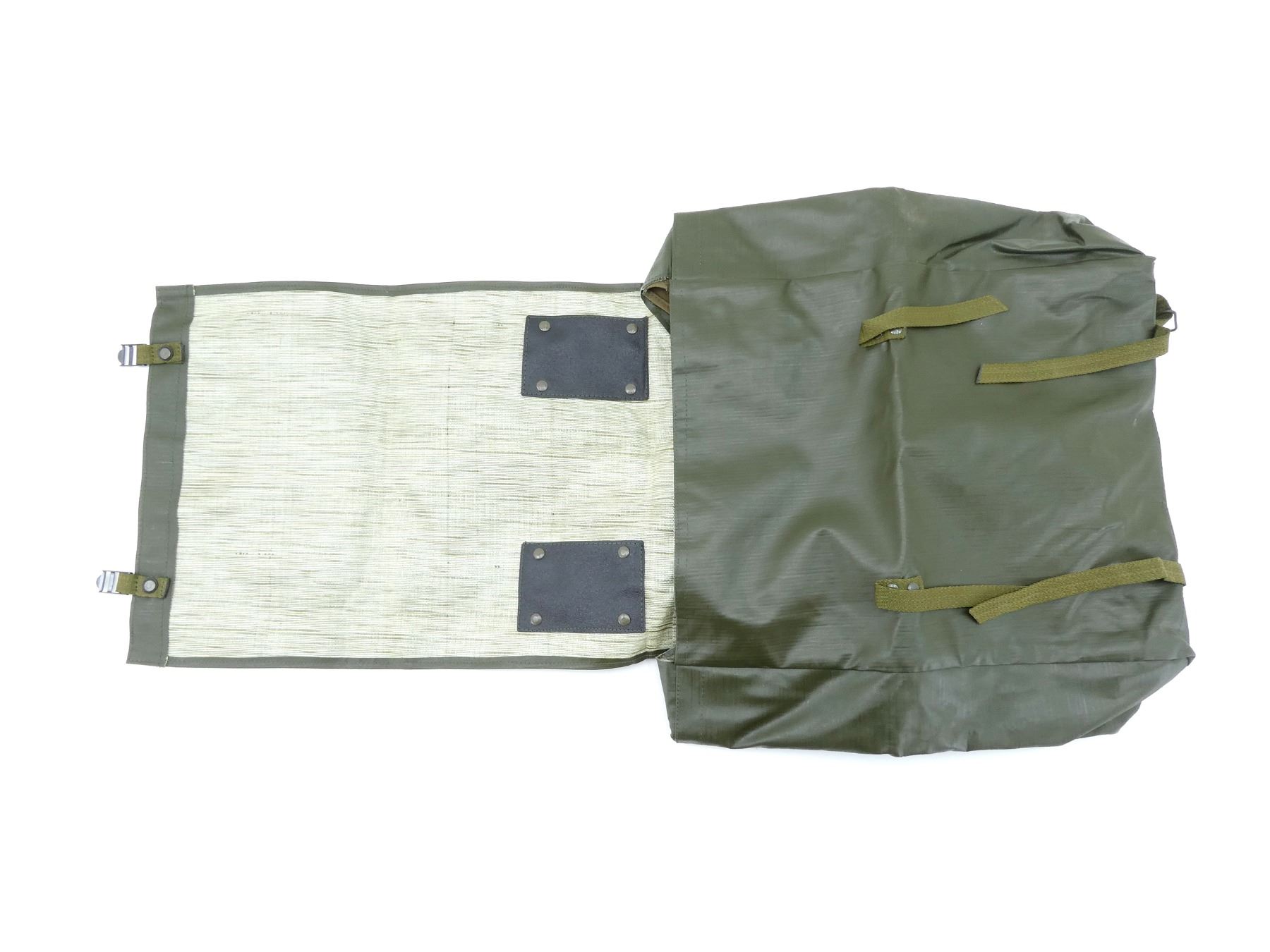 (1) GREEN RUBBERIZED BACKPACK WITH NYLON SHOULDER STRAPS, VARIOUS OTHER NYLON STRAPS, METAL FITTINGS, FAINT INK STAMP INSIDE, APPROX. 15.5" X 6.5" X 19". SEE PHOTOS.