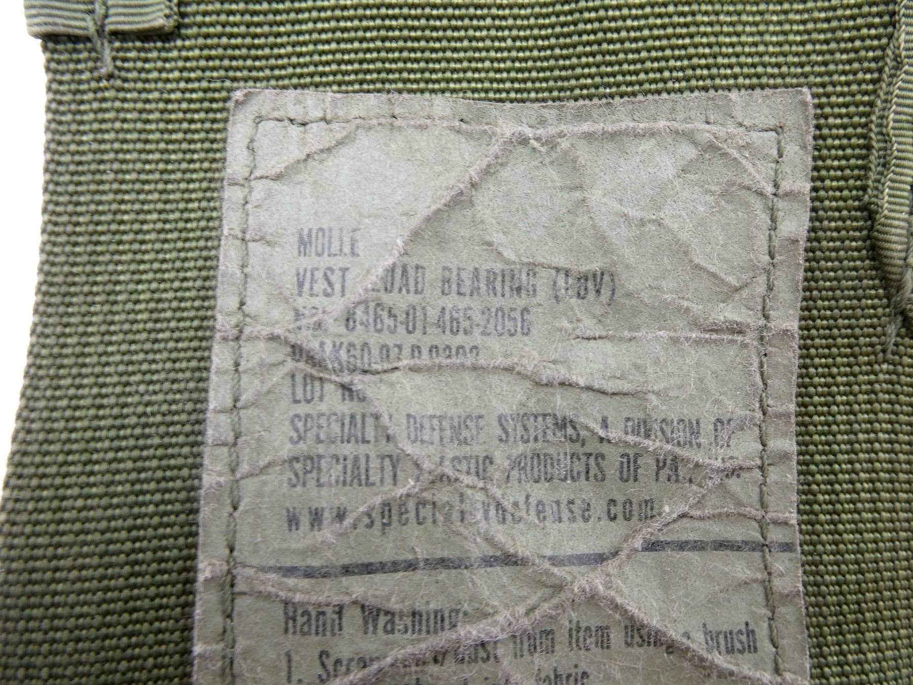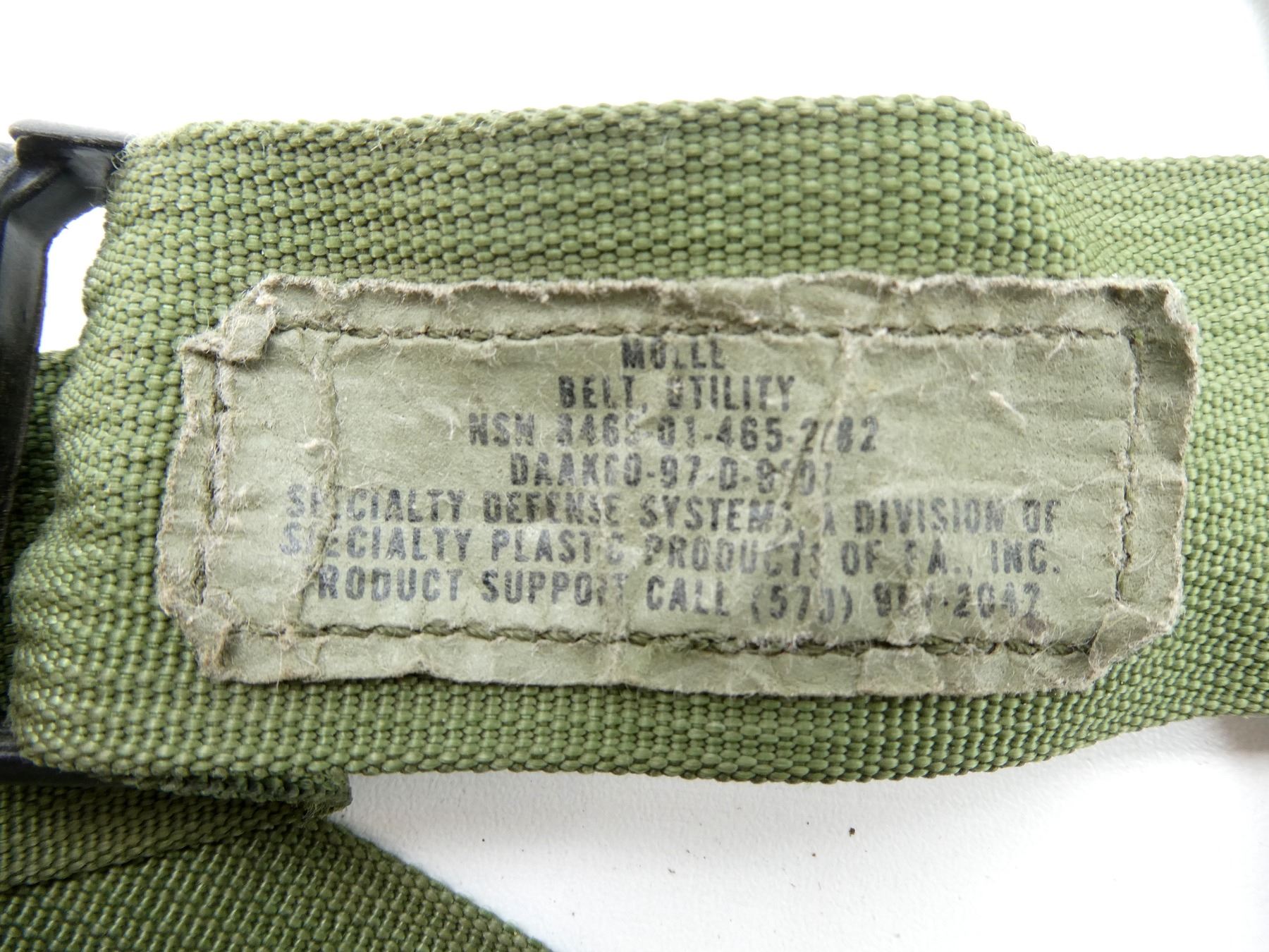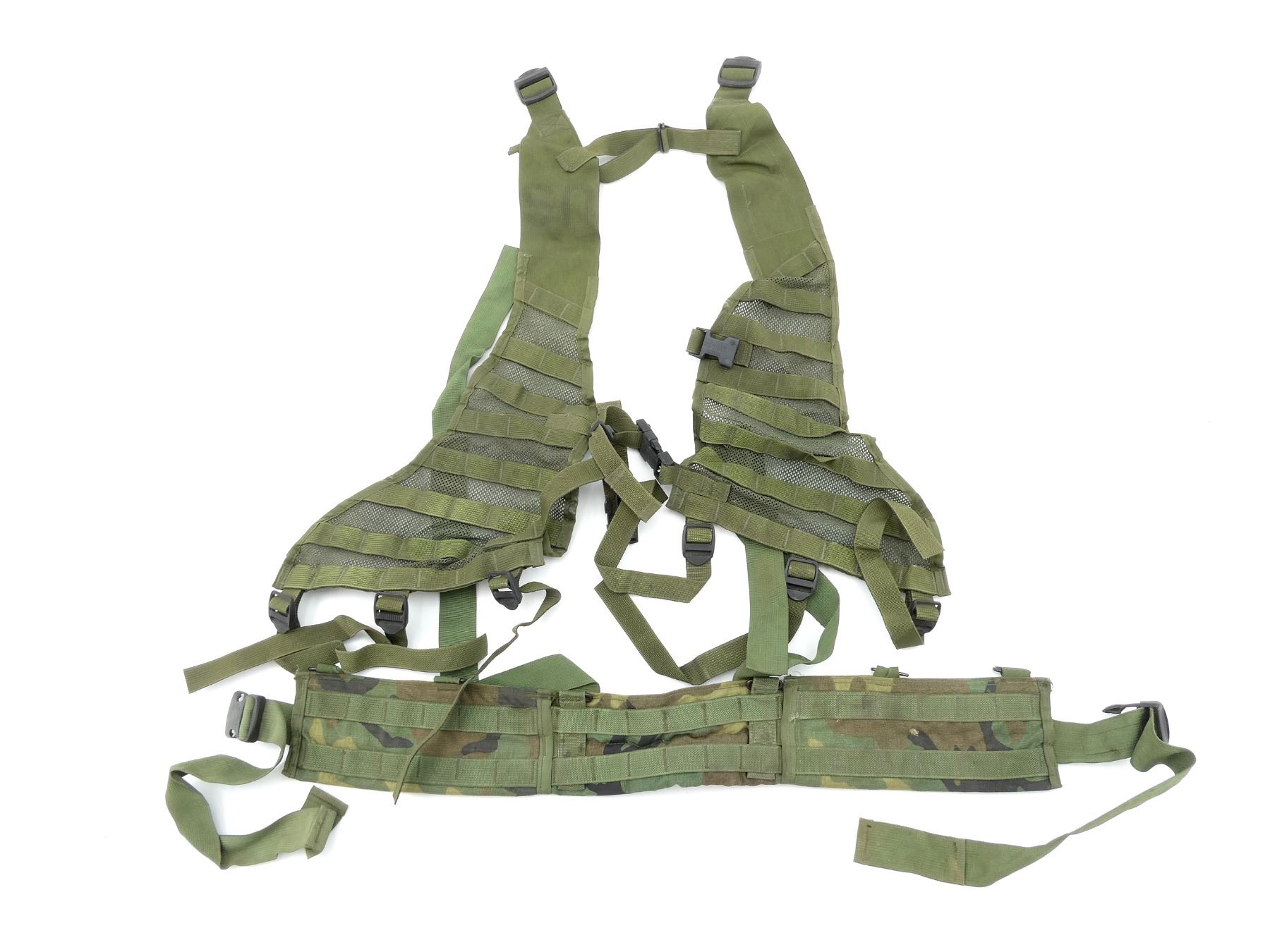 LOT INCLUDES; (1) GREEN / WOODLAND CAMO MOLLE UTILITY BELT, MARKED: "MOLLE, BELT, UTILITY, NSN 8465-01-465-2082" ETC., VARIOUS GREEN NYLON STRAPS, METAL / PLASTIC FITTINGS, SHOWS WEAR, ADJUSTABLE, OVERALL LENGTH APPROX. 34" & (1) GREEN NYLON MESH LOAD BEARING VEST, MARKED: "U.S." & "MOLLE, VEST, LOAD BEARING (LBV), NSN 8465-01-465-2056" ETC., VARIOUS GREEN NYLON STRAPS, PLASTIC / METAL FITTINGS / BUCKLES, SHOWS WEAR & ADJUSTABLE. SEE PHOTOS.