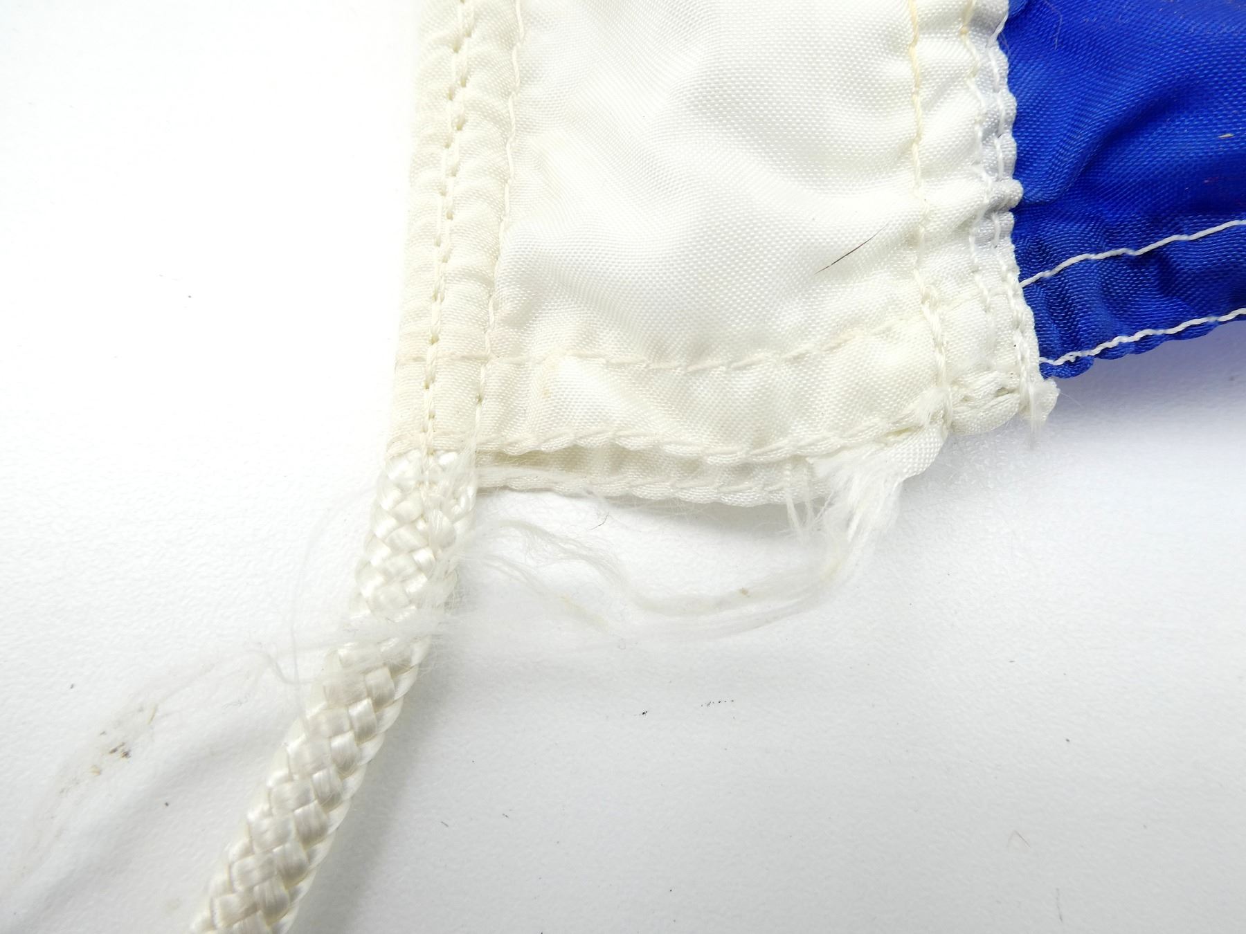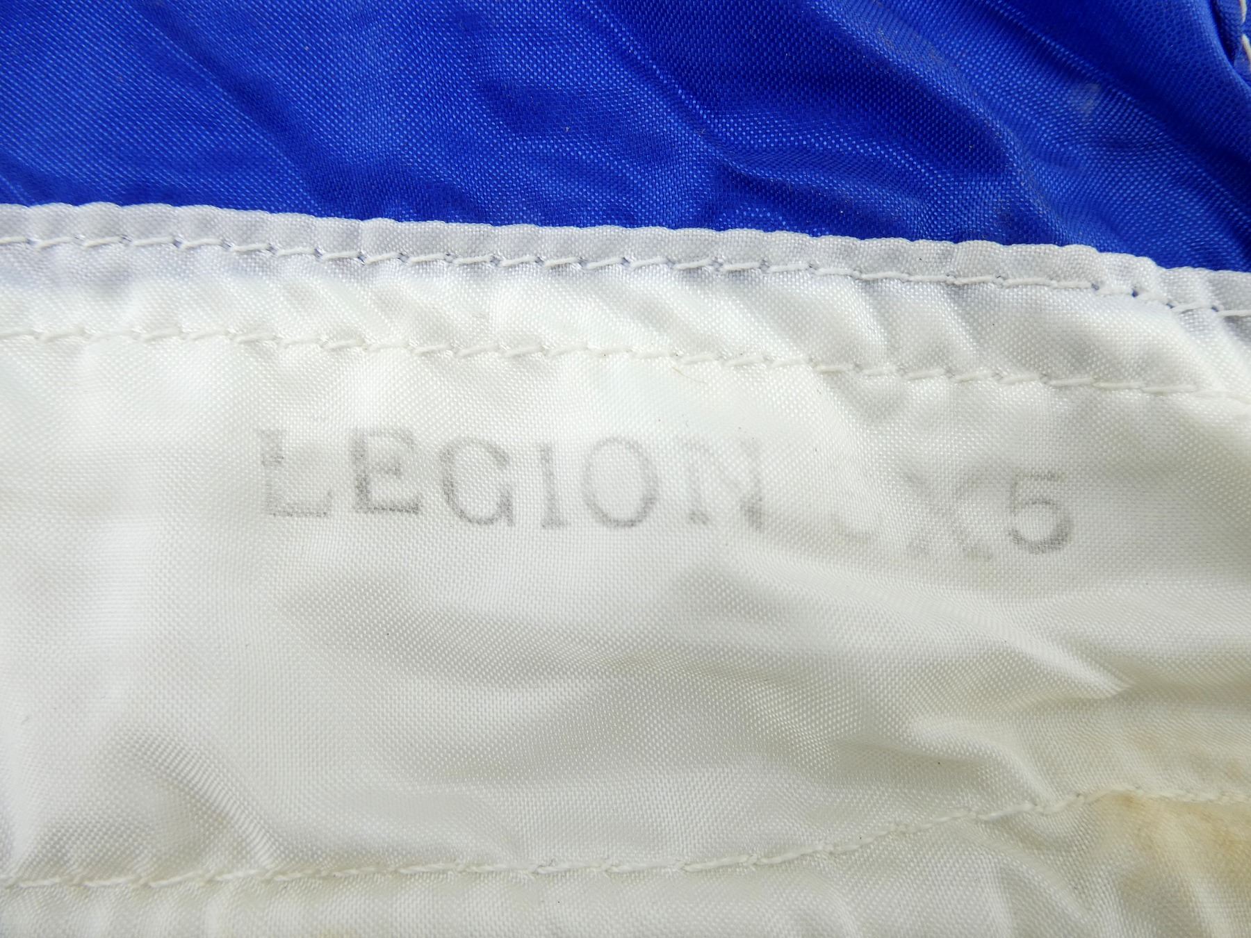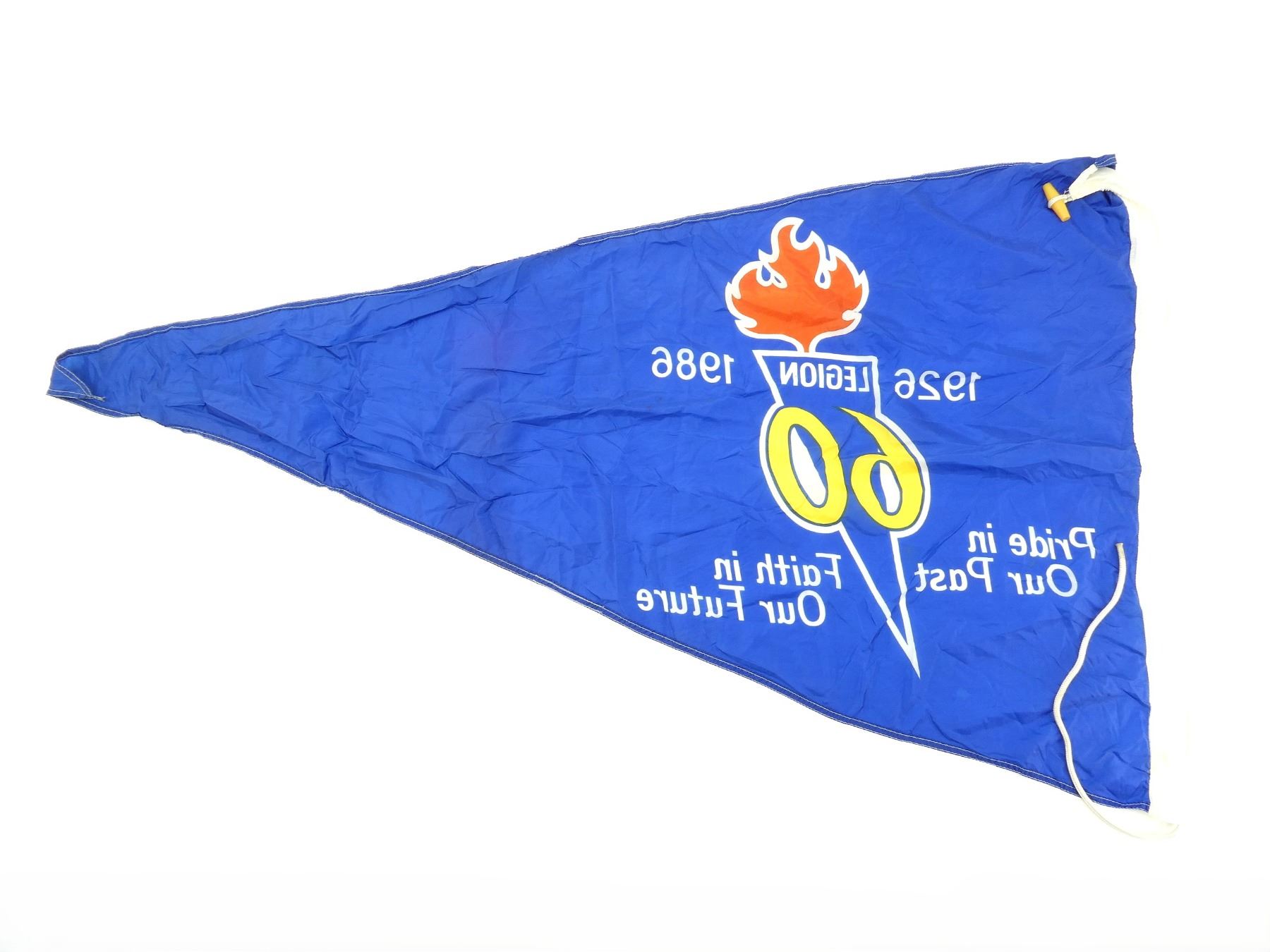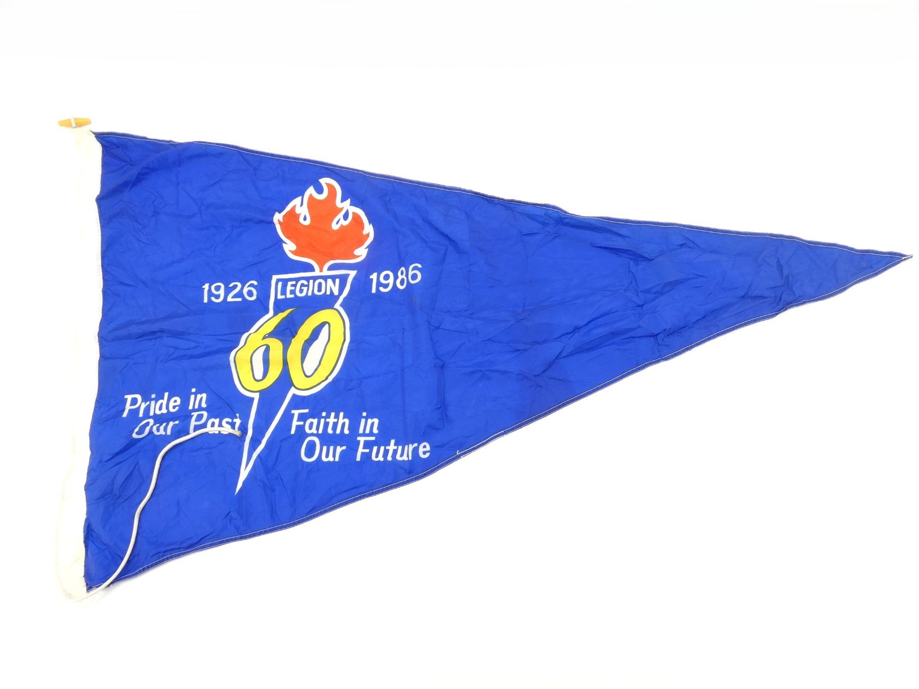 (1) BLUE TRIANGULAR FLAG, MARKED: "1926, 1986, LEGION 60, PRIDE IN OUR PAST, FAITH IN OUR FUTURE", SHOWS WEAR, APPROX. 34" X 60". SEE PHOTOS.