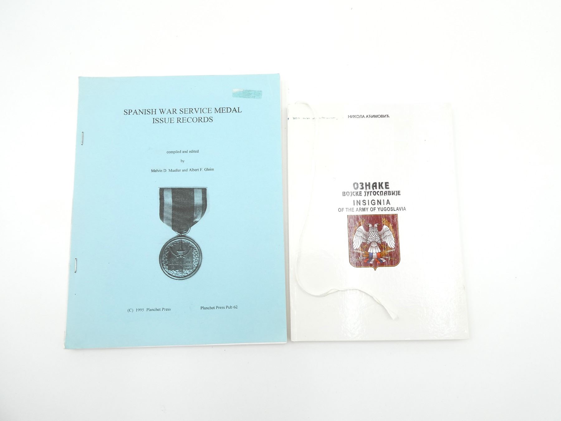 LOT INCLUDES; (1) "SPANISH WAR SERVICE MEDAL ISSUE RECORDS" BOOK COMPILED / EDITED BY MELVIN D. MUELLER & ALBERT F. GLEIM, SOFT COVER, COPYRIGHT 1995 & (1) "INSIGNIA OF THE ARMY OF YUGOSLAVIA" BOOK, EDITED BY SLAVICA DERIC-MAGAZINOVIC, IN YUGOSLAVIAN & ENGLISH, HARD COVER, ISBN: 86-335-0027-2. SEE PHOTOS.