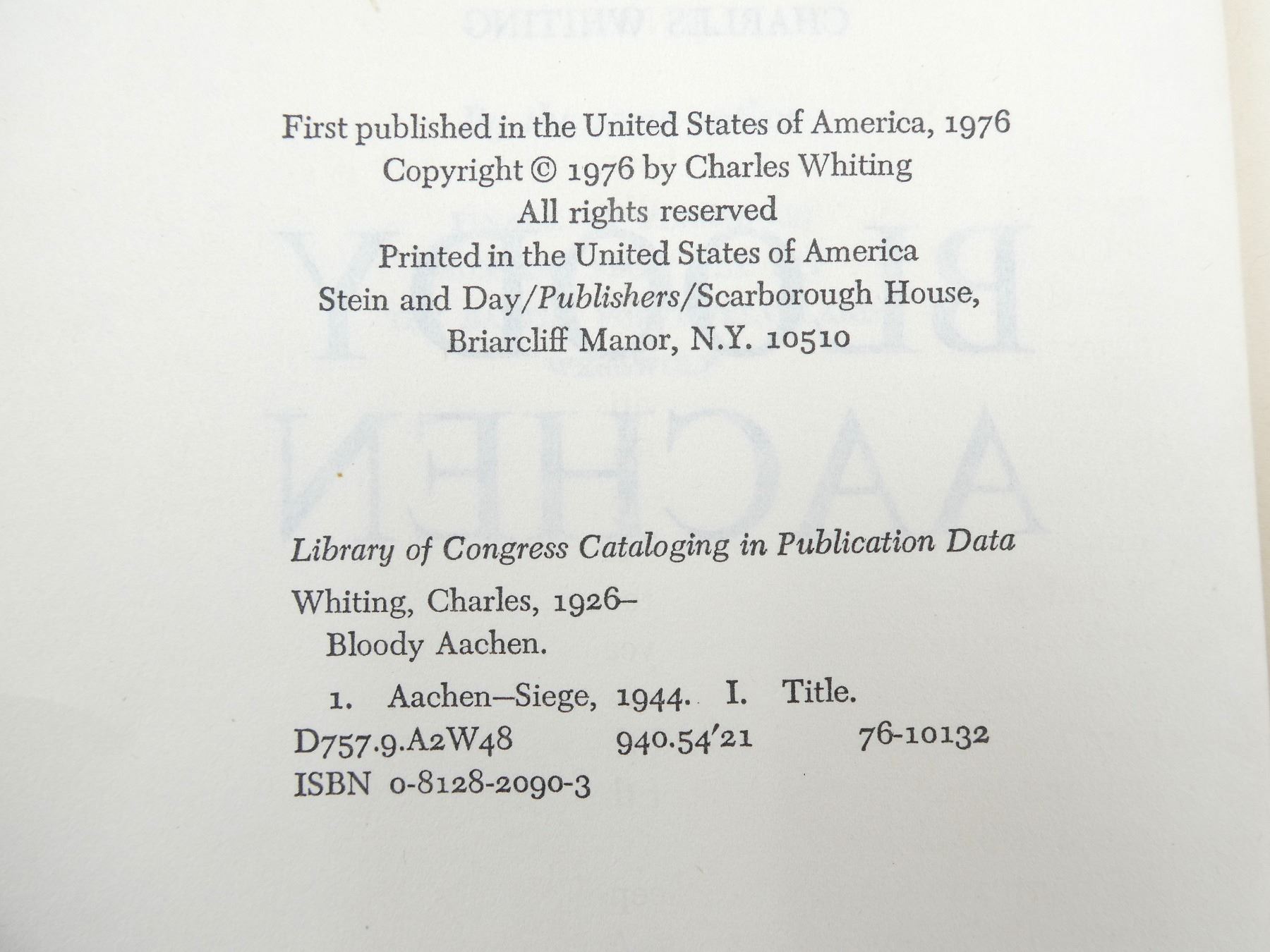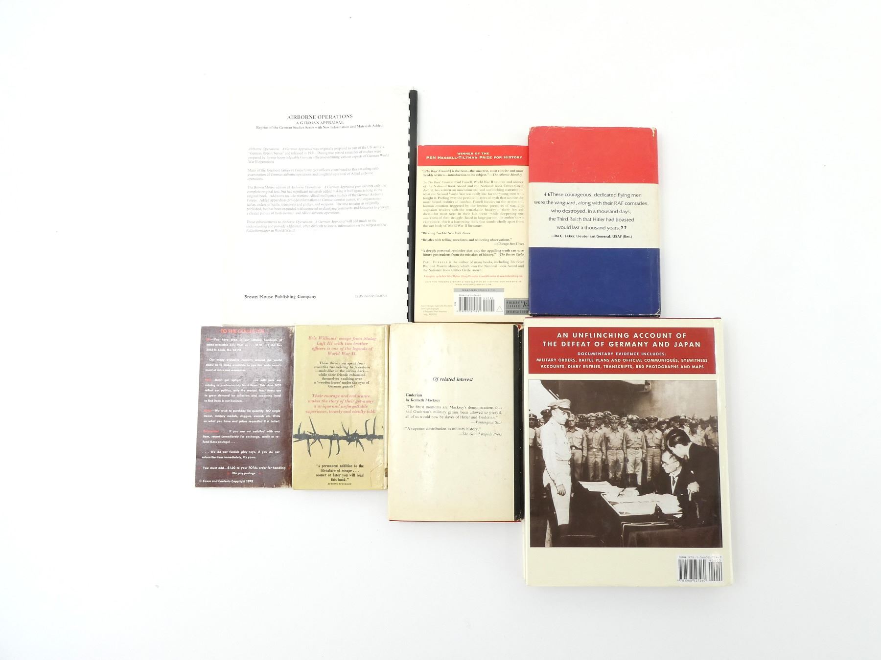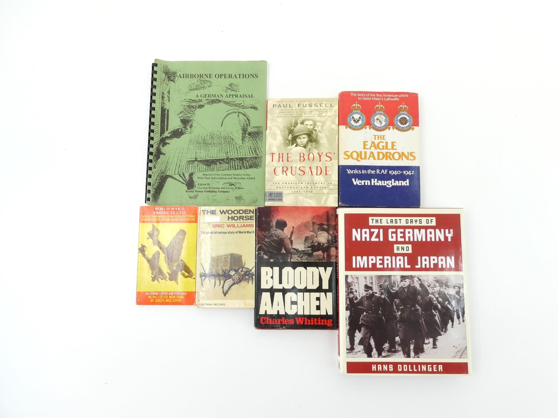 LOT INCLUDES; (1) "THE LAST DAYS OF NAZI GERMANY AND IMPERIAL JAPAN" BOOK BY HANS DOLLINGER, ISBN: 978-1-56852-726-0, (1) "AIRBORNE OPERATIONS, A GERMAN APPRAISAL" BOOK EDITED BY GORDON L. ROTTMAN AND LEROY WILSON, SOFT COVER, ISBN: 0-938570-02-1, (1) "THE EAGLE SQUADRONS, YANKS IN THE RAF 1940-1942" BOOK BY VERN HAUGHLAN, HARD COVER WITH DUST COVER, COPYRIGHT 1979, (1) "THE WOODEN HORSE, THE GREATEST ESCAPE STORY OF WORLD WAR II" BOOK BY ERIC WILLIAMS, HARD COVER, COPYRIGHT 1965, (1) "BLOODY AACHEN" BOOK BY CHARLES WHITING, HARD COVER WITH DUST COVER, ISBN: 0-8128-2090-3, (1) "THE BOYS' CRUSADE" BOOK BY PAUL FUSSELL, SOFT COVER, ISBN: 0-8129-7488-3 & (1) "MILITARY, RELIC, COLLECTORS REFERENCE BOOK AND CATALOG" BOOK BY WORLD WAR II PRODUCTS LTD, SOFT COVER, COPYRIGHT 1978. SEE PHOTOS.