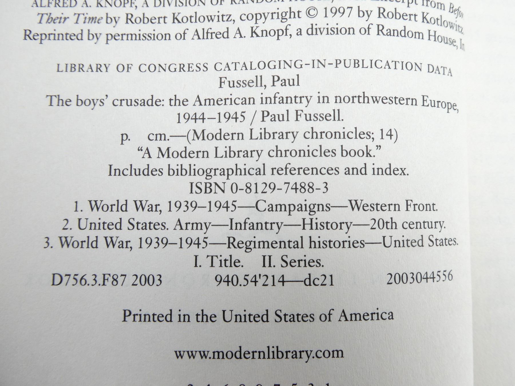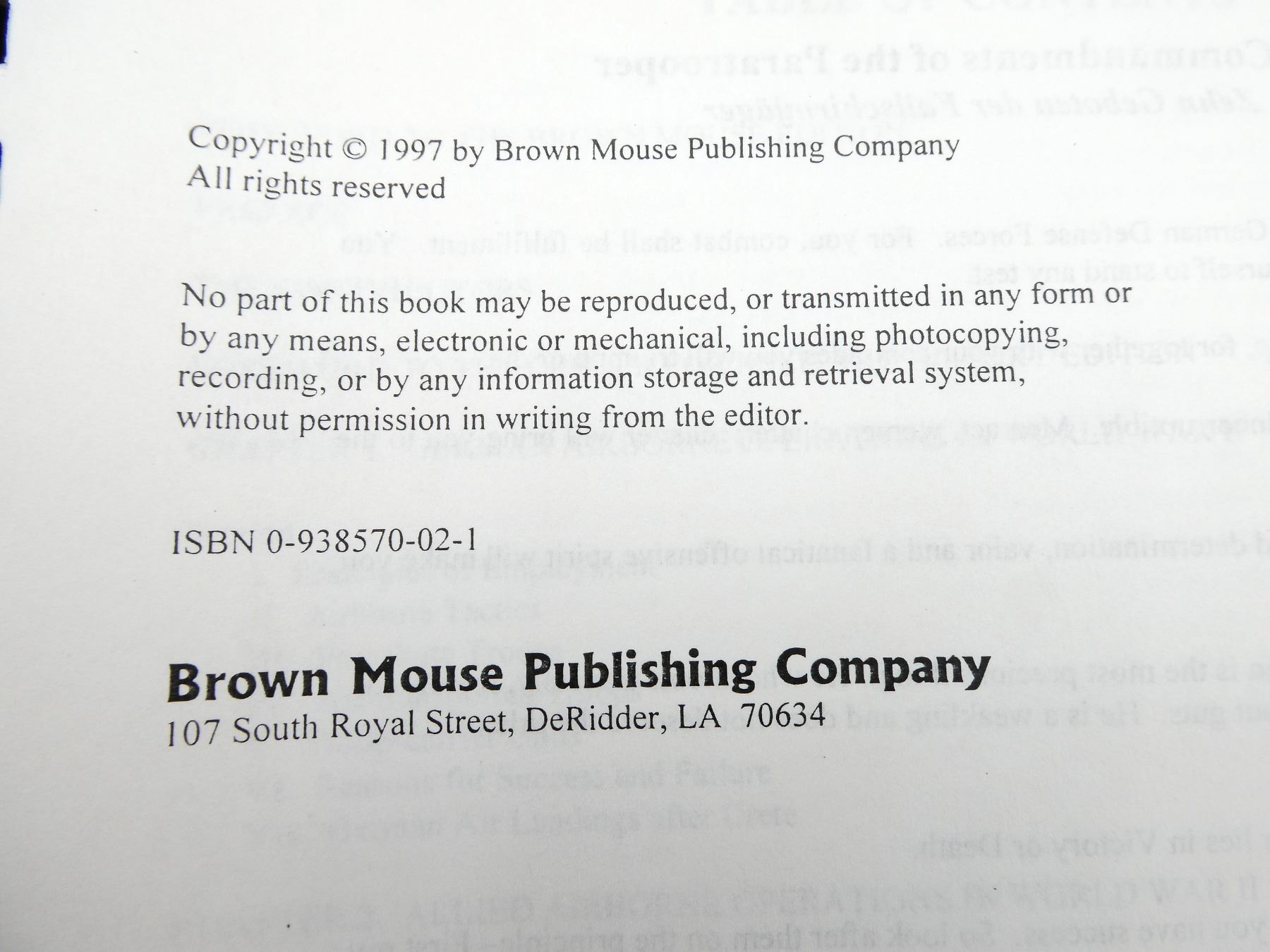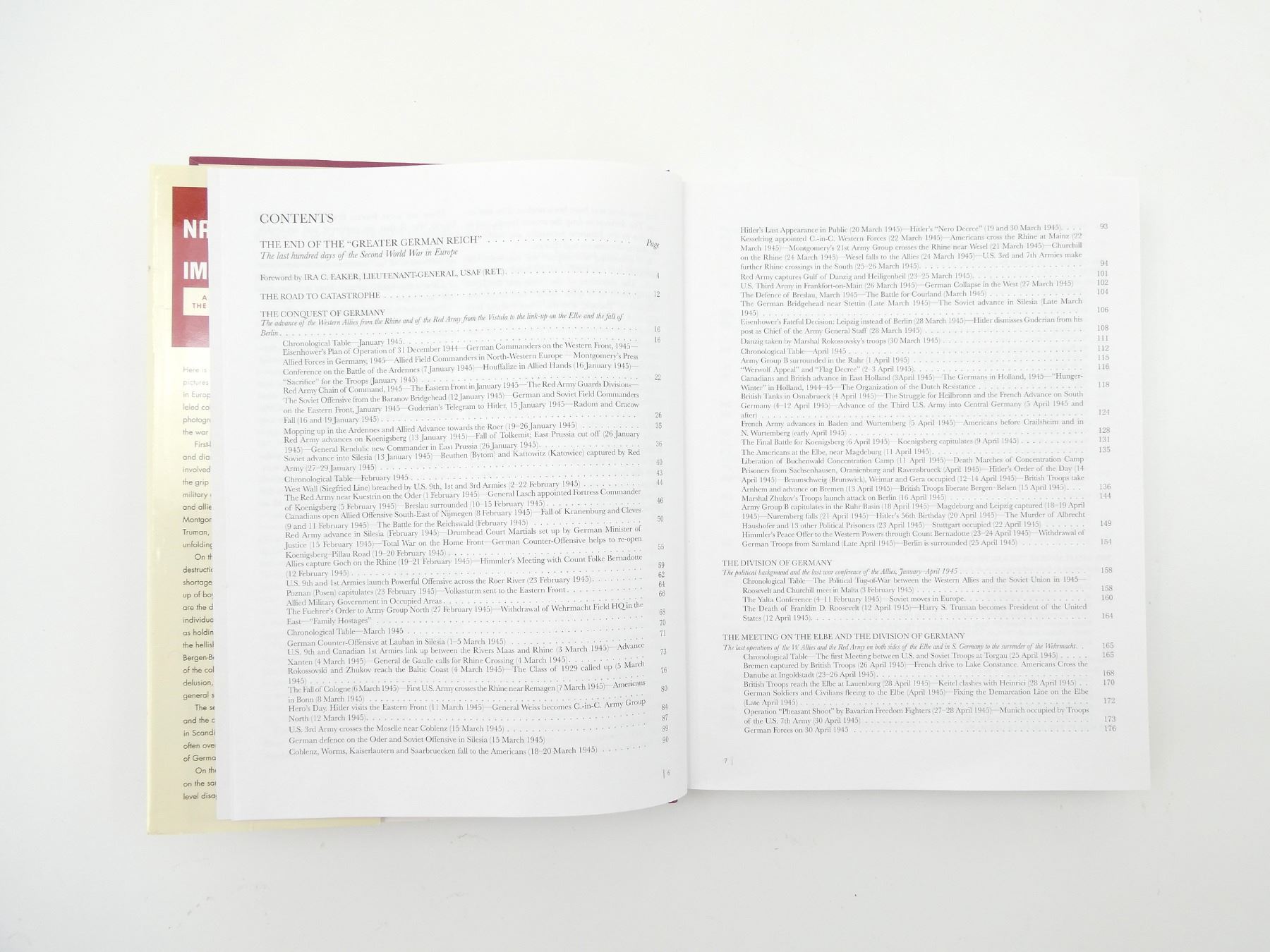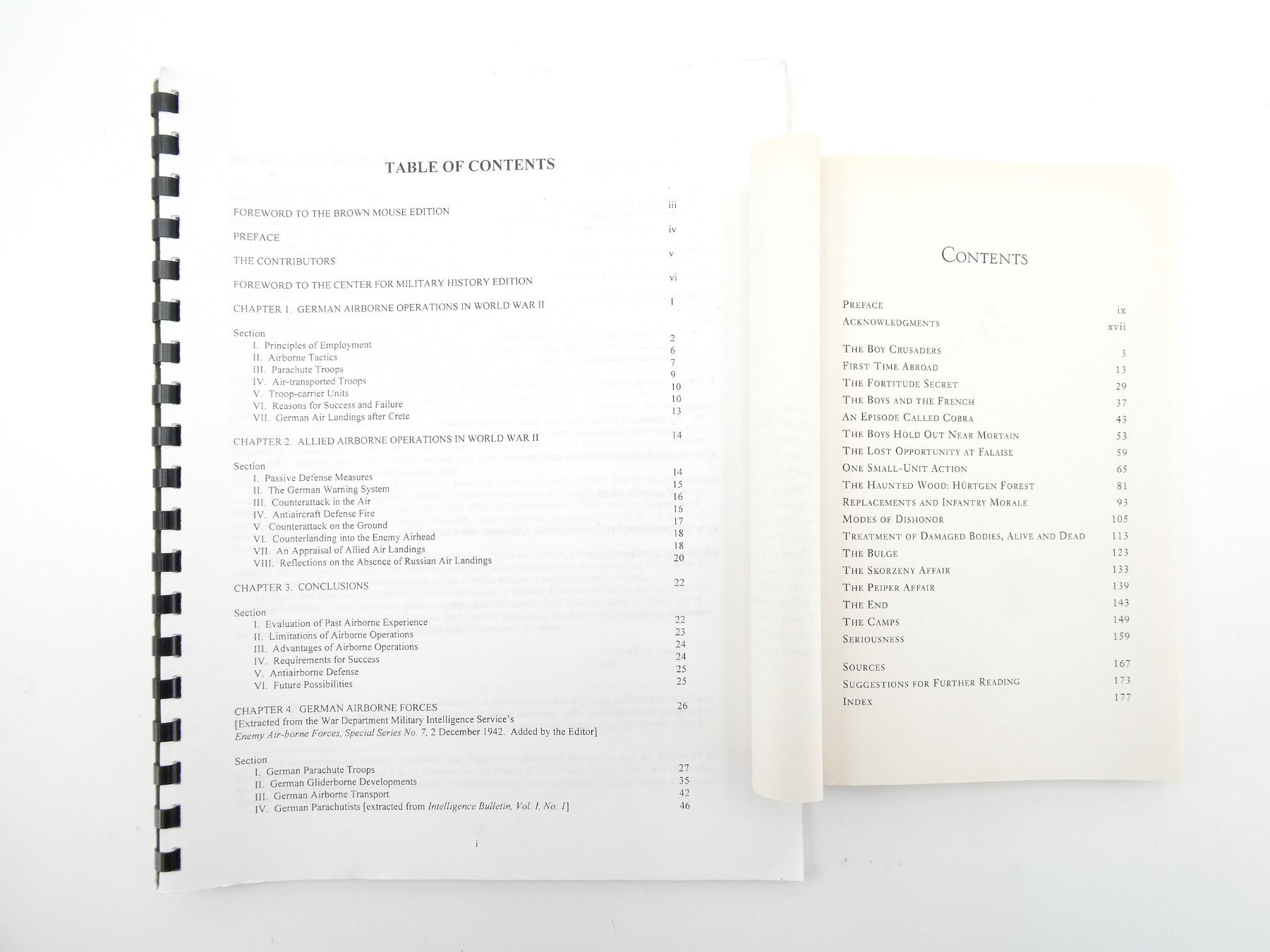 LOT INCLUDES; (1) "THE LAST DAYS OF NAZI GERMANY AND IMPERIAL JAPAN" BOOK BY HANS DOLLINGER, ISBN: 978-1-56852-726-0, (1) "AIRBORNE OPERATIONS, A GERMAN APPRAISAL" BOOK EDITED BY GORDON L. ROTTMAN AND LEROY WILSON, SOFT COVER, ISBN: 0-938570-02-1, (1) "THE EAGLE SQUADRONS, YANKS IN THE RAF 1940-1942" BOOK BY VERN HAUGHLAN, HARD COVER WITH DUST COVER, COPYRIGHT 1979, (1) "THE WOODEN HORSE, THE GREATEST ESCAPE STORY OF WORLD WAR II" BOOK BY ERIC WILLIAMS, HARD COVER, COPYRIGHT 1965, (1) "BLOODY AACHEN" BOOK BY CHARLES WHITING, HARD COVER WITH DUST COVER, ISBN: 0-8128-2090-3, (1) "THE BOYS' CRUSADE" BOOK BY PAUL FUSSELL, SOFT COVER, ISBN: 0-8129-7488-3 & (1) "MILITARY, RELIC, COLLECTORS REFERENCE BOOK AND CATALOG" BOOK BY WORLD WAR II PRODUCTS LTD, SOFT COVER, COPYRIGHT 1978. SEE PHOTOS.