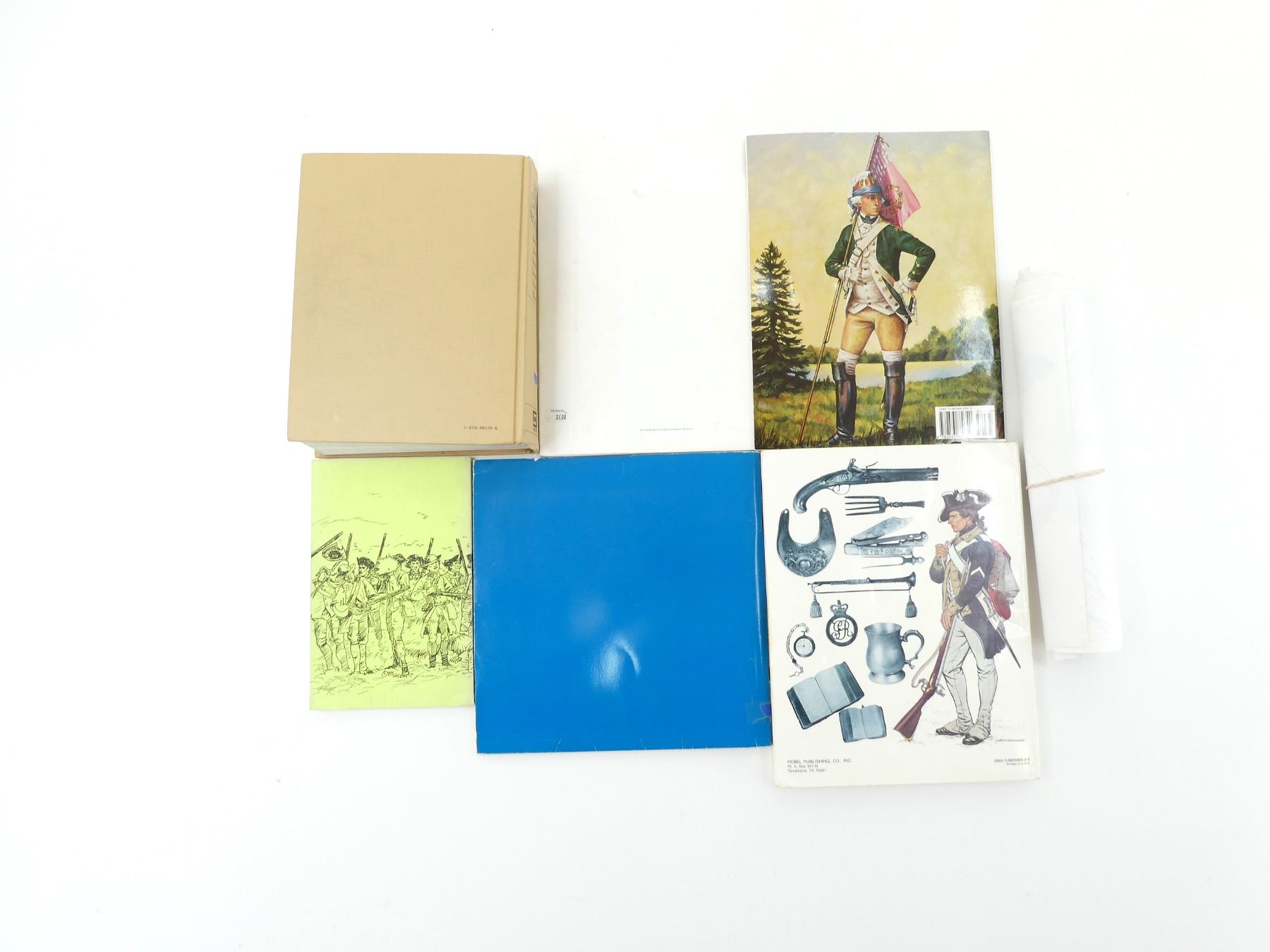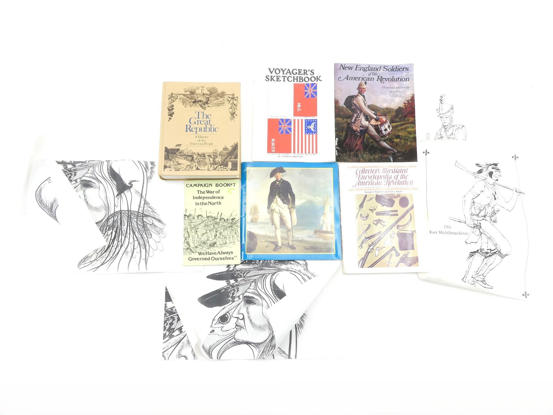 LOT INCLUDES; (1) "VOYAGER'S SKETCHBOOK" BOOK BY JAMES A. HANSON, SOFT COVER, COPYRIGHT 1981, (1) "THE GREAT REPUBLIC, A HISTORY OF THE AMERICAN PEOPLE" BOOK PUBLISHED BY D.C. HEATH AND COMPANY, HARD COVER, ISBN: 0-669-86629-6, (1) "NEW ENGLAND SOLDIERS OF THE AMERICAN REVOLUTION" BOOK BY BELLEROPHON BOOKS, SOFT COVER, ISBN: 0-88388-034-2, (1) "THE FIRST FLEET, AUSTRALIA'S HERITAGE IN STAMPS" BOOK COMPILED BY JO MONIE, SOFT COVER, ISBN: 0 642 11946 5, (1) "COLLECTOR'S ILLUSTRATED ENCYCLOPEDIA OF THE AMERICAN REVOLUTION" BOOK BY GEORGE C. NEUMANN & FRANK J. KRAVIC, SOFT COVER, ISBN: 0-9605666-8-6, (1) "THE WAR OF INDEPENDENCE IN THE NORTH CAMPAIGN BOOK #7" BOOK BY GREG NOVAK, SOFT COVER, COPYRIGHT 1990 & (12) ASSORTED NATIVE AMERICAN / SOLDIER PRINTS. SEE PHOTOS.