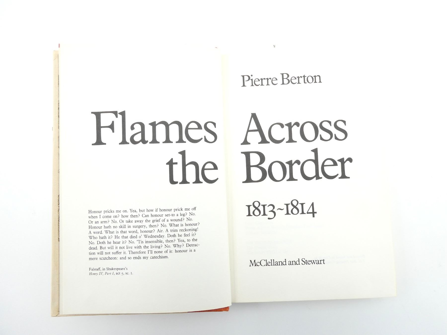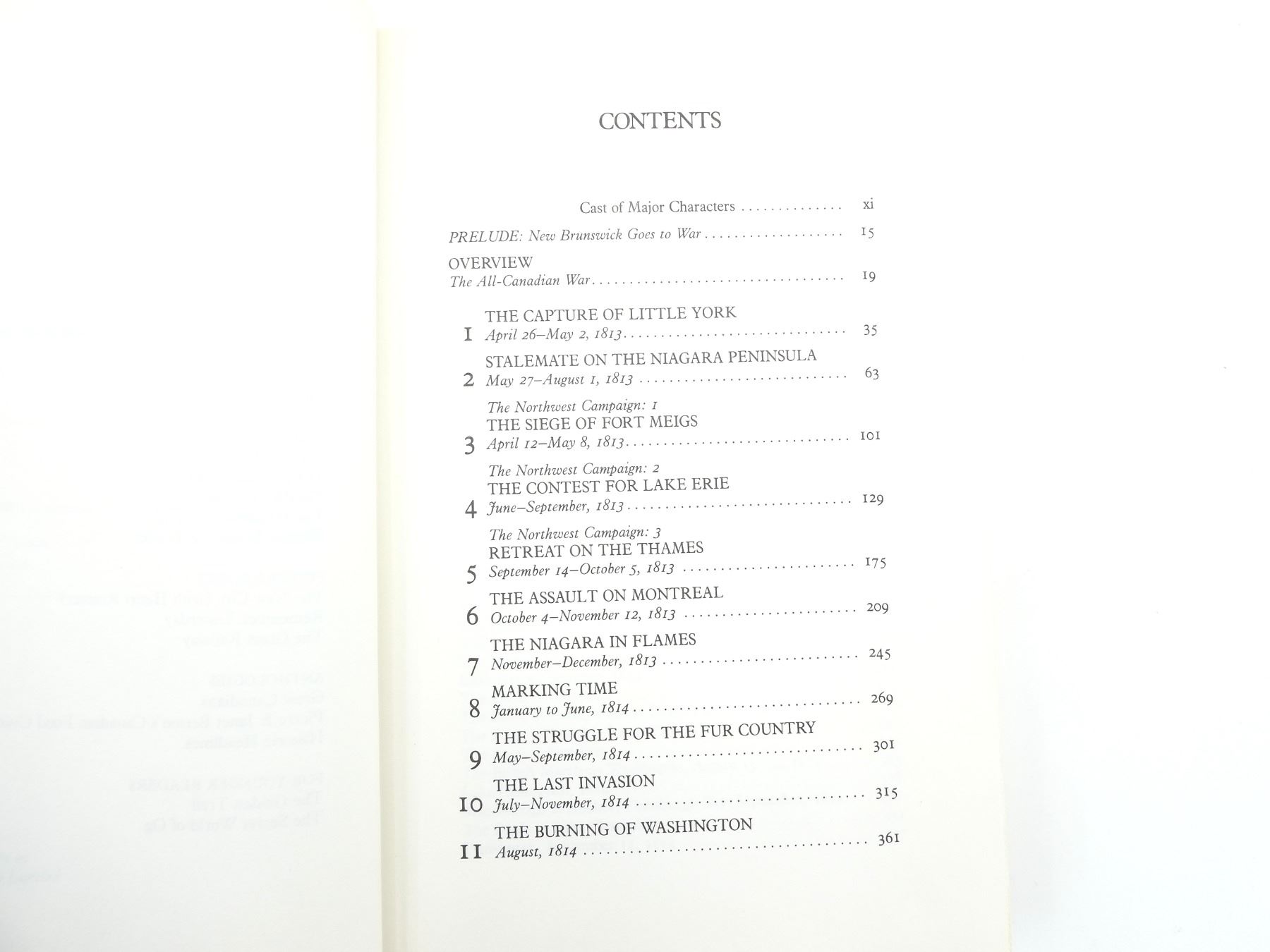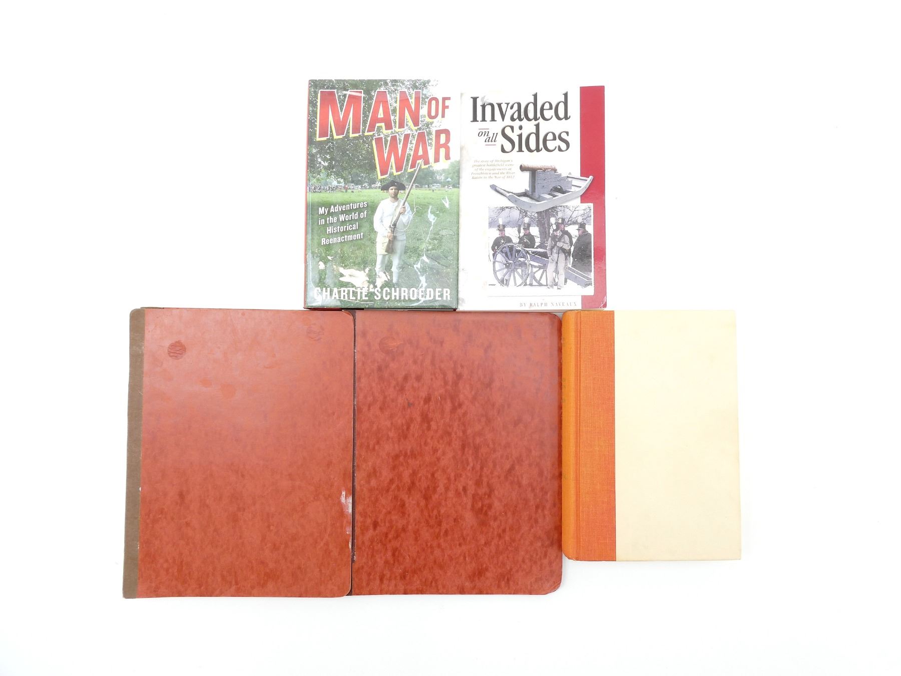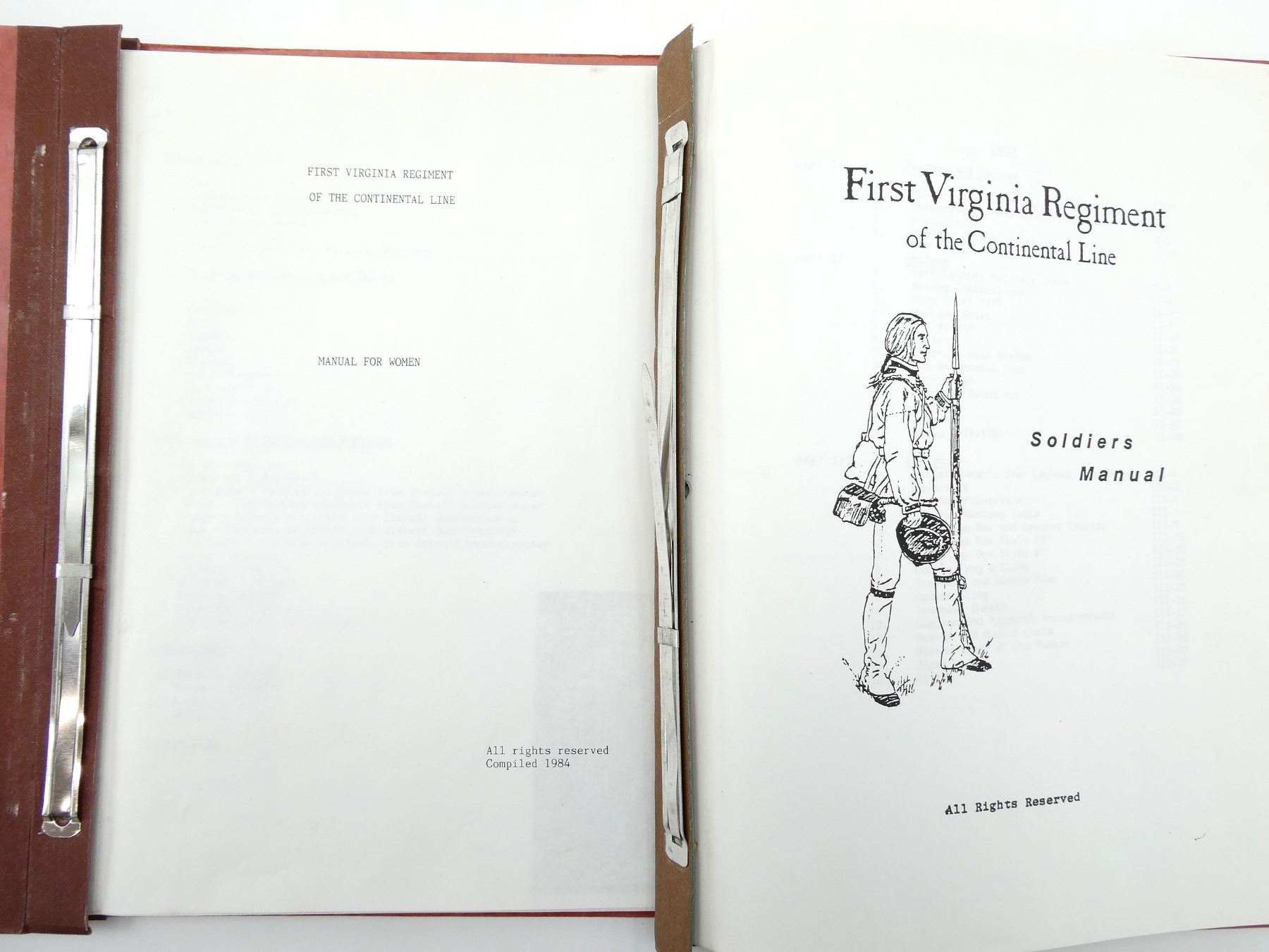 LOT INCLUDES; (1) "FIRST VIRGINIA REGIMENT OF THE CONTINENTAL LINE, SOLDIERS MANUAL", MANUAL CONTRIBUTORS CAROL DEAKIN/AL SAGUTO/DICK GRIFFITHS/CAL HURD/PAT BEAL/JIM GARNER/JEAN DANIELS/RICHARD CHIARIZIA/CHIP GNAM/JOHN VICTOR/BILL TOLBUT/BUTCH FOGLE/ TOM DEAKIN/BOB BOWSER/BRANT HEARTHINGTON, SOFT COVER BINDER, (1) "FIRST VIRGINIA REGIMENT OF THE CONTINENTAL LINE, MANUAL FOR WOMEN" MANUAL EDITED BY P.K. BEAL, COMPILED 1984, (1) "FLAMES ACROSS THE BORDER 1813-1814" BOOK BY PIERRE BERTON, HARD COVER, ISBN: 0-7710-1246-2, (1) "MAN OF WAR" BOOK BY CHARLIE SCHROEDER, HARD COVER WITH DUST COVER, ISBN: 978-1-59463-091-0 & (1) "INVADED ON ALL SIDES" BOOK BY RALPH NAVEAUX, SOFT COVER, ISBN: 978-0-615-21938-7. SEE PHOTOS.