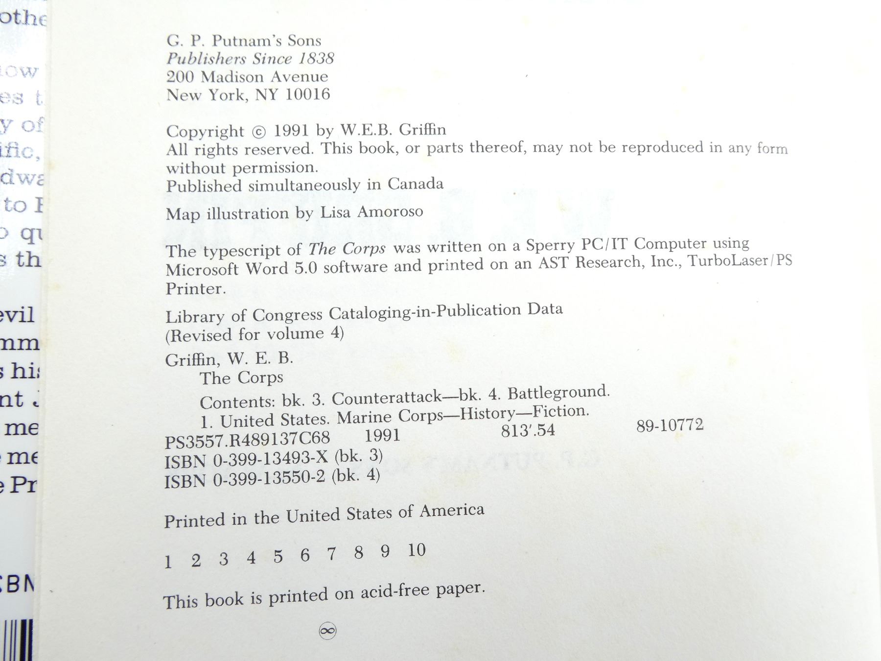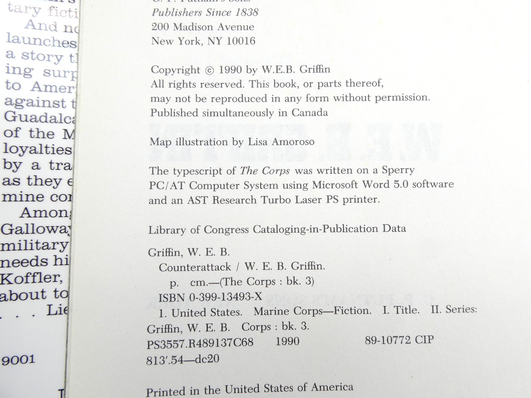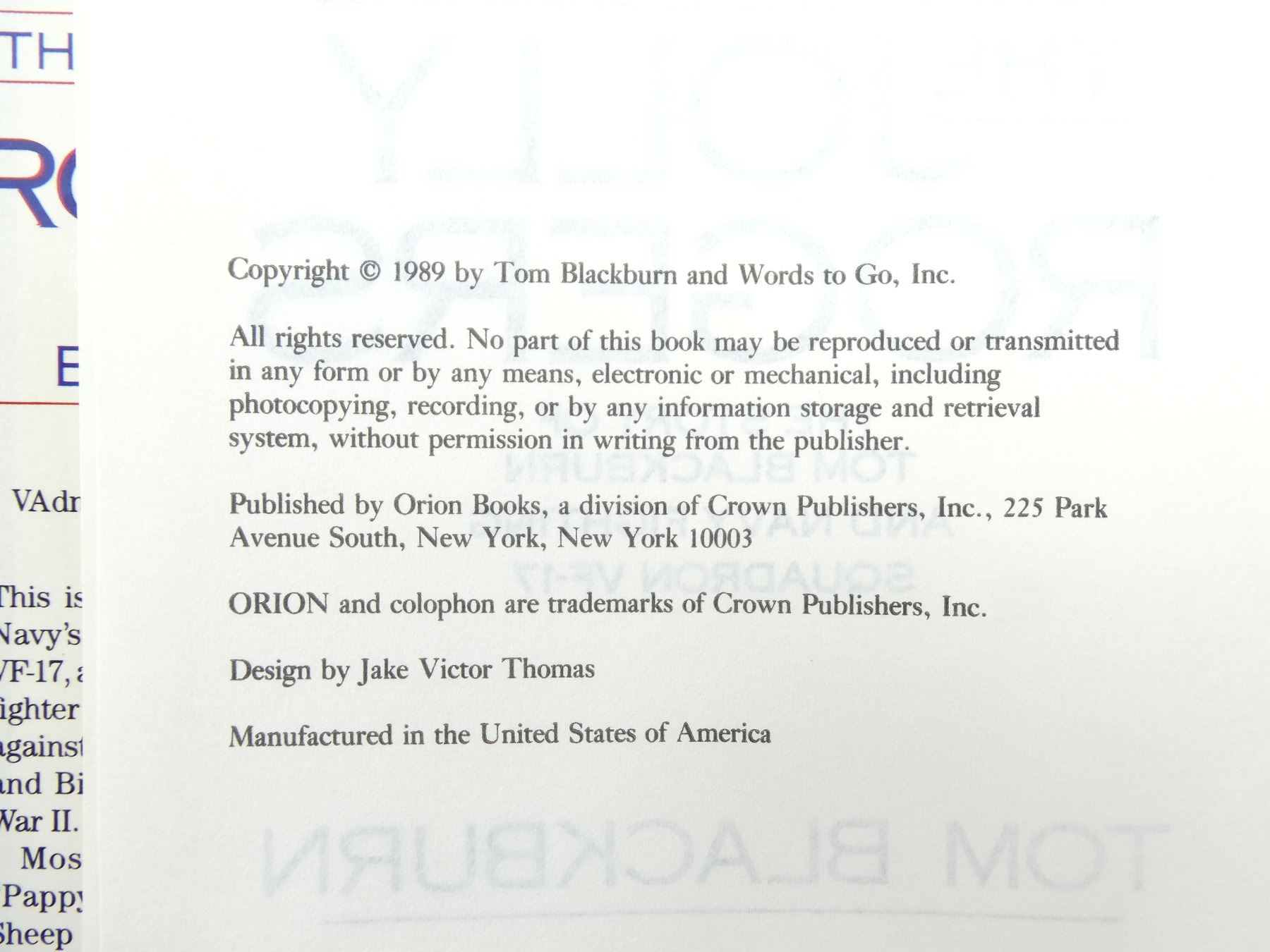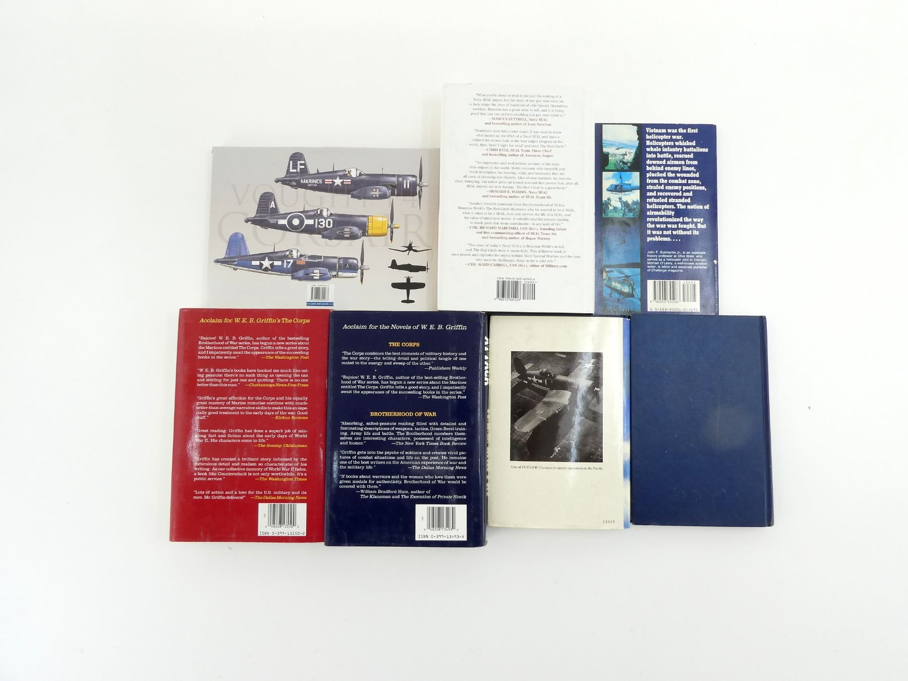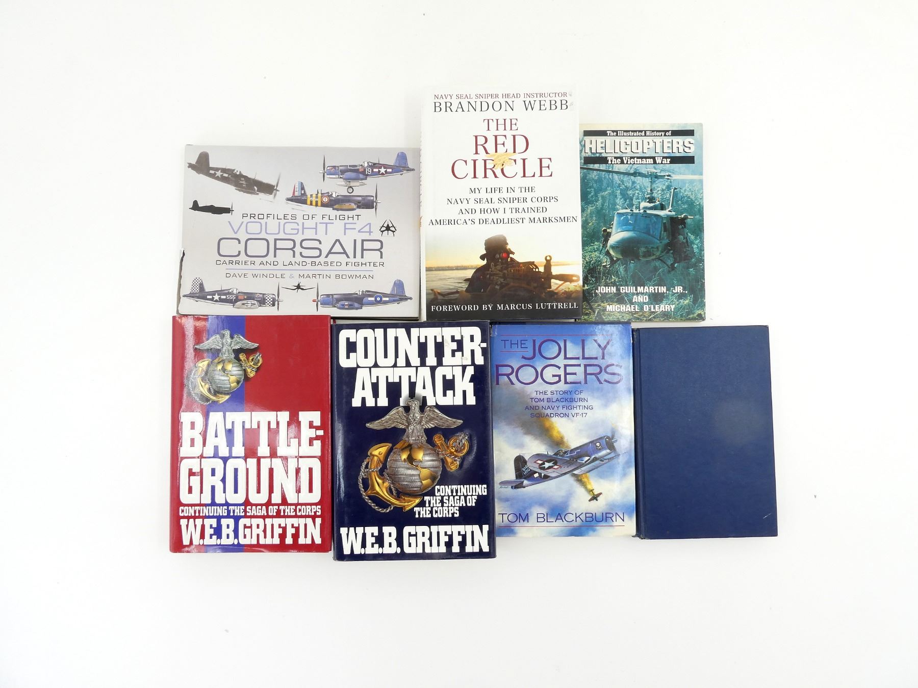 LOT INCLUDES; (1) "COUNTER-ATTACK, BOOK III OF THE CORPS" BOOK BY W.E.B. GRIFFIN, HARD COVER WITH DUST COVER, ISBN: 0-399-13493-X, (1) "BATTLE GROUND CONTINUING THE SAGA OF THE CORPS" BOOK BY W.E.B. GRIFFIN, HARD COVER WITH DUST COVER, ISBN: 0399-13550-2, (1) "PROFILES OF FLIGHT VOUGHT F4 CORSAIR" BOOK BY DAVE WINDLE AND MARTIN BOWMAN, HARD COVER WITH DUST COVER, ISBN: 978 1 84884 408 7, (1) "THE RED CIRCLE" BOOK BY BRANDON WEBB WITH JOHN DAVID MANN, HARD COVER WITH DUST COVER, ISBN: 978-0-312-60422-6, (1) "THE JOLLY ROGERS, THE STORY OF TOM BLACKBURN AND NAVY FIGHTING SQUADRON VF-17" BOOK BY TOM BLACKBURN, HARD COVER WITH DUST COVER, COPYRIGHT 1989, (1) "BLUE SKIES AND BLOOD, THE BATTLE OF THE CORAL SEA" BOOK BY EDWIN P. HOYT, HARD COVER, COPYRIGHT 1975 & (1) "THE ILLUSTRATED HISTORY OF THE VIETNAM WAR, HELICOPTERS" BOOK BY JOHN GUILMARTIN JR AND MICHAEL O'LEARY, SOFT COVER, ISBN: 0-553-34506-0. SEE PHOTOS.