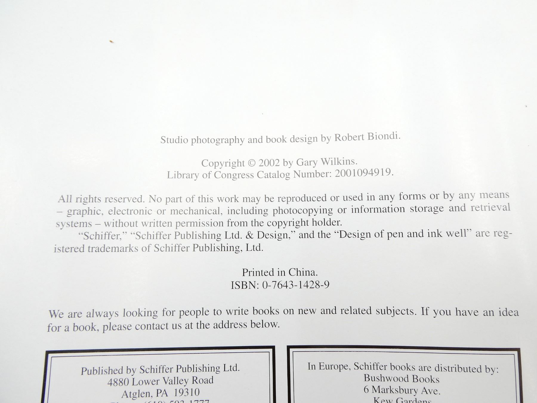 (1) BY GARY WILKINS, HARD COVER WITH DUST COVER, ISBN: 0-7643-1428-9. SEE PHOTOS.