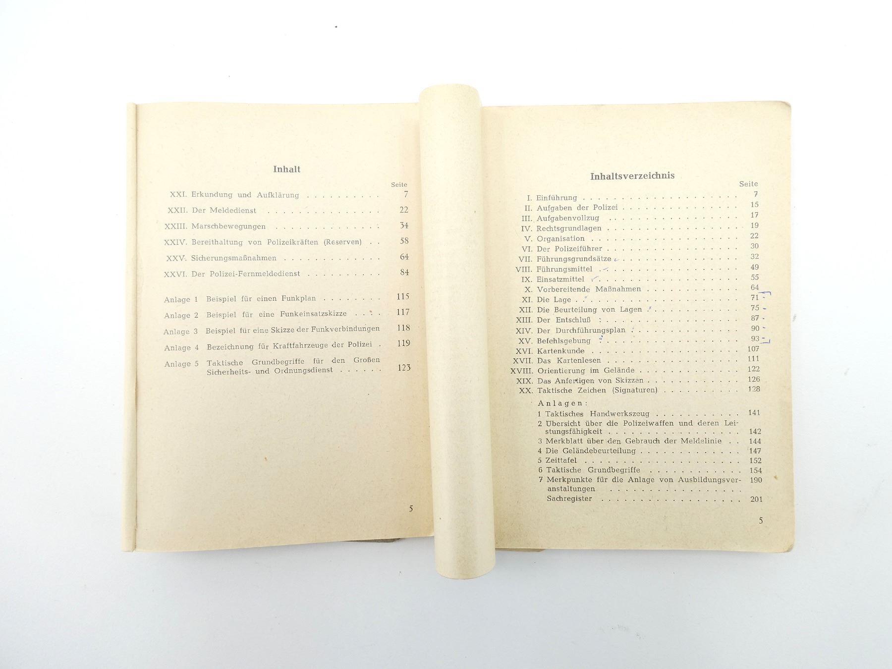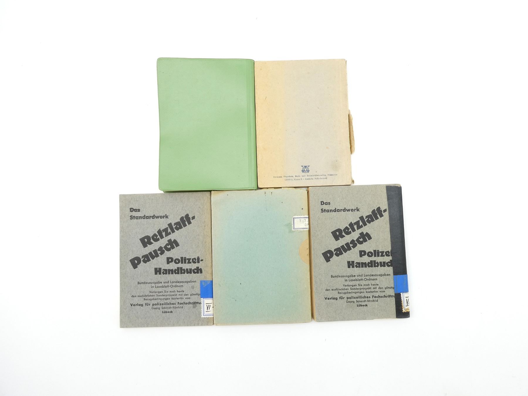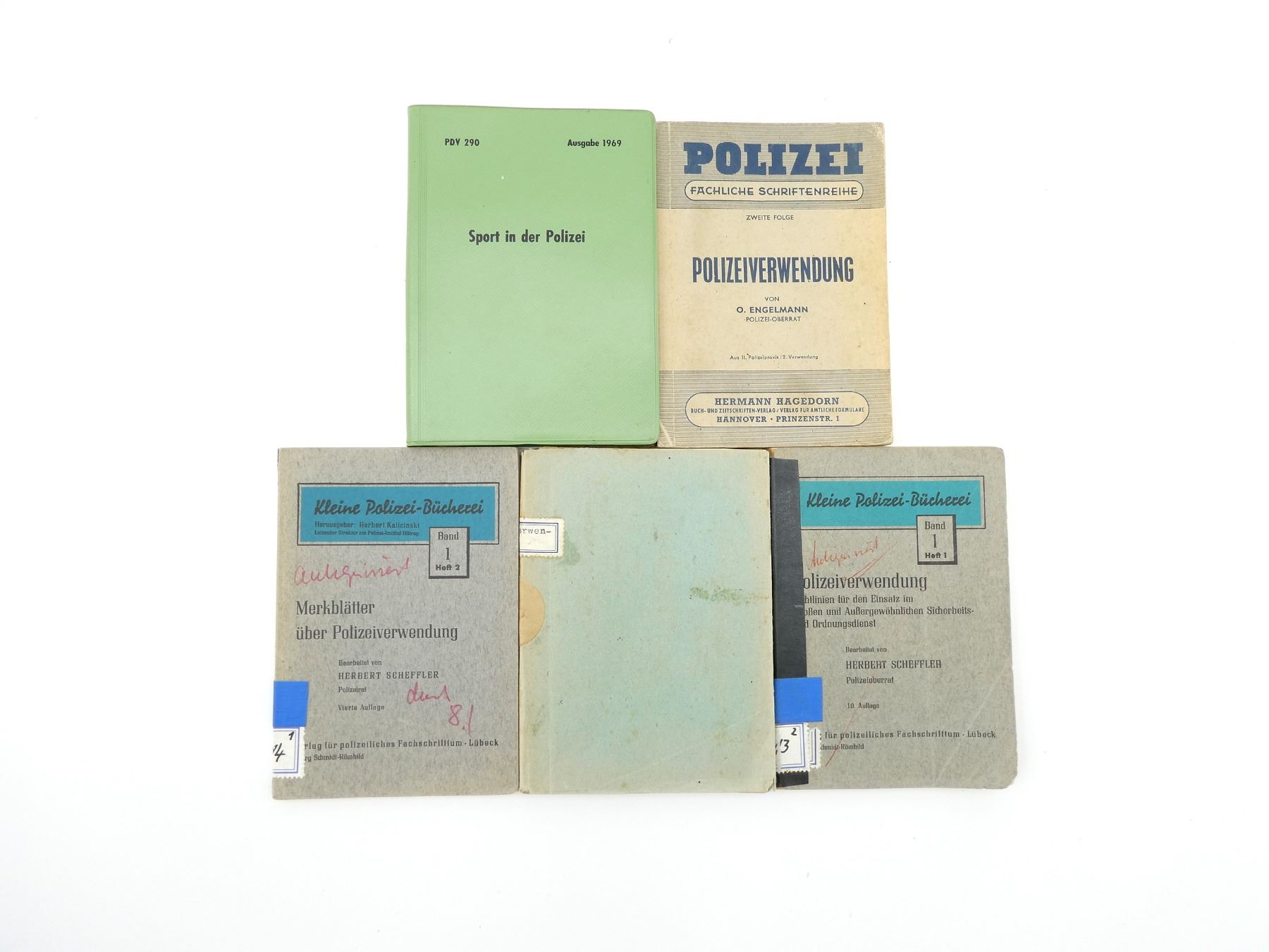 ALL IN GERMAN, ALL SOFT COVERS, INCLUDES; (1) "PDV 290, SPORT IN DER POLIZEI" HANDBOOK, 1969 EDITION, (1) "POLIZEIVERWENDUNG, KLEINE POLIZEI BUCHEREI, BAND 1 HEFT 1" HANDBOOK, EDITED BY HERBERT SCHEFFLER, 10TH EDITION, 1965, (1) "MERKBLATTER UBER POLIZEIVERWENDUNG, KLEINE POLIZEI BUCHEREI, BAND 1 HEFT 2" HANDBOOK, EDITED BY HERBERT SCHEFFLER, 4TH EDITION, 1961, (1) "POLIZEIVERWENDUNG, POLIZEI FACHLICHE SCHRIFTENREIHE" HANDBOOK BY O. ENGELMANN, 2ND ISSUE, COPYRIGHT / ISBN UNKNOWN & (1) "POLIZEIVERWENDUNG, POLIZEI FACHLICHE SCHRIFTENREIHE" HANDBOOK BY O. ENGELMANN, 2ND ISSUE, 2ND REVISED EDITION, COPYRIGHT / ISBN UNKNOWN. SEE PHOTOS.