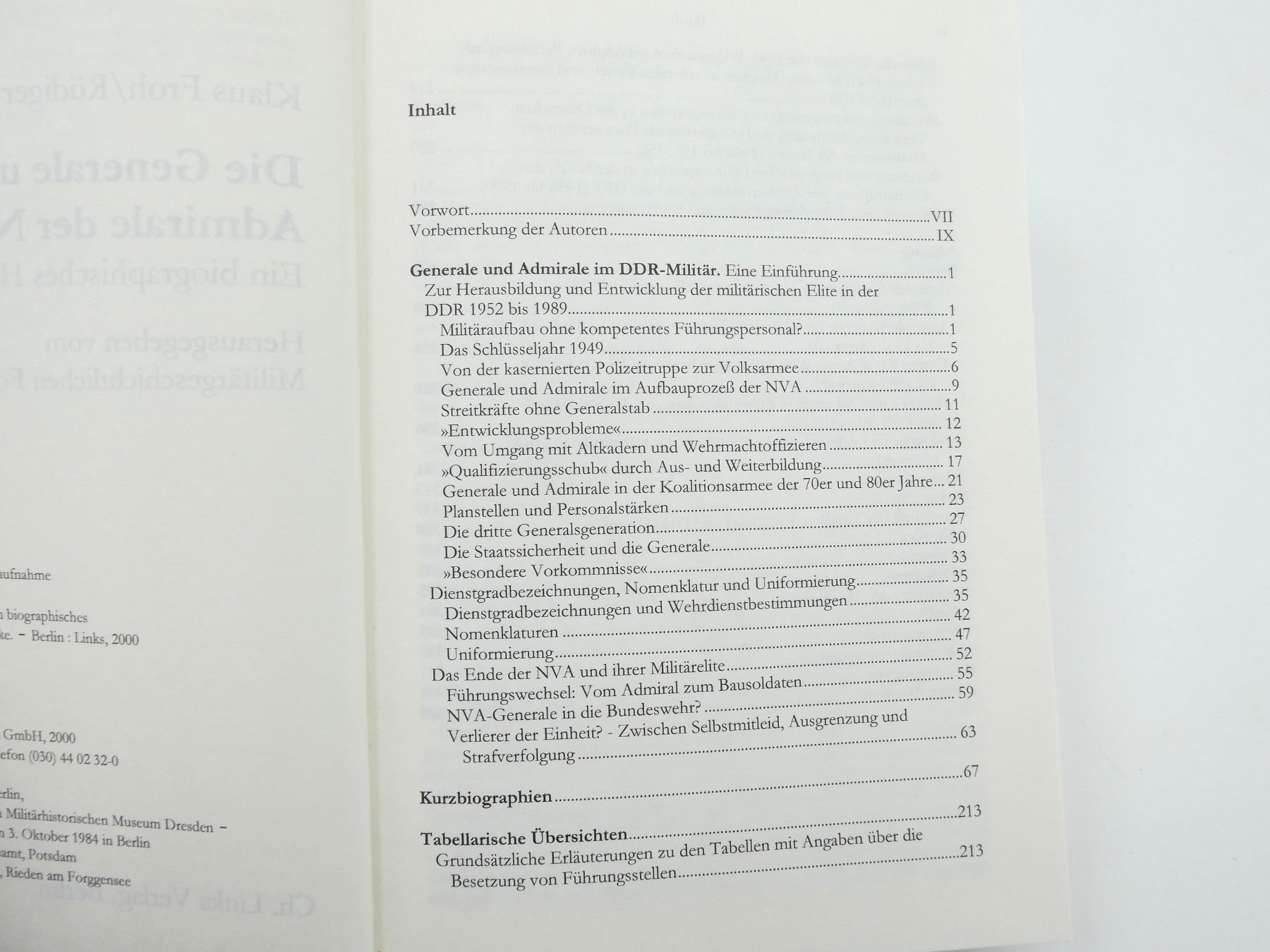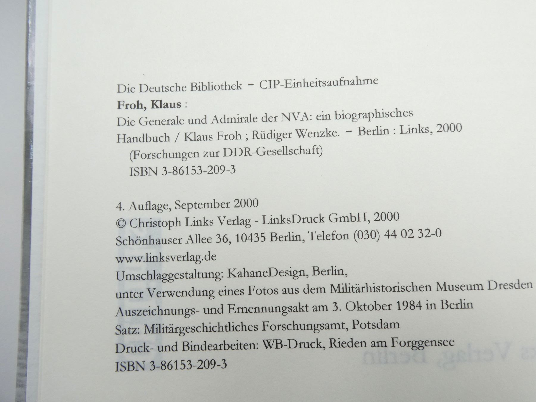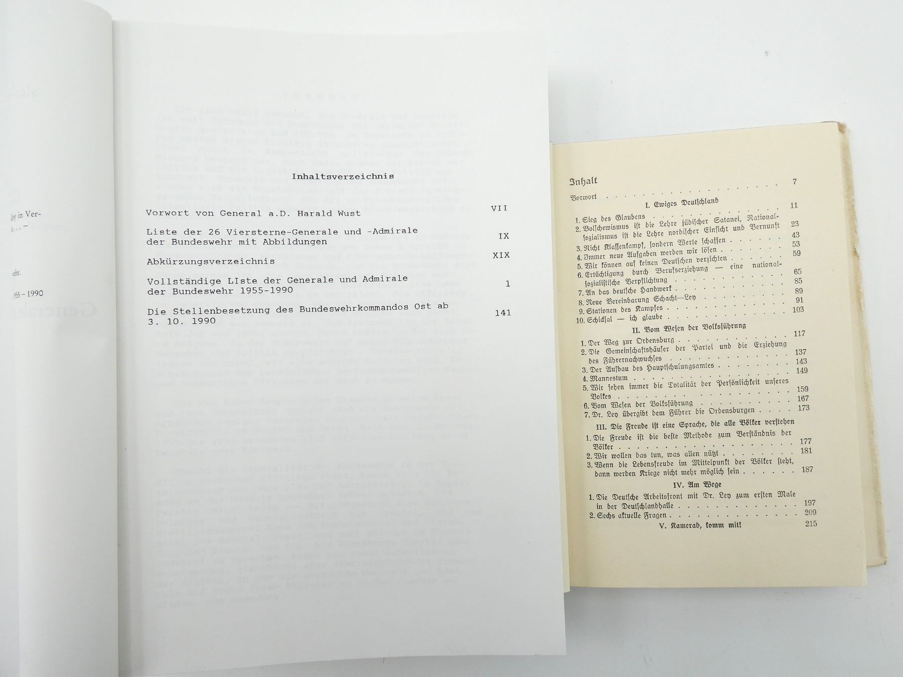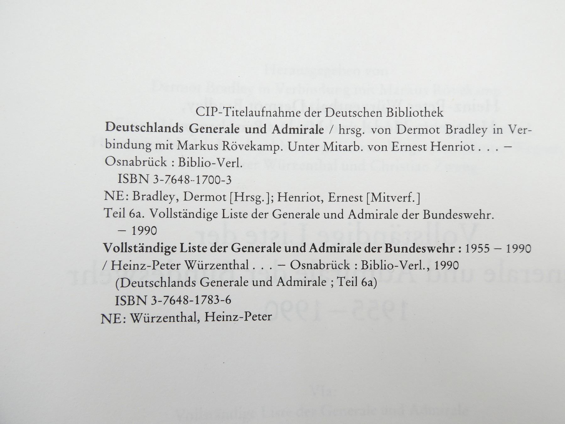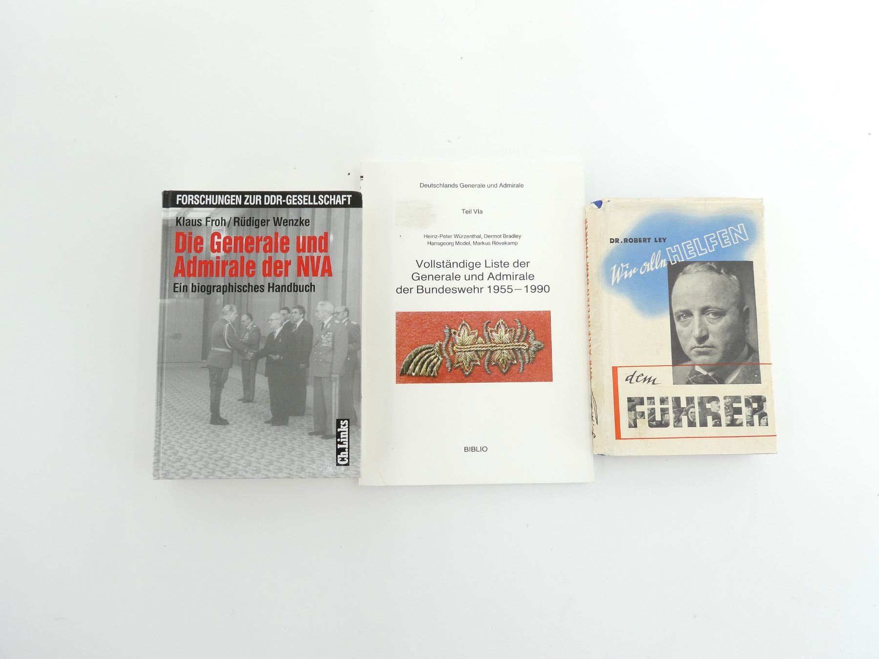 LOT INCLUDES; (1) "VOLLSTANDIGE LISTE DER GENERALE UND ADMIRALE DER BUNDESWEHR 1955-1990" BOOK EDITED BY HEINZ-PETER WURZENTHAL, DERMOT BRADLEY, HANSGEORG MODEL, MARKUS ROVEKAMP, IN GERMAN, SOFT COVER, ISBN: 3-7648-1700-3, (1) "DIE GENERALE UND ADMIRALE DER NVA, EIN BIOGRAPHISCHES HANDBUCH" BOOK BY KLAUS FROH / RUDIGER WENZKE, IN GERMAN, HARD COVER, ISBN: 3-86153-209-3 & (1) "WIR ALLE HELFEN DEM FUHRER" BOOK BY DR. ROBERT LEY, IN GERMAN, HARD COVER WITH DUST COVER, COPYRIGHT 1987. SEE PHOTOS.