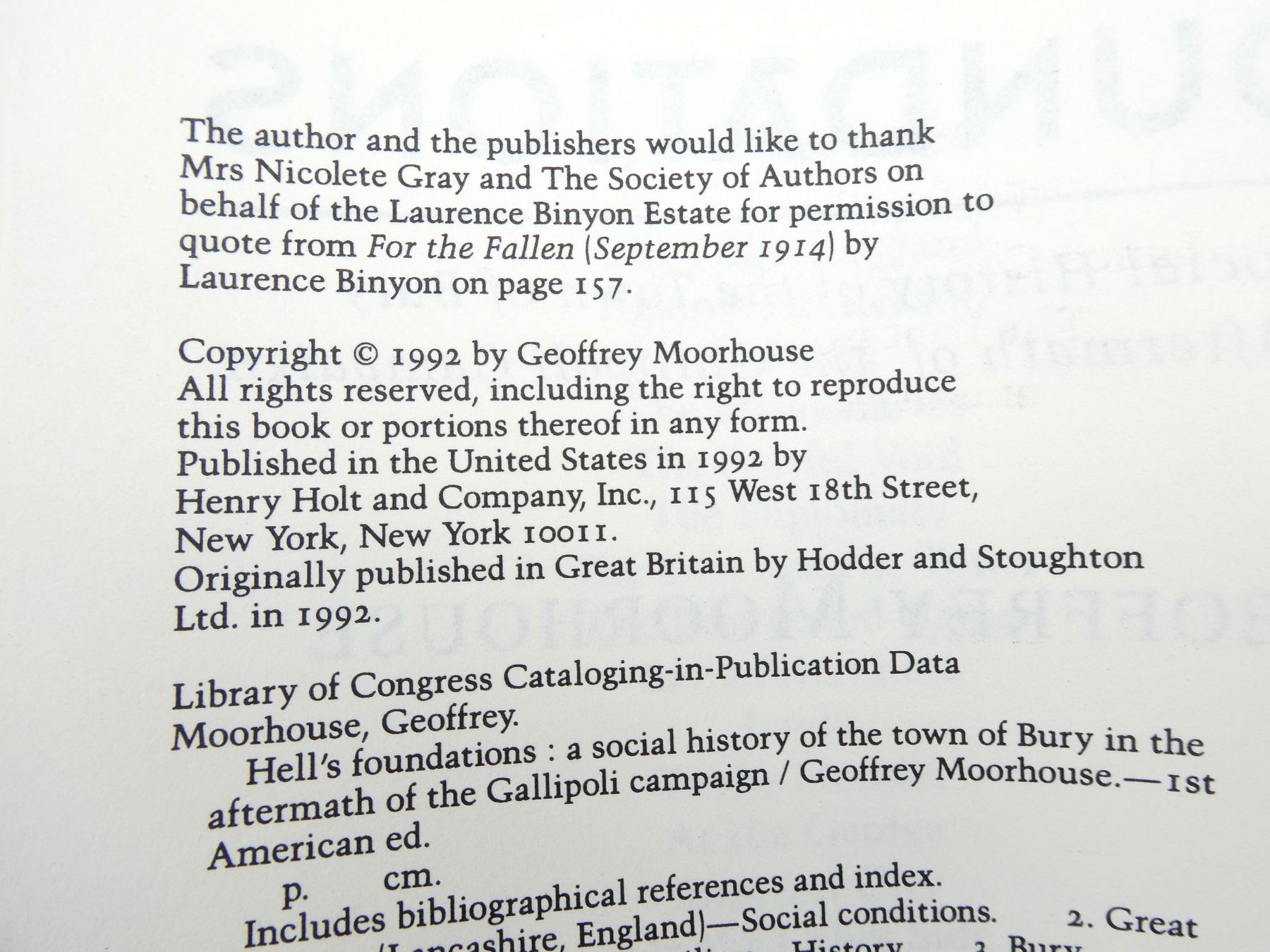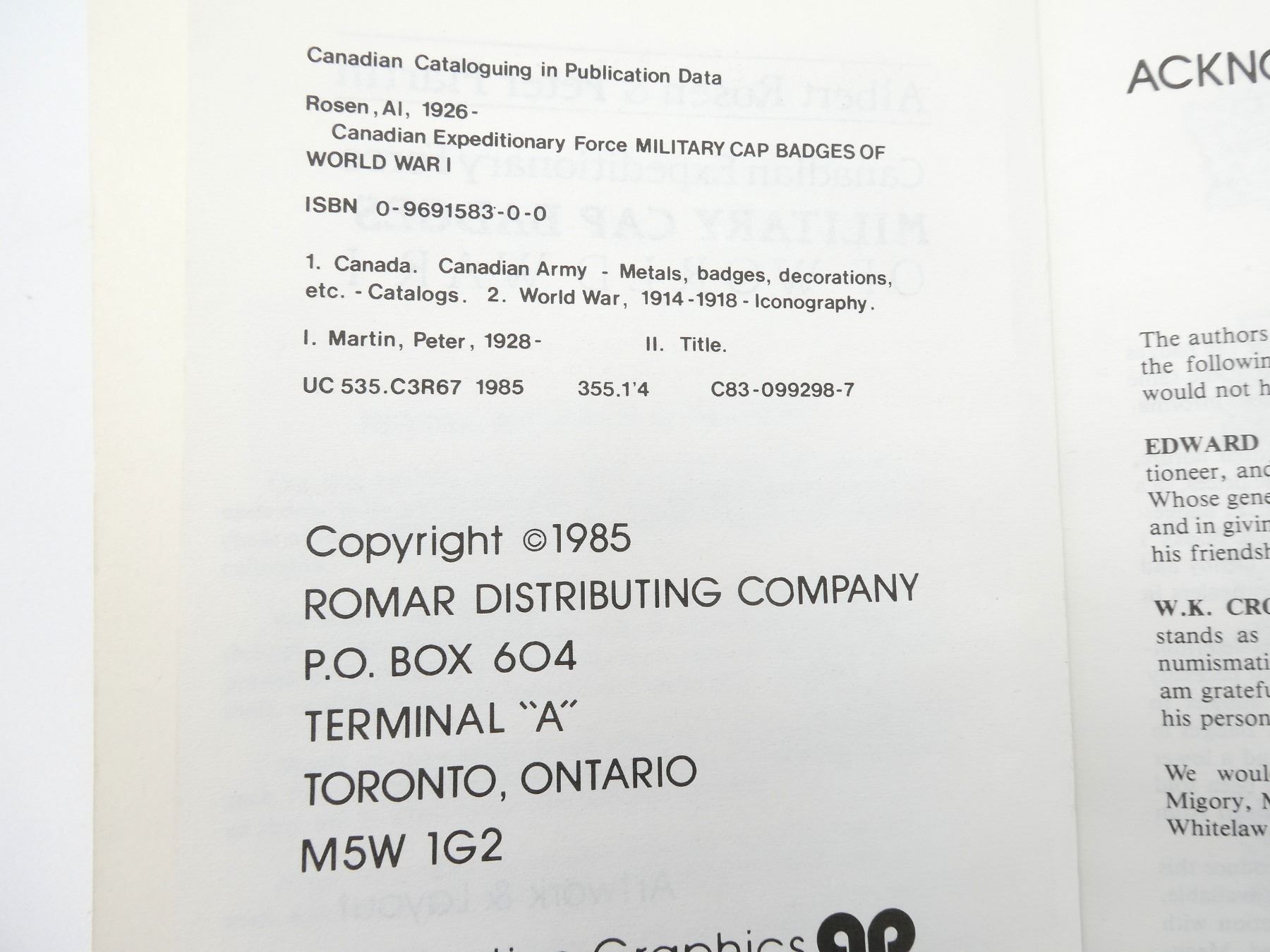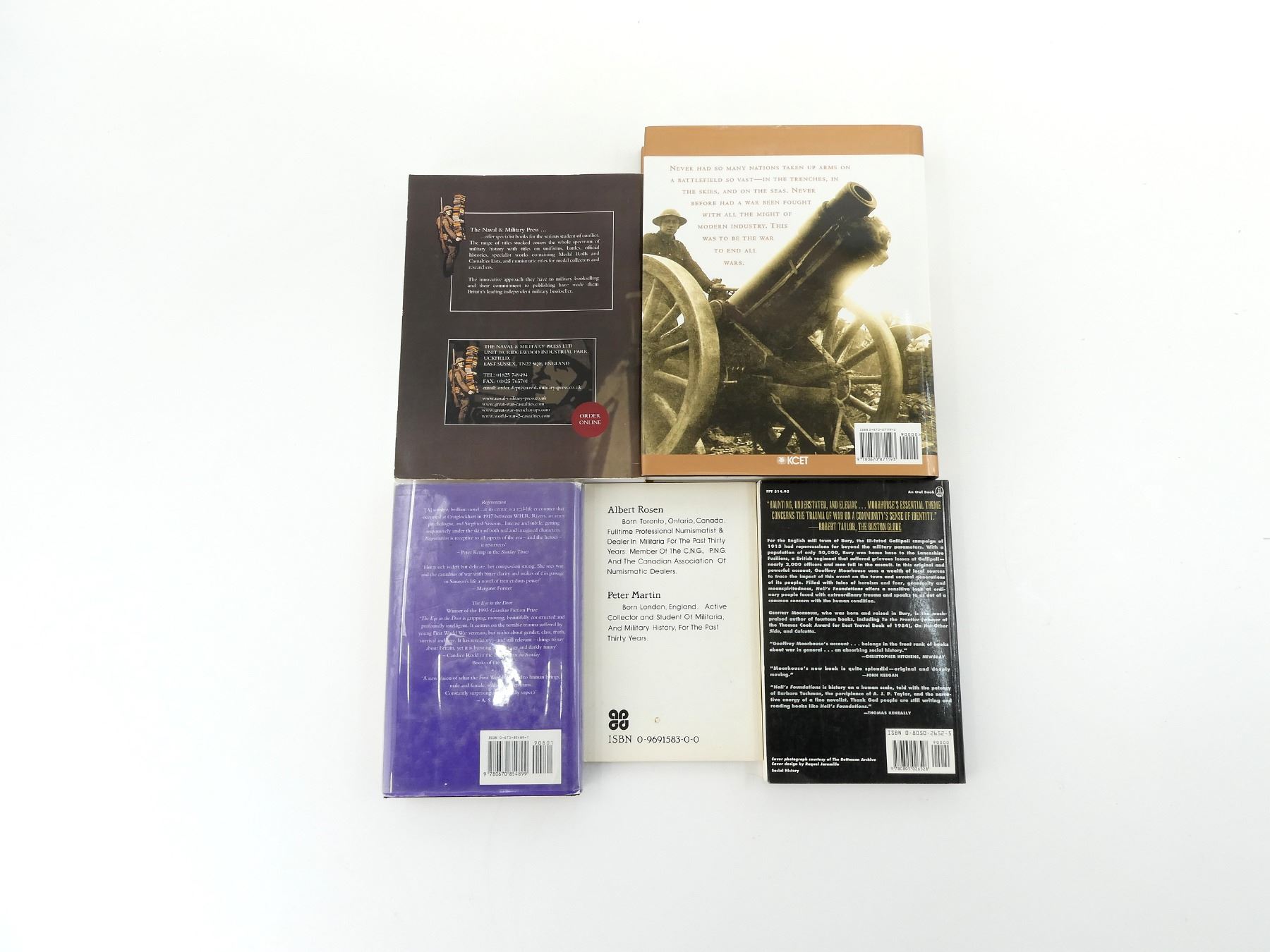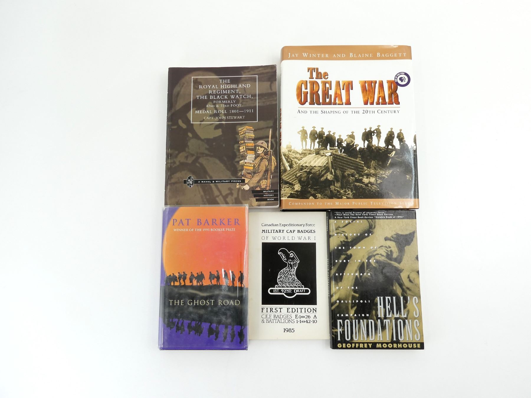LOT INCLUDES; (1) "THE GREAT WAR AND THE SHAPING OF THE 20TH CENTURY" BOOK BY JAY WINTER & BLAINE BAGGETT, HARD COVER WITH DUST COVER, ISBN: 0-670-87119-2, (1) "THE ROYAL HIGHLAND REGIMENT, THE BLACK WATCH, FORMERLY 42ND & 73RD FOOT, MEDAL ROLL 1801-1911" BOOK, SOFT COVER, DATED 1913 (REPRINT), (1) "THE GHOST ROAD" BOOK BY PAT BARKER, HARD COVER WITH DUST COVER, ISBN: 0-670-85489-1, (1) "HELL'S FOUNDATIONS, A SOCIAL HISTORY OF THE TOWN OF BURY IN THE AFTERMATH OF THE GALLIPOLI CAMPAIGN" BOOK BY GEOFFREY MOO-RHOUSE, SOFT COVER, ISBN: 0-8050-1768-2 & (1) "CANADIAN EXPEDITIONARY FORCE MILITARY CAP BADGES OF WORLD WAR I" BOOK BY ALBERT ROSEN & PETER MARTIN, FIRST EDITION, SOFT COVER, ISBN: 0-9691583-0-0. SEE PHOTOS.