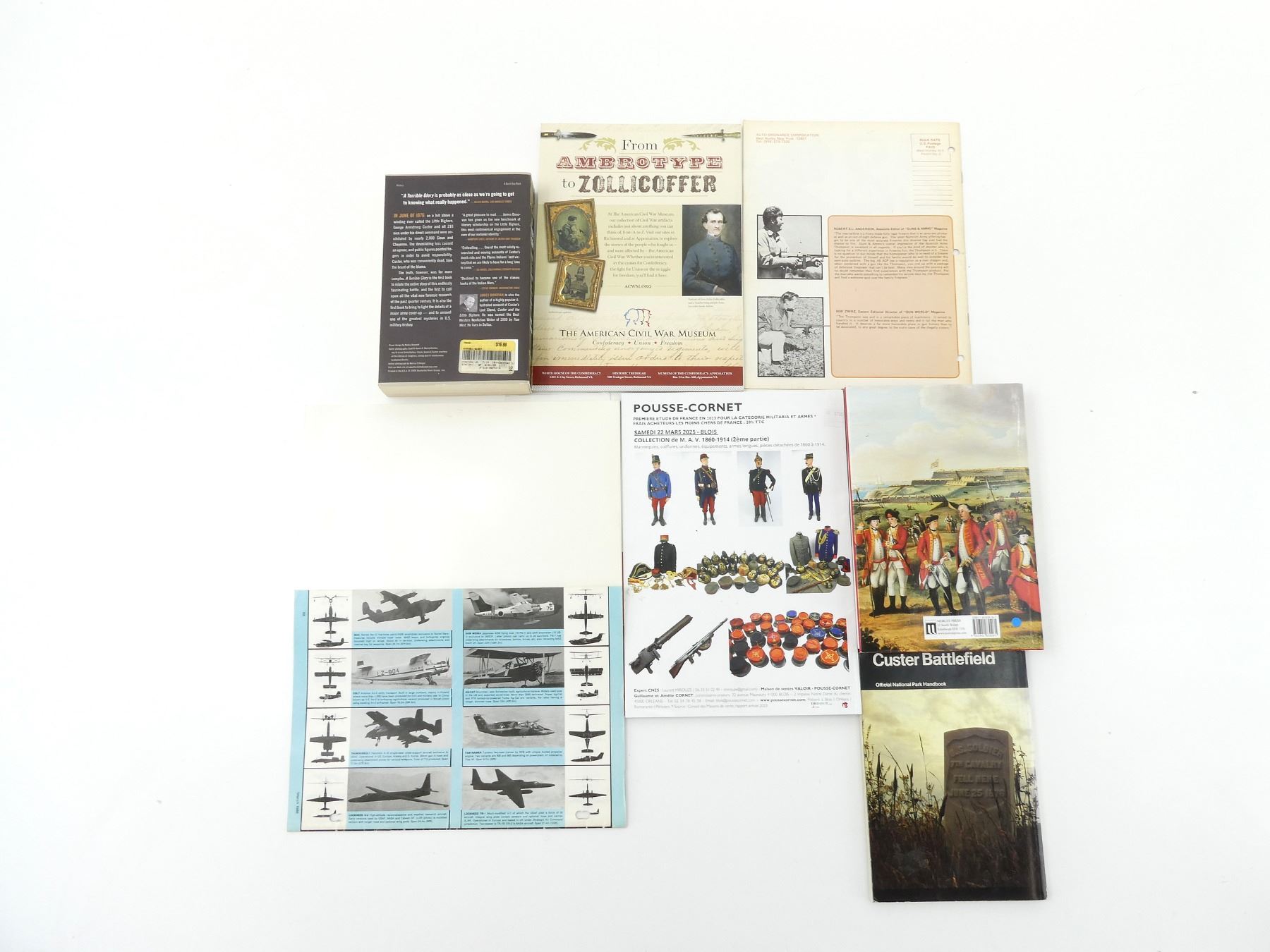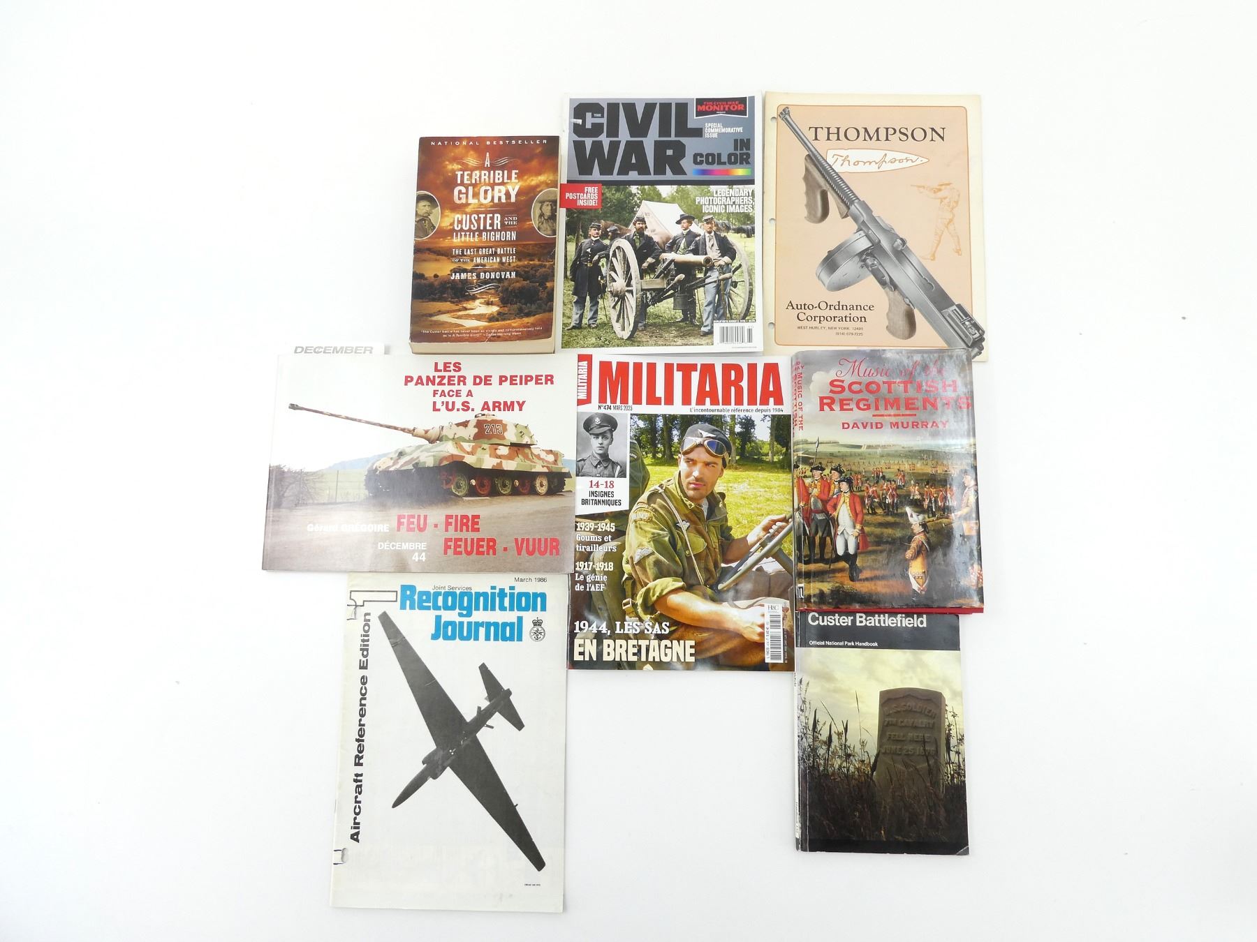 LOT INCLUDES; (1) "LES PANZER DE PEIPER FACE A L'U.S. ARMY" BOOK BY GERARD GREGOIRE, SOFT COVER, COPYRIGHT / ISBN UNKNOWN, (1) "RECOGNITION JOURNAL, AIRCRAFT REFERENCE EDITION" MAGAZINE / BOOKLET, SOFT COVER, MARCH 1986 VOL. 41 NO. 3, (1) "MILITARIA" MAGAZINE, IN FRENCH, SOFT COVER, NO. 474 MARCH 2025, (1) "THOMPSON, AUTO-ORDNANCE CORPORATION" MAGAZINE / CATALOGUE, SOFT COVER, COPYRIGHT UNKNOWN, (1) "THE CIVIL WAR MONITOR, THE CIVIL WAR IN COLOUR" MAGAZINE, AUGUST 2016, (1) "MUSIC OF THE SCOTTISH REGIMENTS" BOOK BY DAVID MURRAY, HARD COVER WITH DUST COVER, ISBN: 1-841830-26-7, (1) "CLUSTER BATTLEFIELD" HANDBOOK 132 BY ROBERT M. UTLEY, SOFT COVER, ISBN: 0-912627-34-4 & (1) "A TERRIBLE GLORY, CLUSTER AND THE LITTLE BIGHORN" BOOK BY JAMES DONOVAN, SOFT COVER, ISBN: 978-0-316-06747-8. SEE PHOTOS.