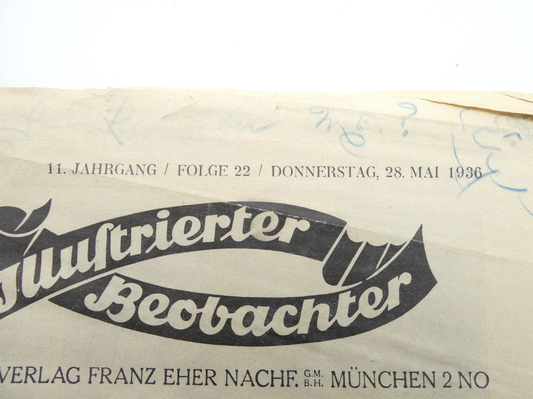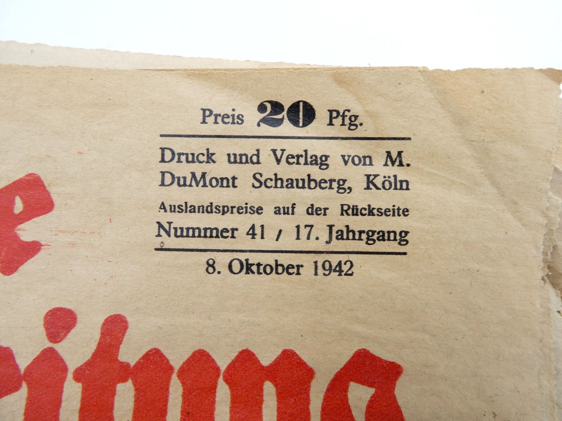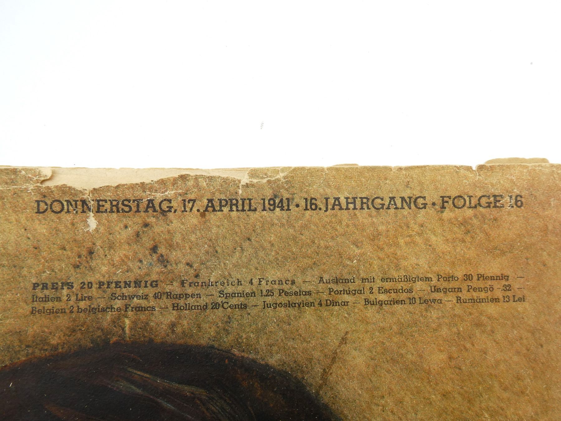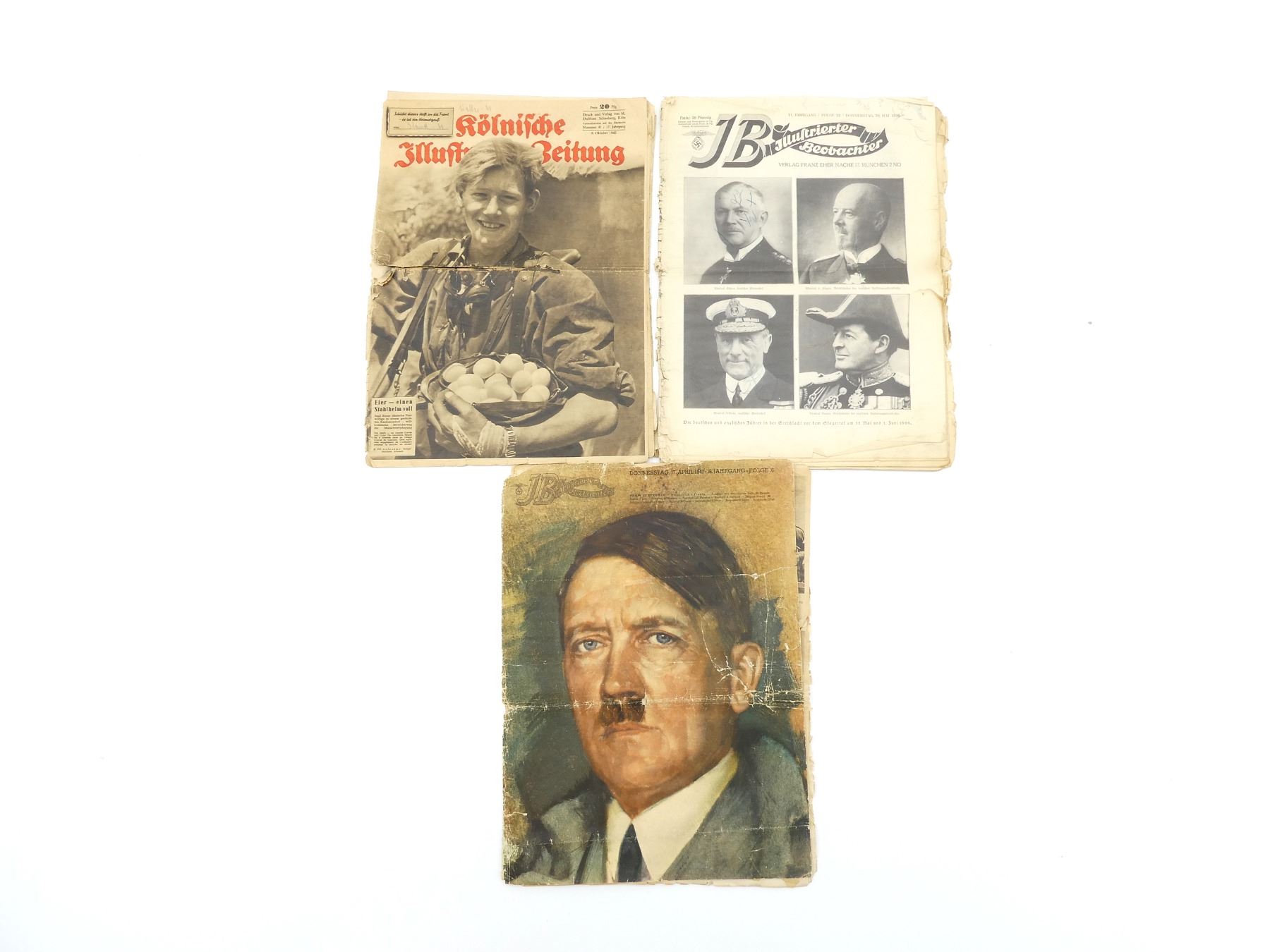 LOT INCLUDES; (3) GERMAN MAGAZINES, ONE APPEARS COMPLETE DATED 28 MAY 1936, TWO APPEAR PARTIAL DATED 8 OKTOBER 1942 & 1941, ALL SHOW AGE / WEAR / TEAR. SEE PHOTOS.