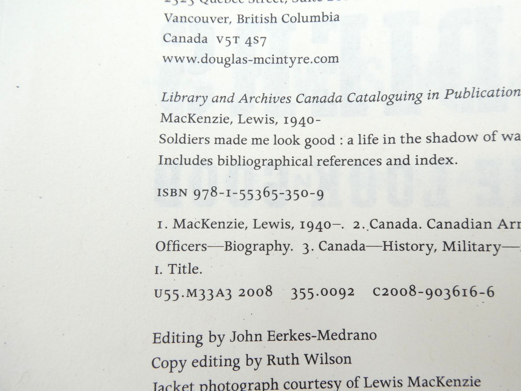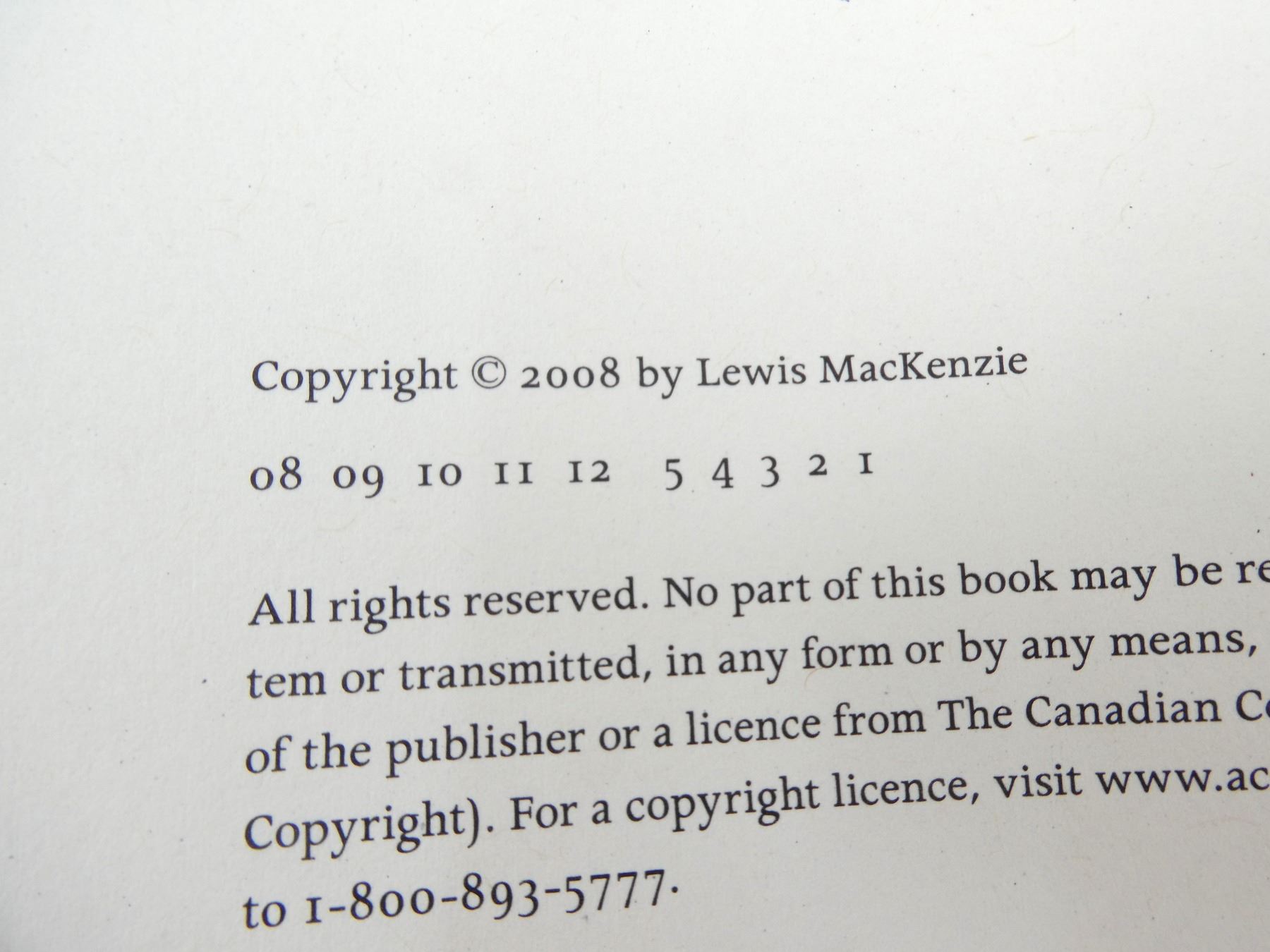 (1) BY LEWIS MACKENZIE, HARD COVER WITH DUST COVER, ISBN: 978-1-55365-350-9. SEE PHOTOS.