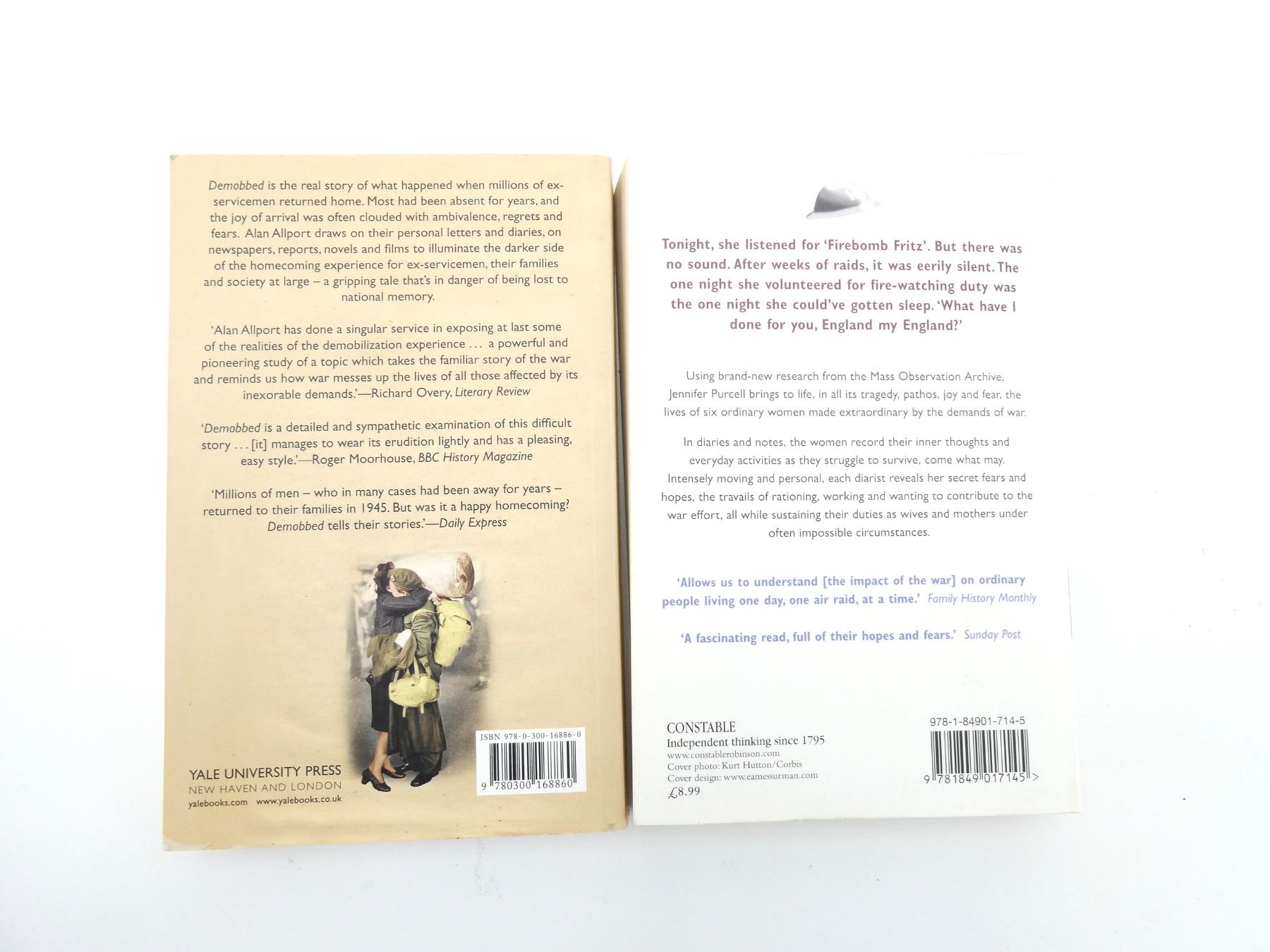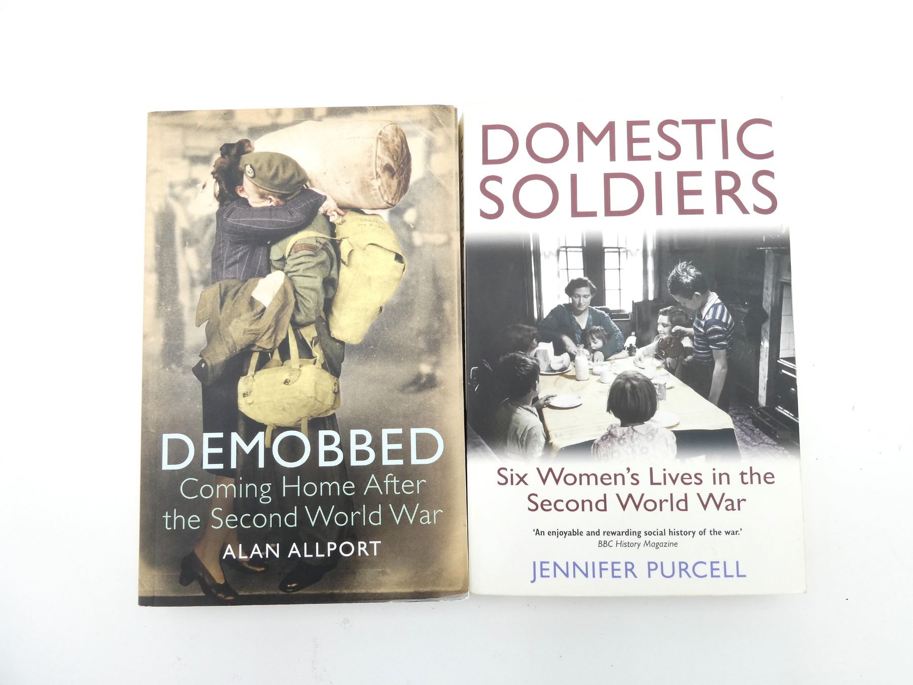 LOT INCLUDES; (1) "DEMOBBED, COMING HOME AFTER THE SECOND WORLD WAR" BOOK BY ALAN ALLPORT, SOFT COVER, ISBN: 978-0-300-16886-0 & (1) "DOMESTIC SOLDIERS, SIX WOMEN'S LIVES IN THE SECOND WORLD WAR" BOOK BY JENNIFER PURCELL, SOFT COVER, ISBN: 978-1-84901-714-5. SEE PHOTOS.