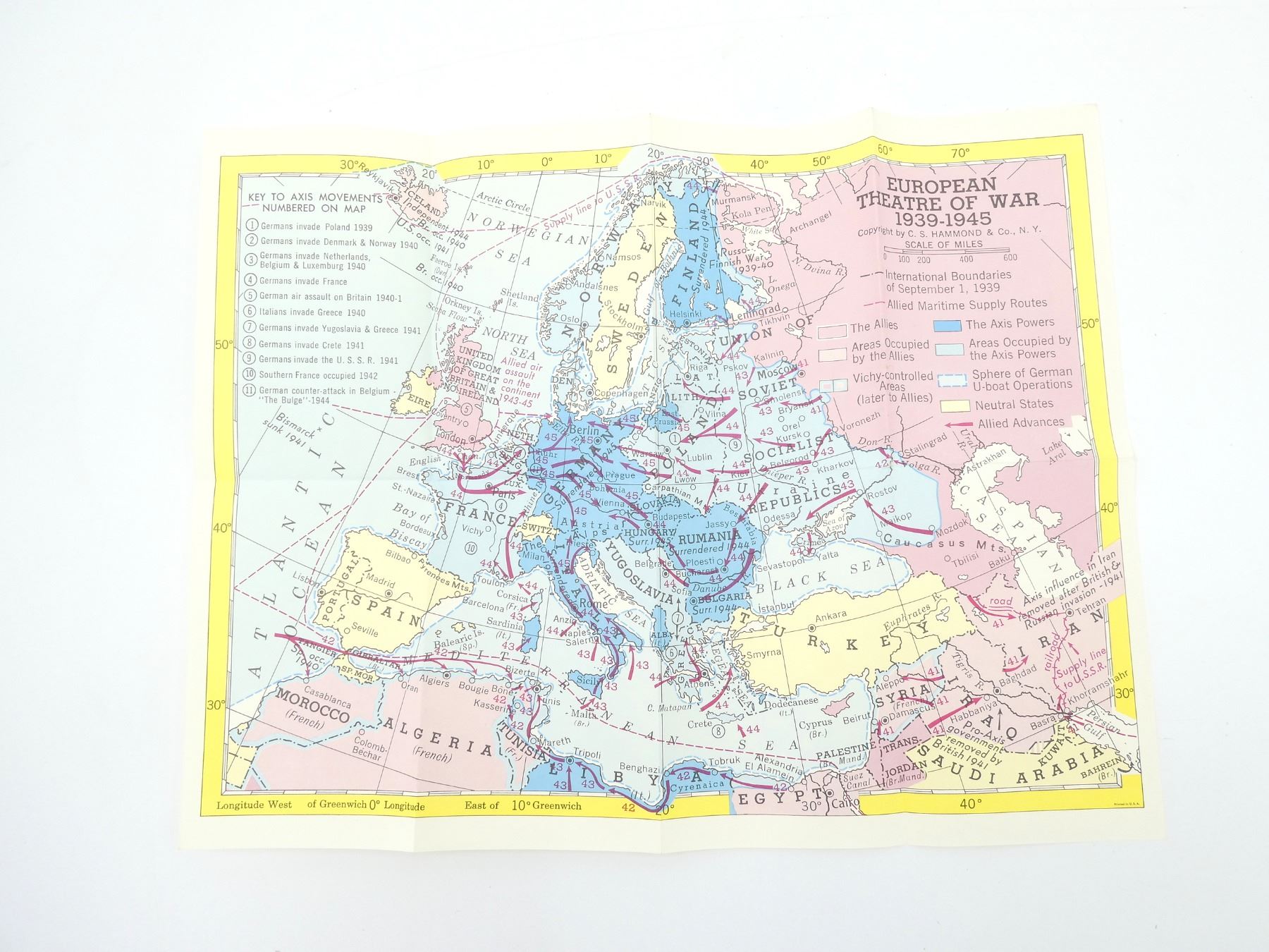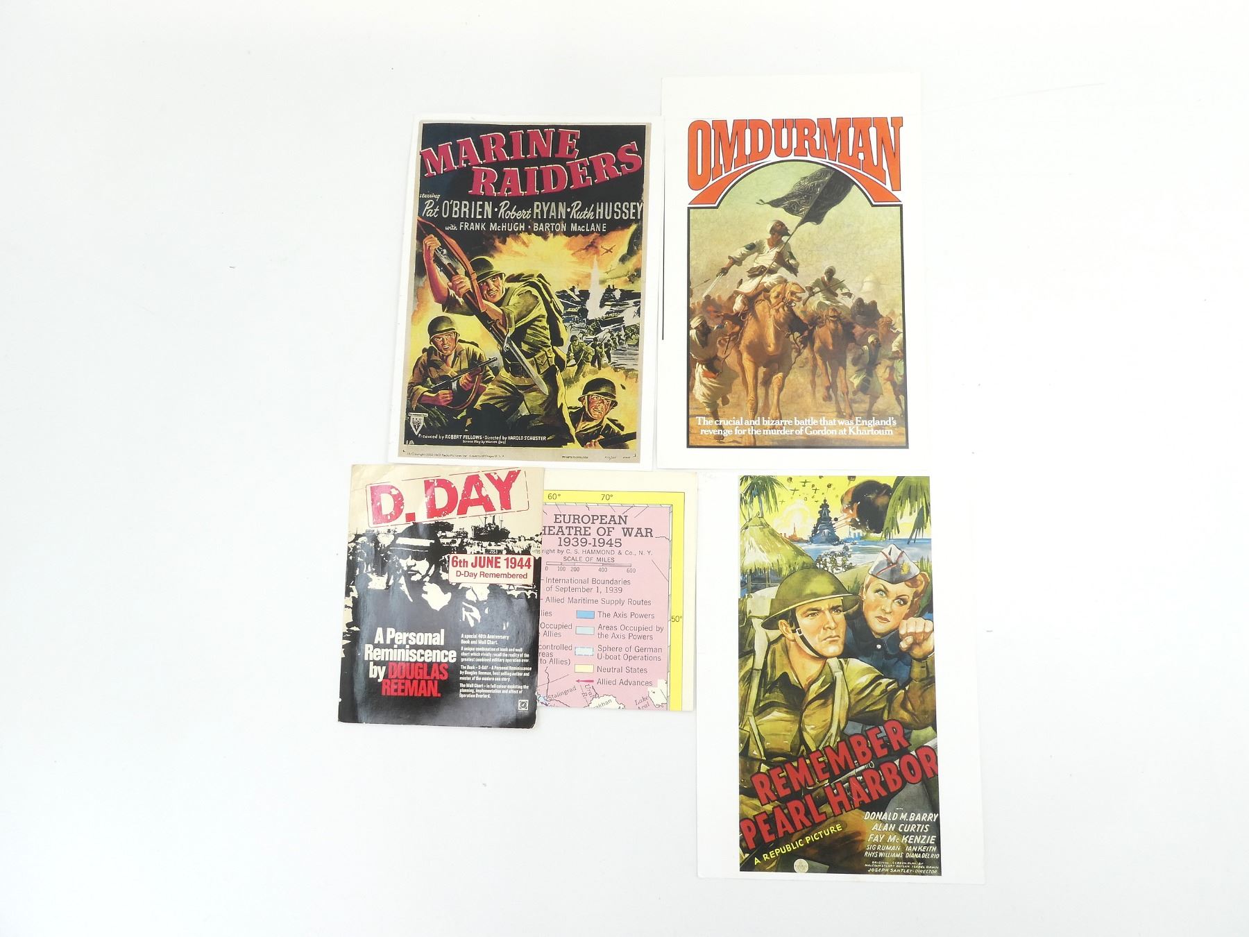 LOT INCLUDES; (1) "REMEMBER PEARL HARBOR" MOVIE POSTER PRINT, APPROX. 16" X 11", (1) "MARINE RAIDERS" MOVIE POSTER PRINT, APPROX. 15 3/8" X 11", (1) "OMDURMAN" POSTER PRINT, APPROX. 17" X 11", (1) "D-DAY, A PERSONAL REMINISCENCE BY DOUGLAS REEMAN" POSTER, APPROX. 10.5" X 8 1/8" & (1) REPRODUCTION "EUROPEAN THEATRE OF WAR 1939-1945" MAP, IN COLOUR, COPYRIGHT BY C. S. HAMMOND & CO. N.Y., APPROX. 25" X 19". SEE PHOTOS.