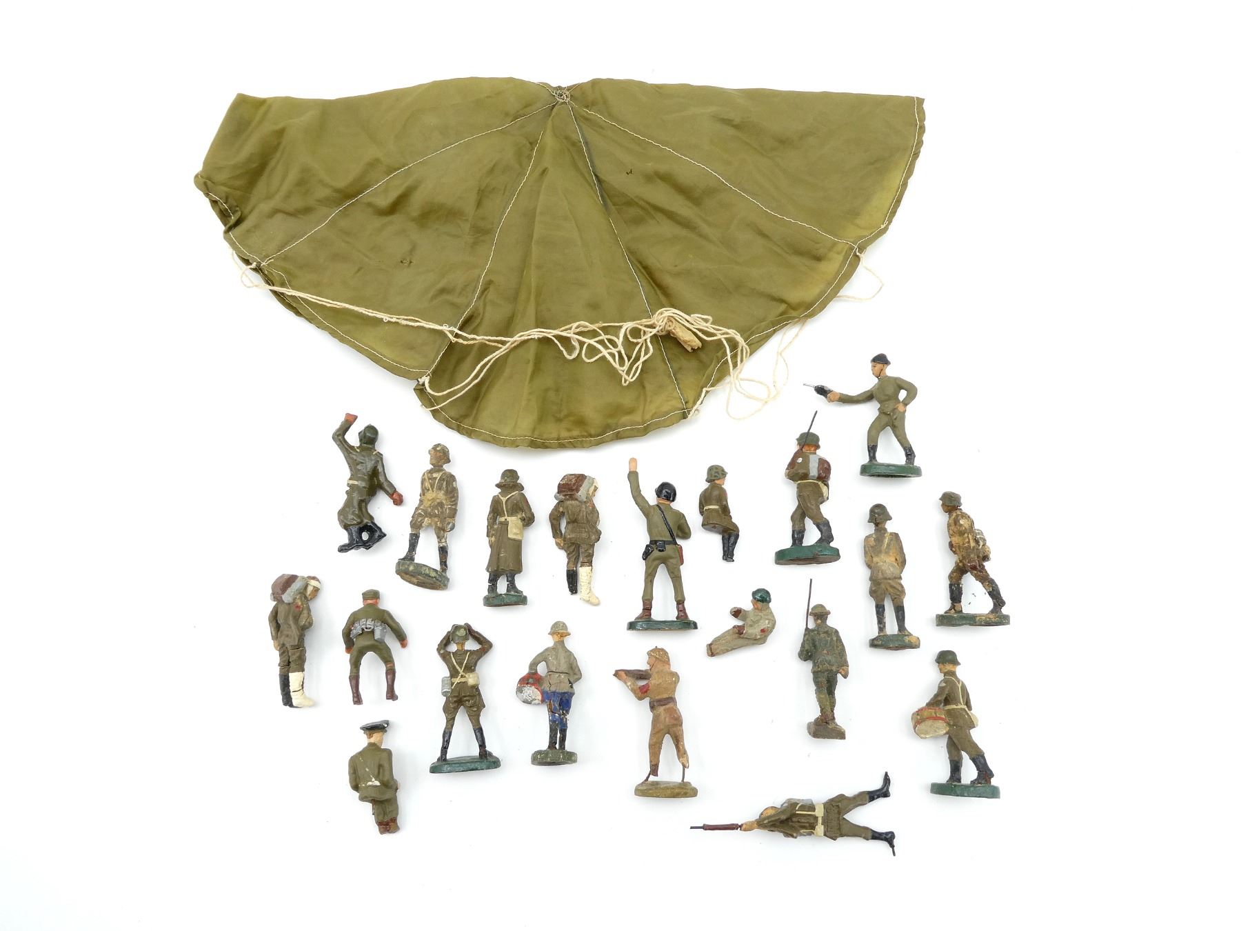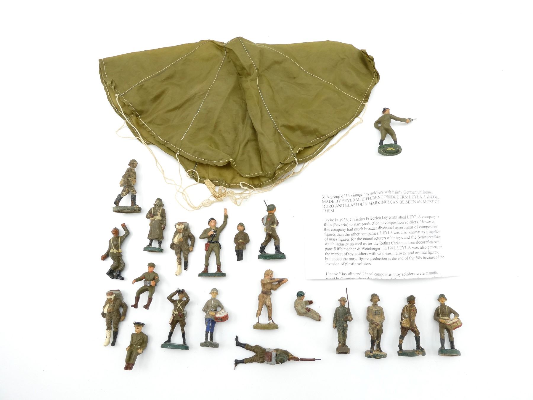 LOT INCLUDES; APPROX. (20) TOY SOLDIERS, COMES WITH INFORMATION SHEET ON THE TOY MFG'S, SOME MARKED: "LEYLA", "LINEOL", "DURO", "ELASTOLIN", ETC., CIRCA EARLY 20TH CENTURY TO 1950'S, VARIOUS COLOURS, SHOWS AGE / WEAR / TEAR. SEE PHOTOS.