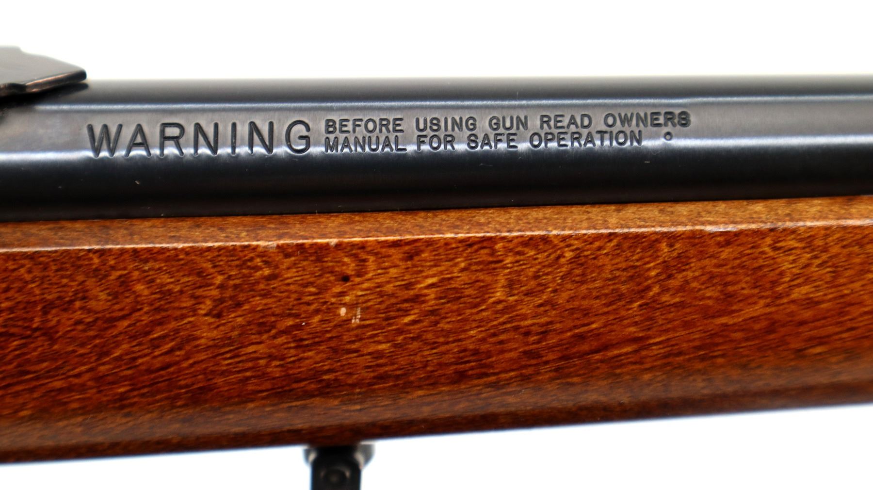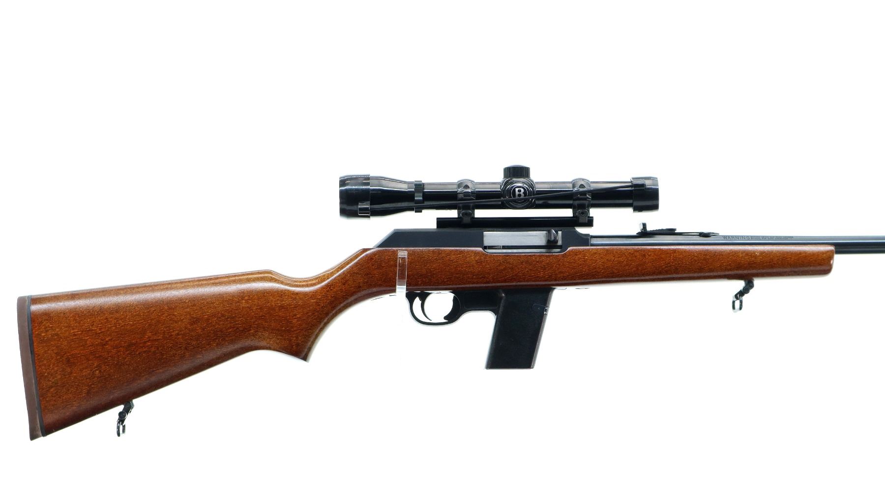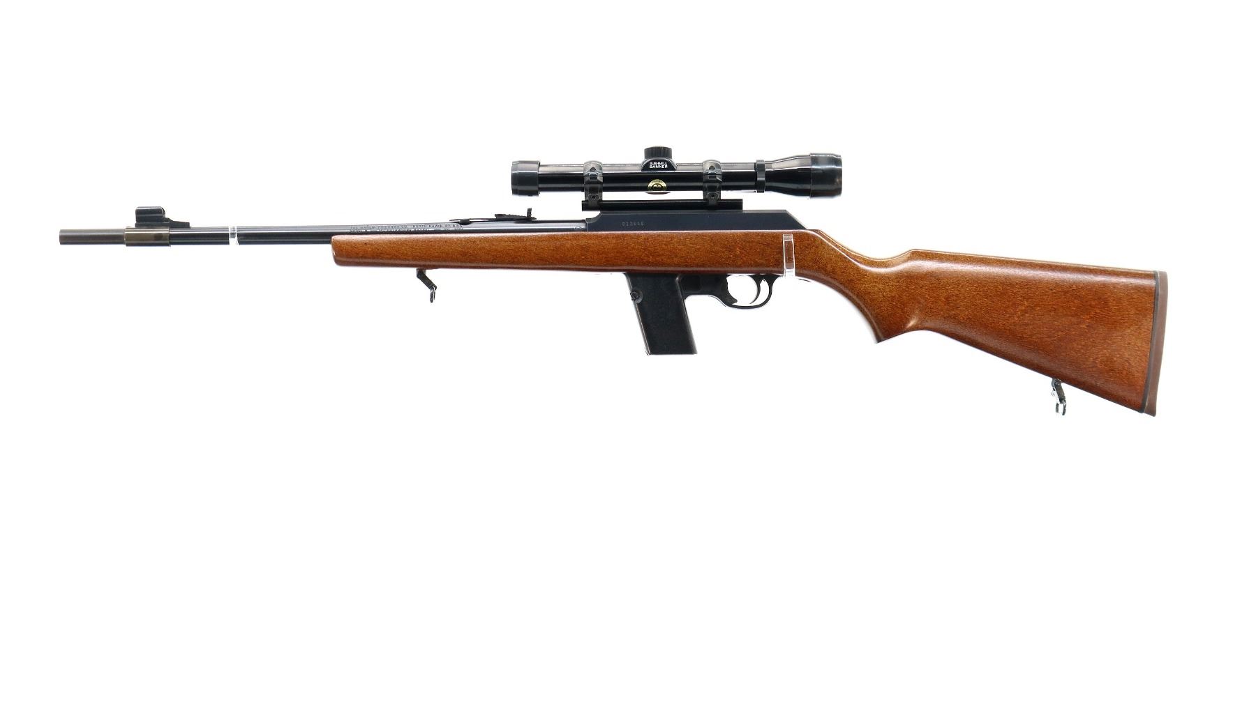 Main Description: Blade front sight with hood and ramp, adjustable folding u notched rear sight, blued finish, receiver drilled and tapped with Bushnell Banner 4x28 scope installed, clear optics with duplex crosshair. Smooth cocking handle. One piece wood stock, pistol grip, brown rubber recoil pad, sling swivels. Note: the barrel has a round extension which does not qualify as part of the barrel making this a restricted firearm.