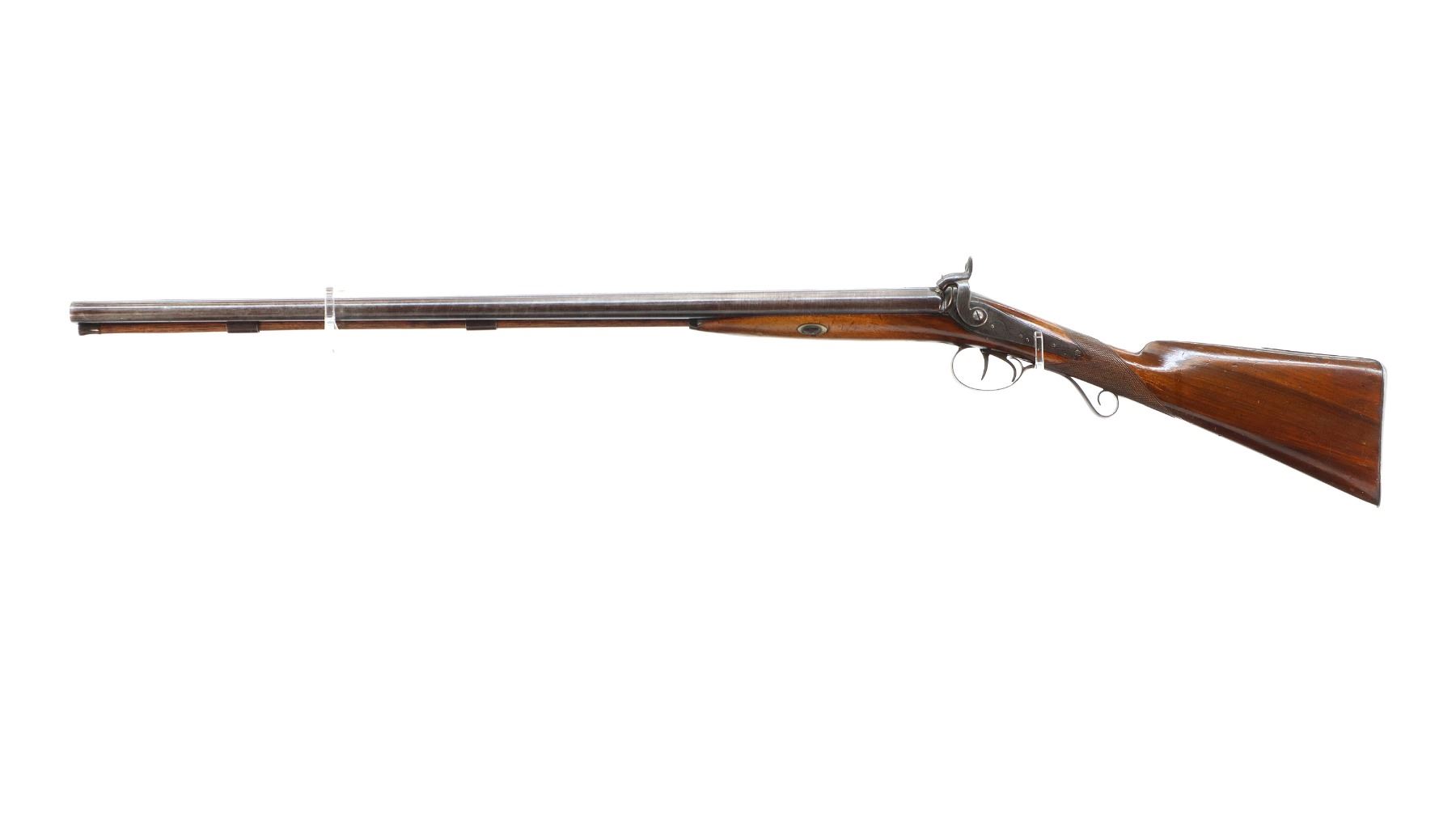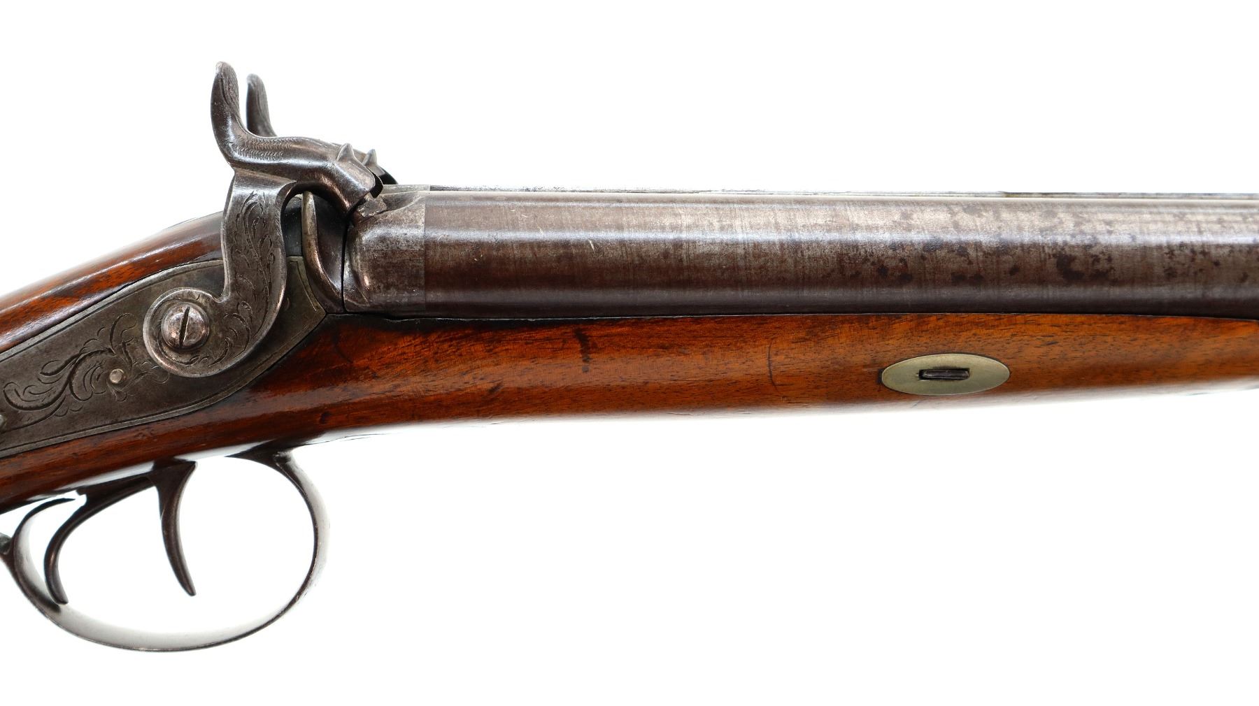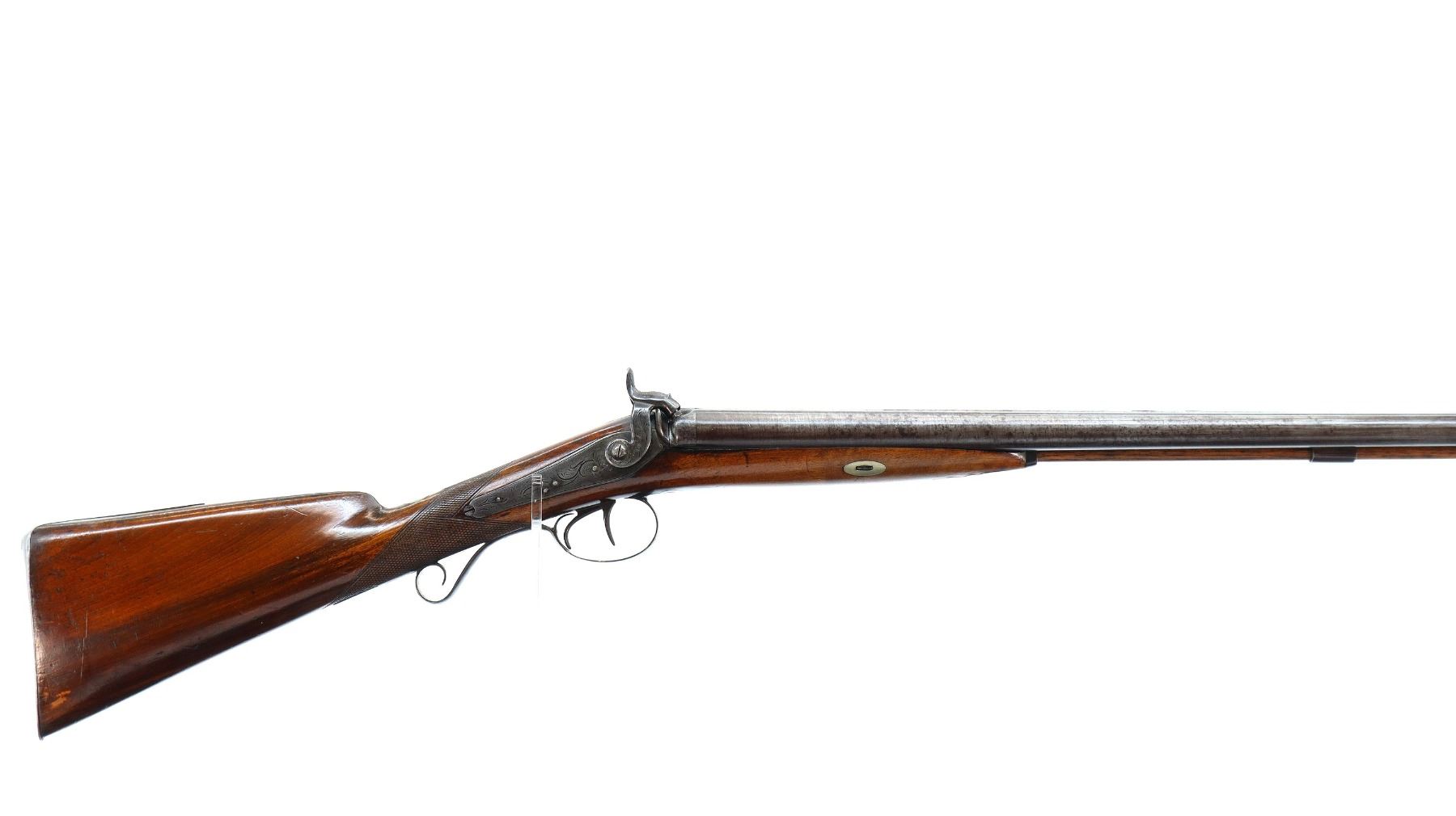 Main Description: Steel bead, Damascus barrels with smooth rib, engraved tang and back action lock with checkered spur hammers that function. One piece half length wood stock, single forearm wedge, checkered straight grip with vanity plate, smooth steel butt plate, engraved finger rest trigger guard, wood ramrod with brass tip.