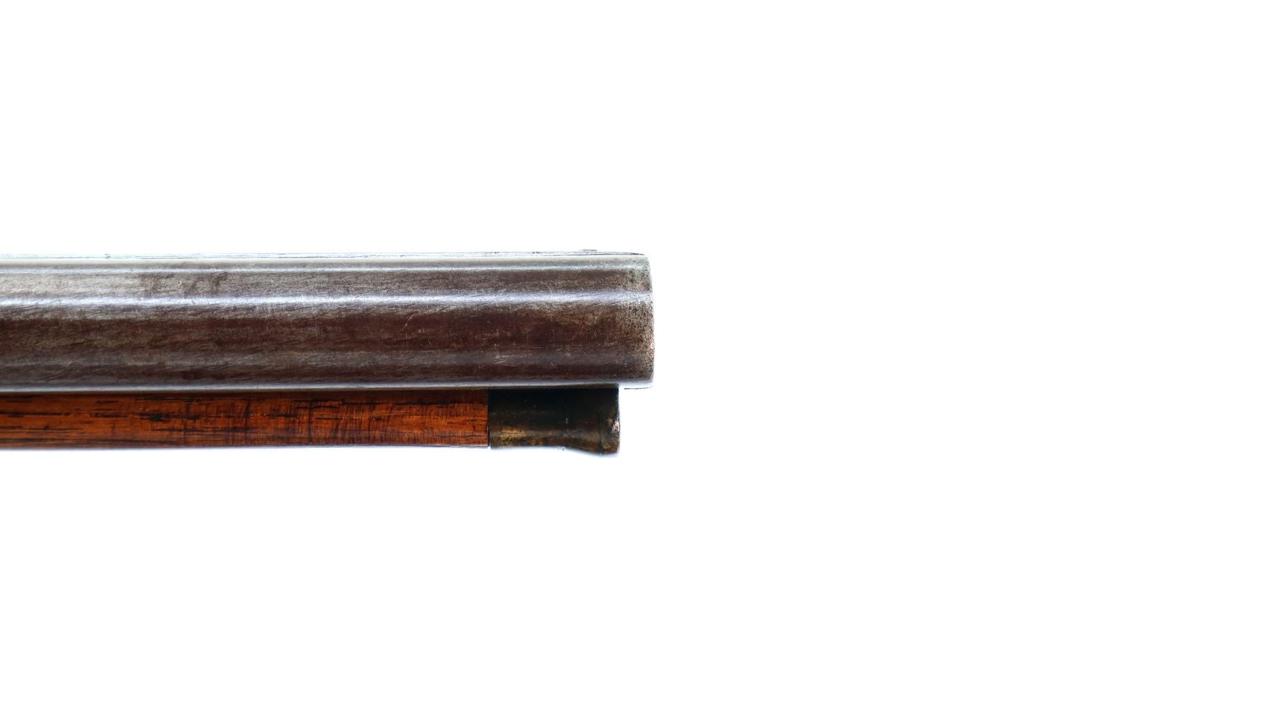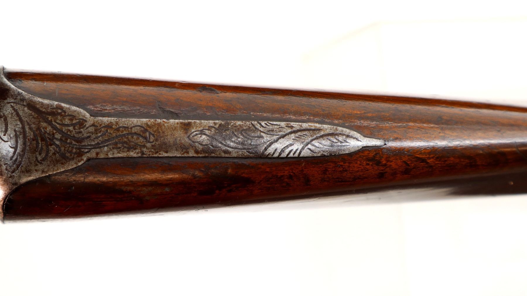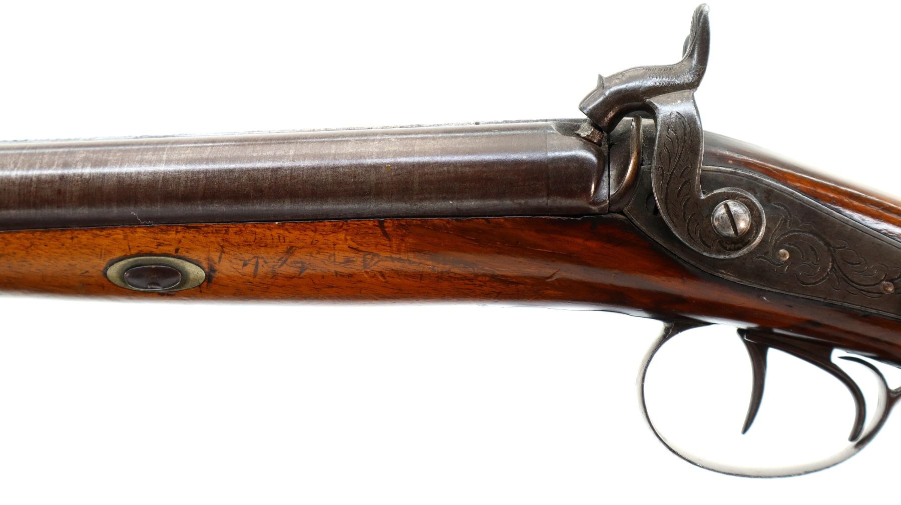 Main Description: Steel bead, Damascus barrels with smooth rib, engraved tang and back action lock with checkered spur hammers that function. One piece half length wood stock, single forearm wedge, checkered straight grip with vanity plate, smooth steel butt plate, engraved finger rest trigger guard, wood ramrod with brass tip.