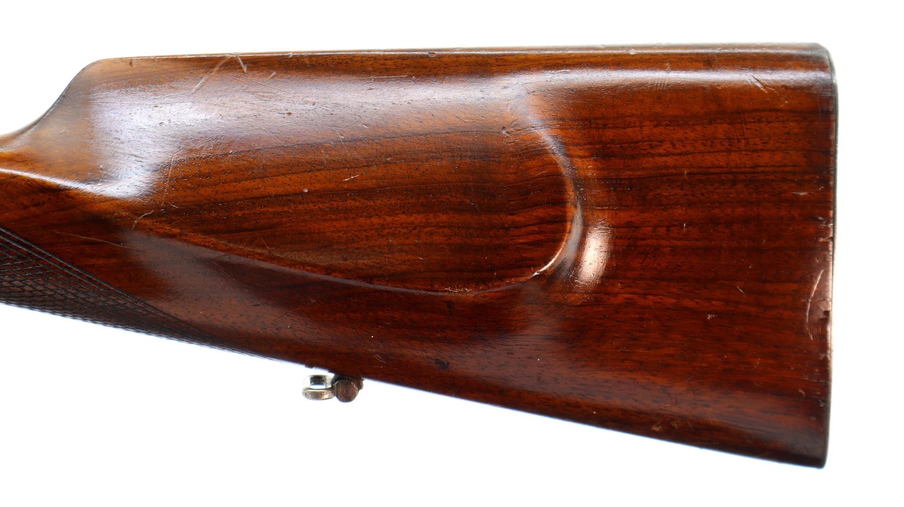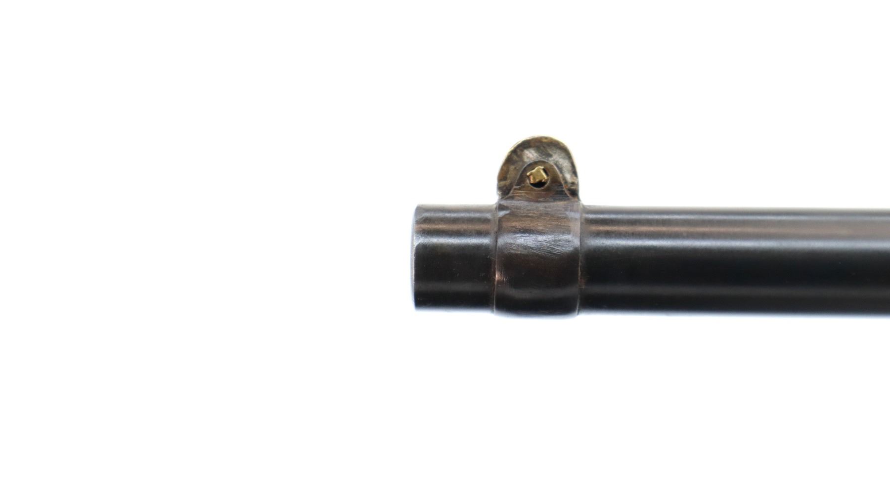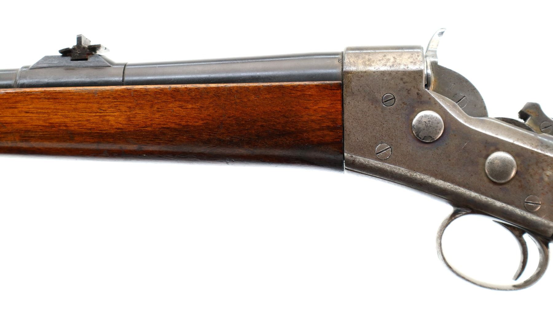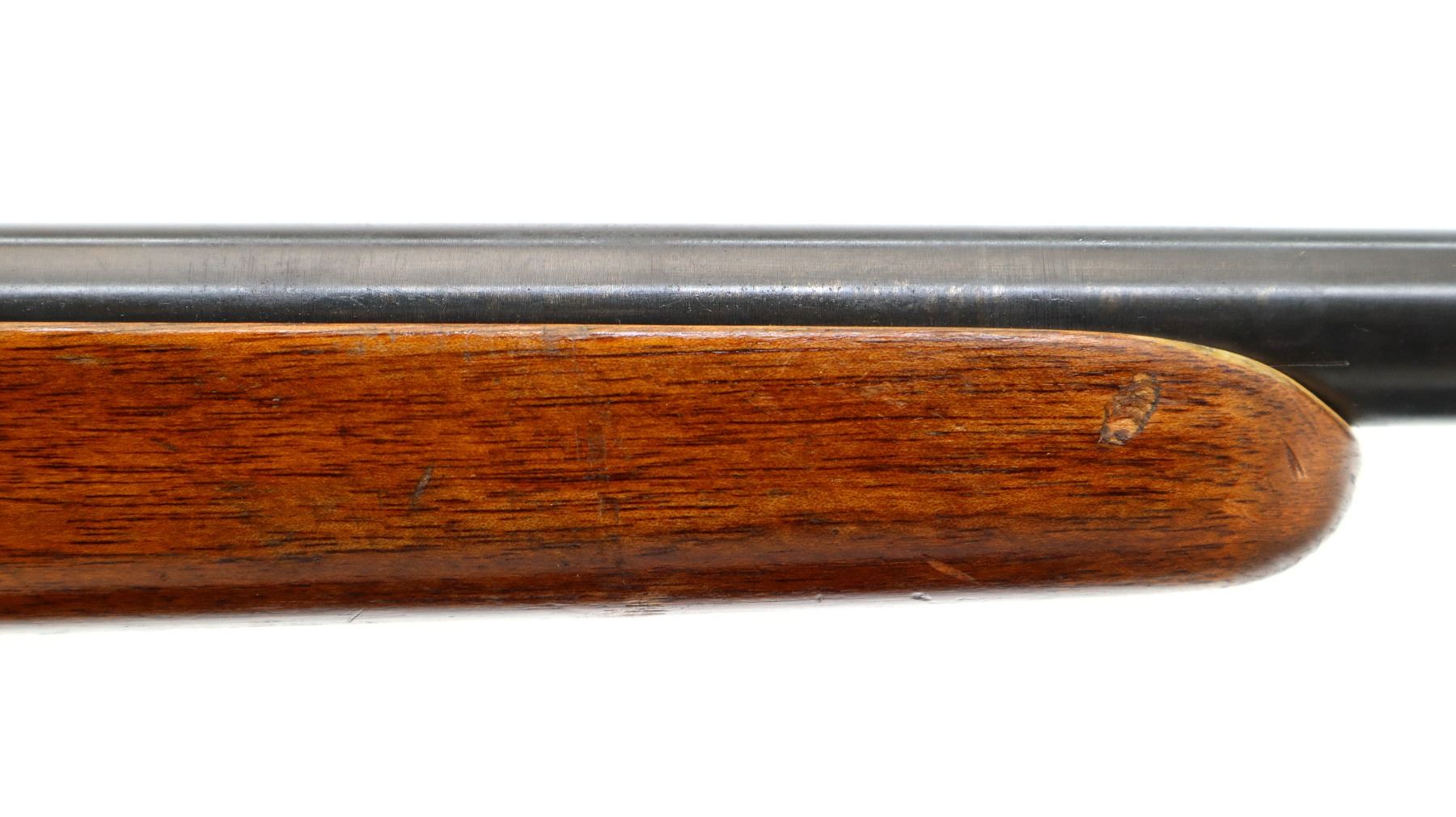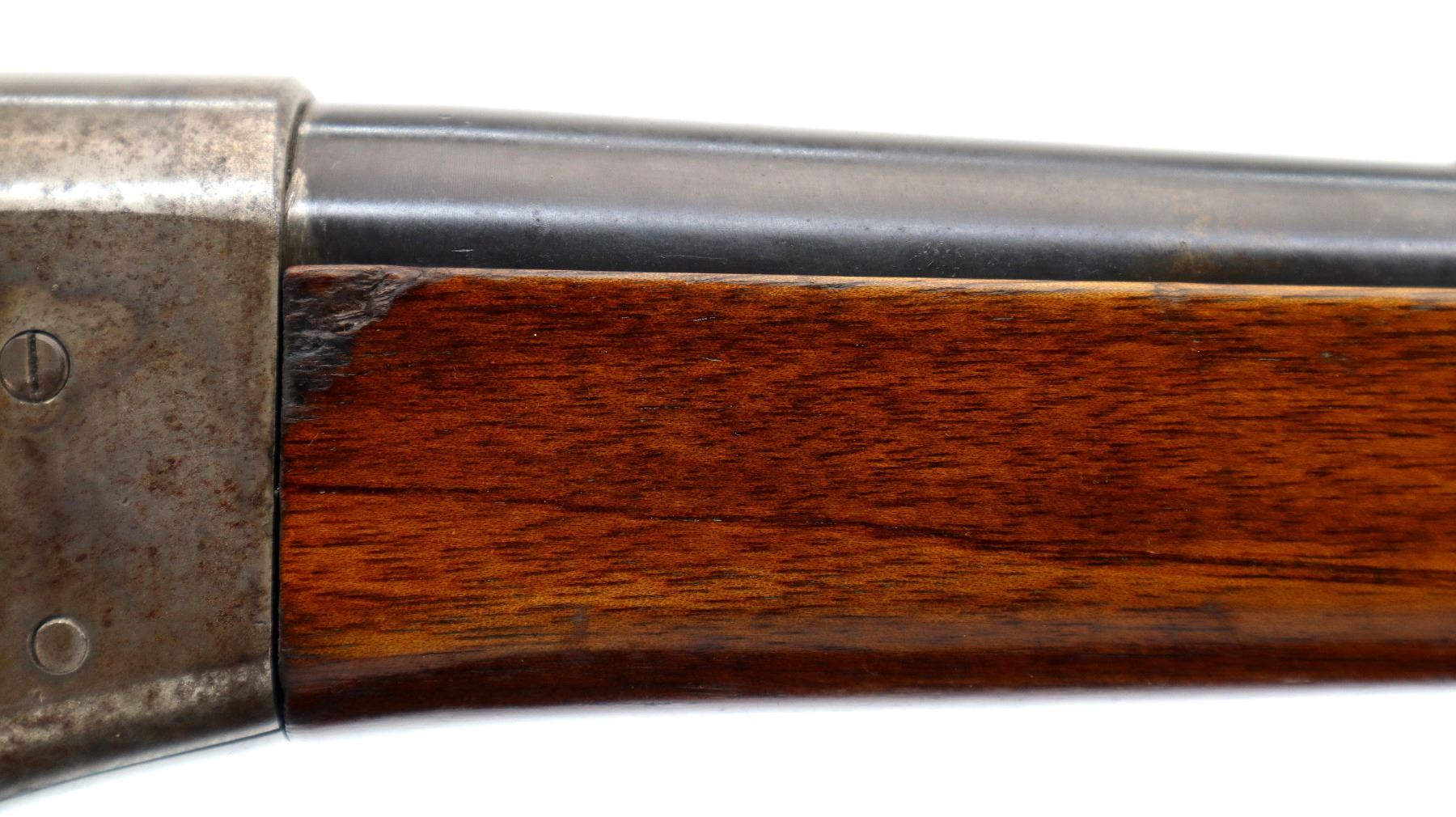 Main Description: Blade front sight, u notched rear sight with one fixed and two folding leaf's, blued tapered round barrel, colour case hardened receiver with checkered spur hammer and opening lever, extractors are present. Two piece wood stocks, checkered straight grip, cheek rest, smooth steel butt plate and rear sling swivel only.