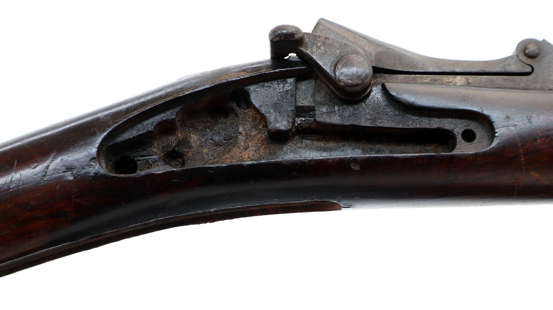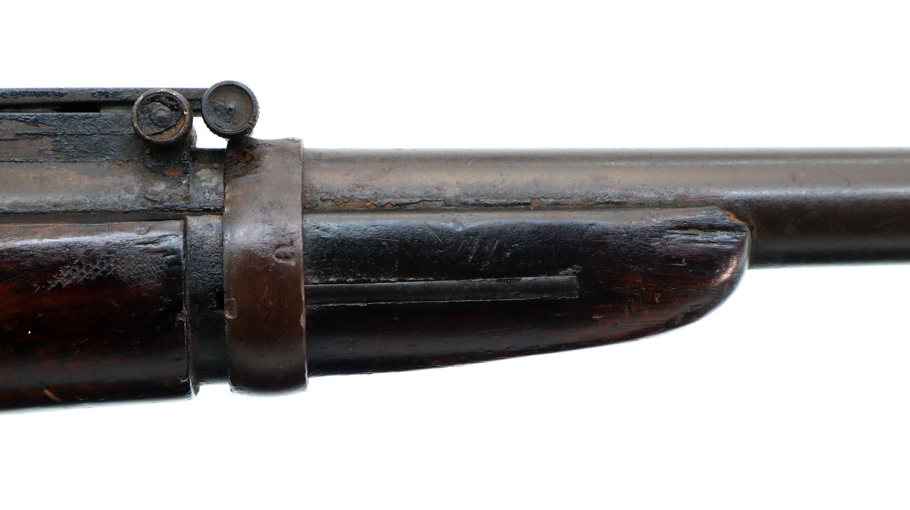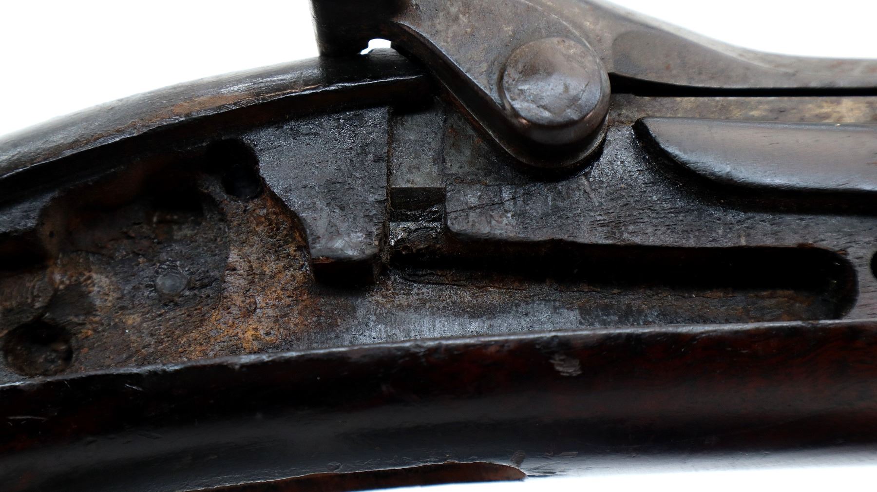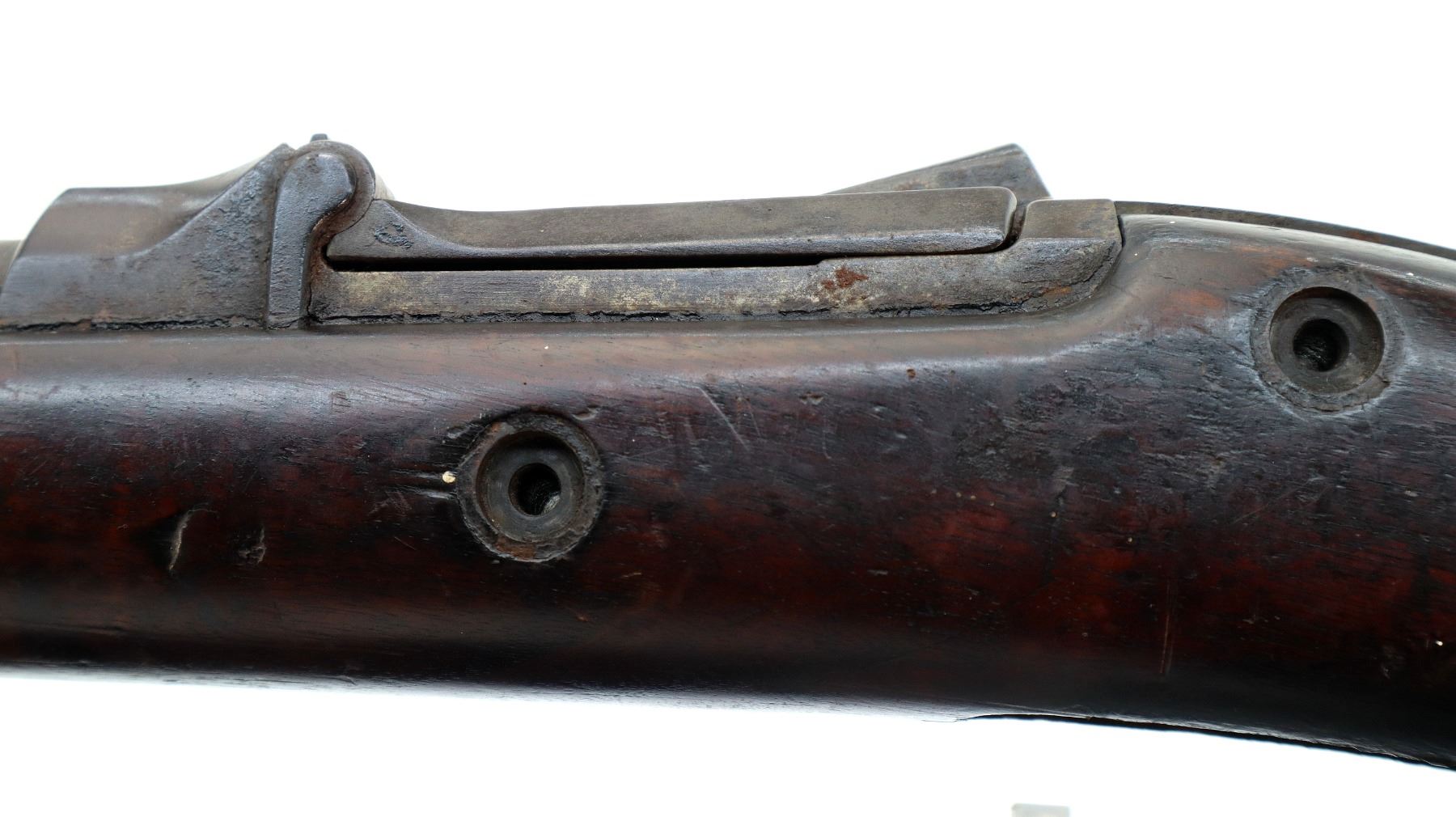 Wear: Metal finish turning brown with pitting, rust, scratches, handling marks and wear. Stocks show marks, scratches and wear.