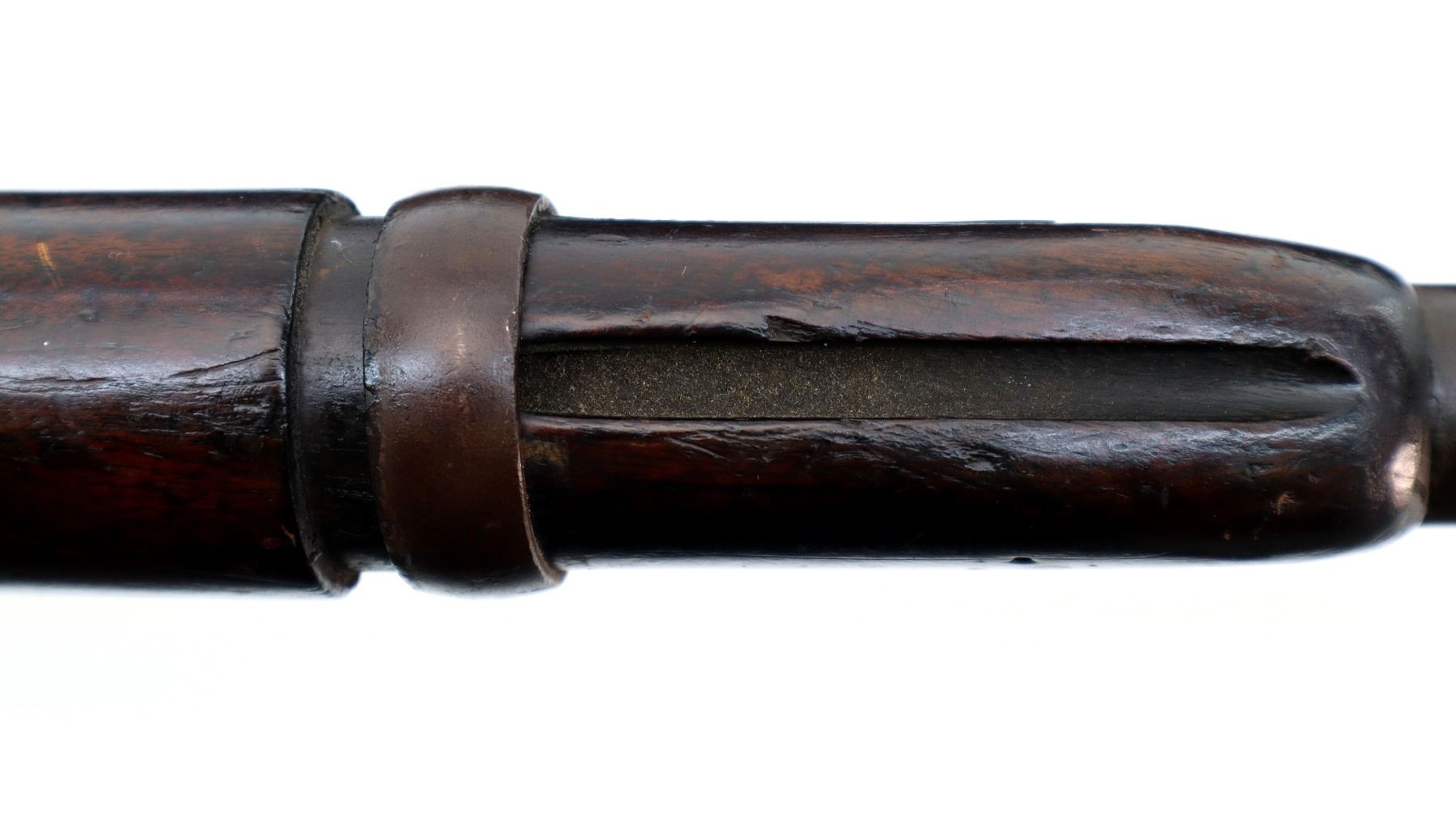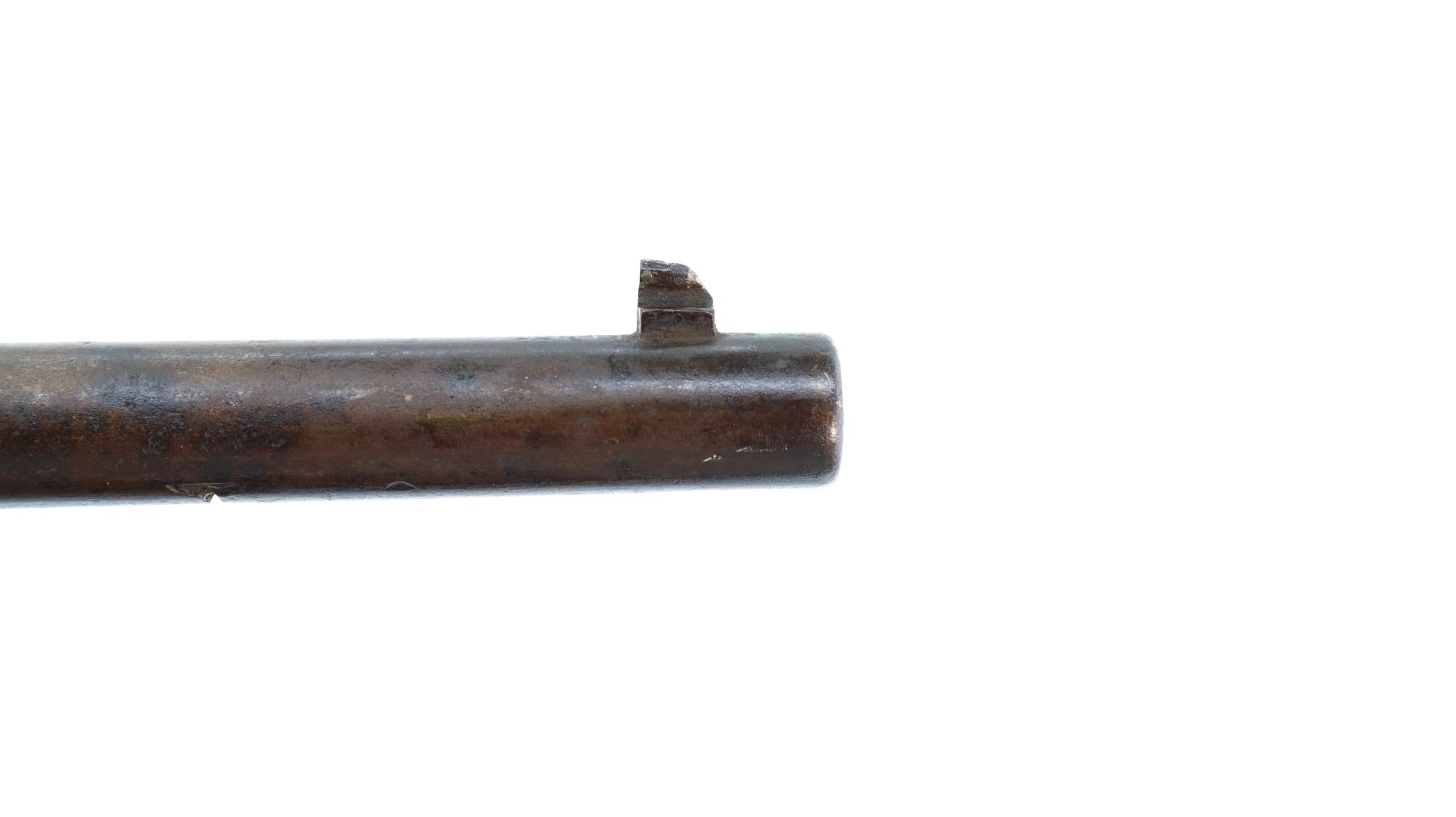 Main Description: Blade front sight with ramp, adjustable u notched ladder rear sight, includes complete breech block, missing side lock, action screws, trigger guard assembly, butt plate and screws. Has a one piece sporterized wood stock, straight grip, stock chipped at heel and toe, single barrel band, front swivels which have been soldered to barrel.