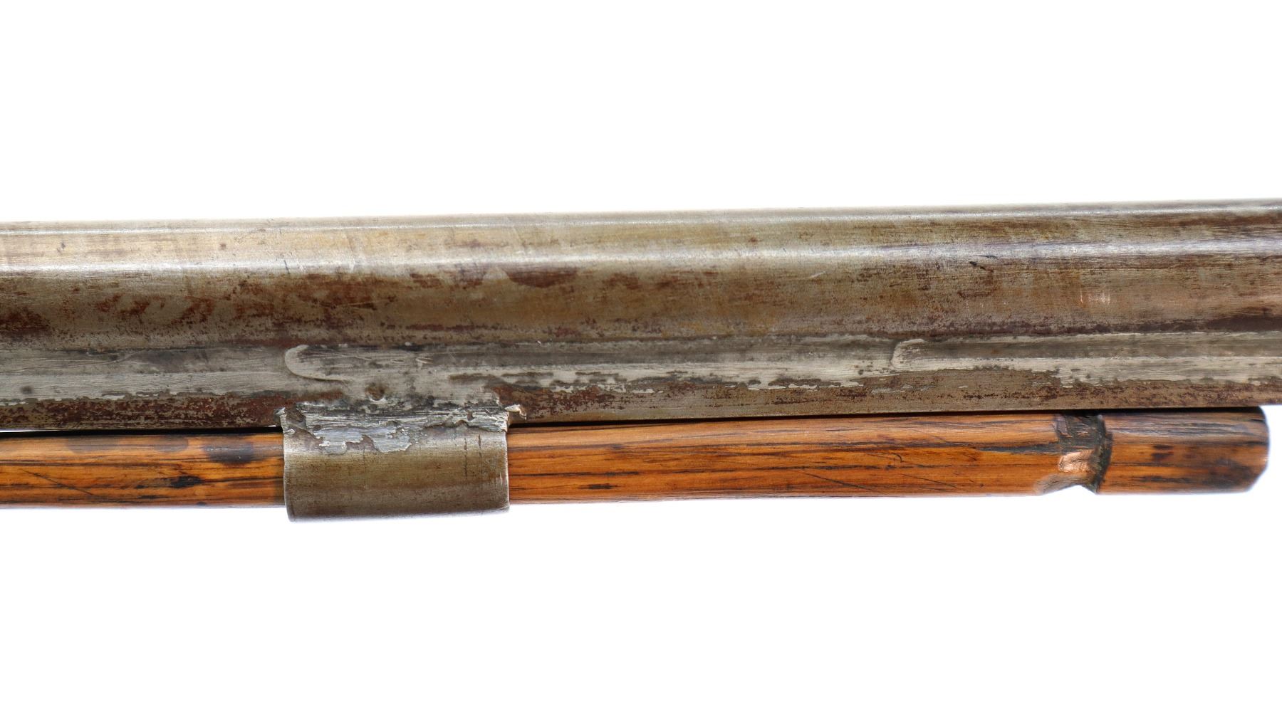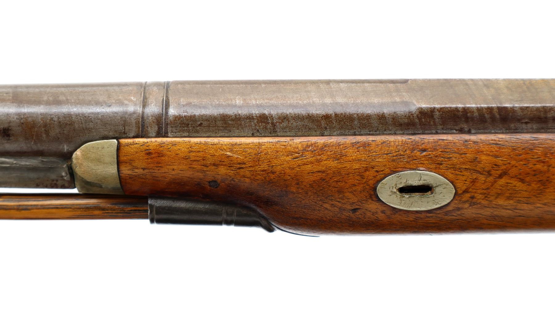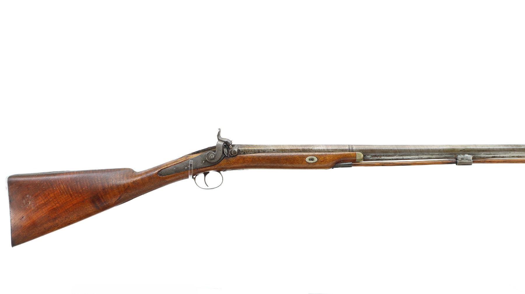 Main Description: Brass bead, Damascus barrel, 1/4 octagon and 2/3rd round barrel, engraved tang and back action lock with checkered spur hammer that functions. One piece half length wood stock, broken forearm wedge, checkered straight grip with vanity plate, stock chipped, cracked and broken behind lock, tang and barrel, smooth steel butt plate, replaced wood ramrod, ramrod pipes have been soldered on.