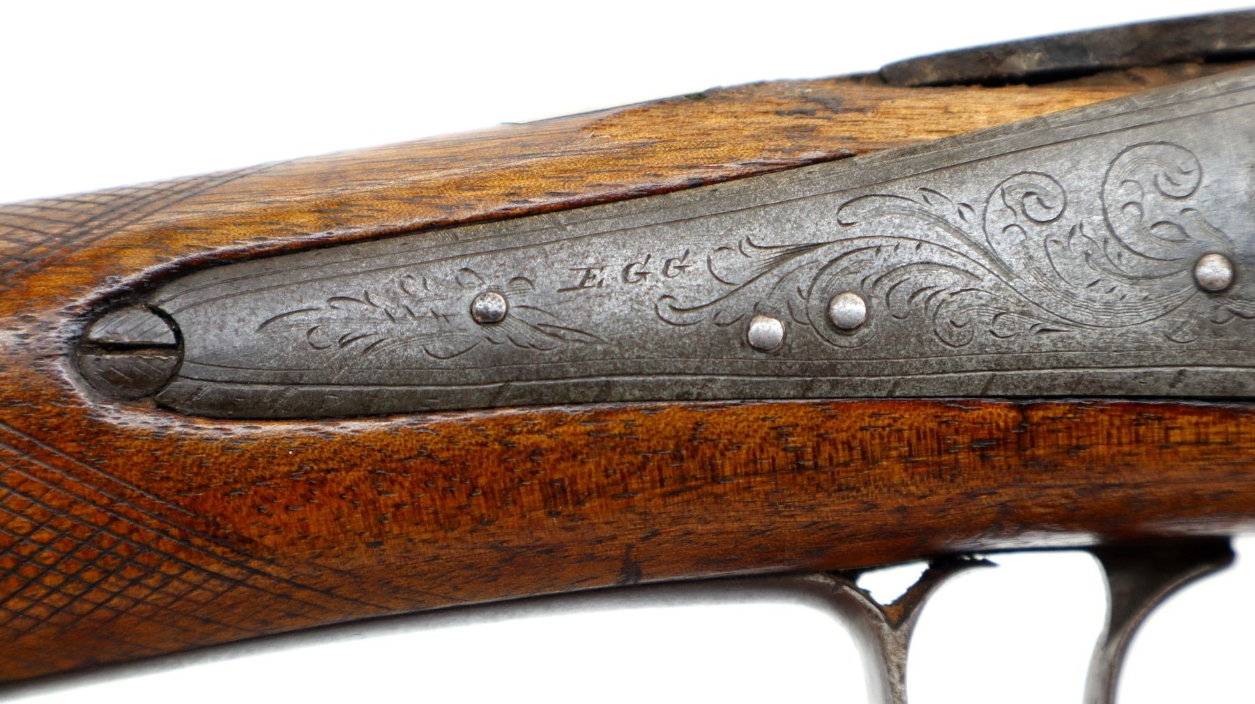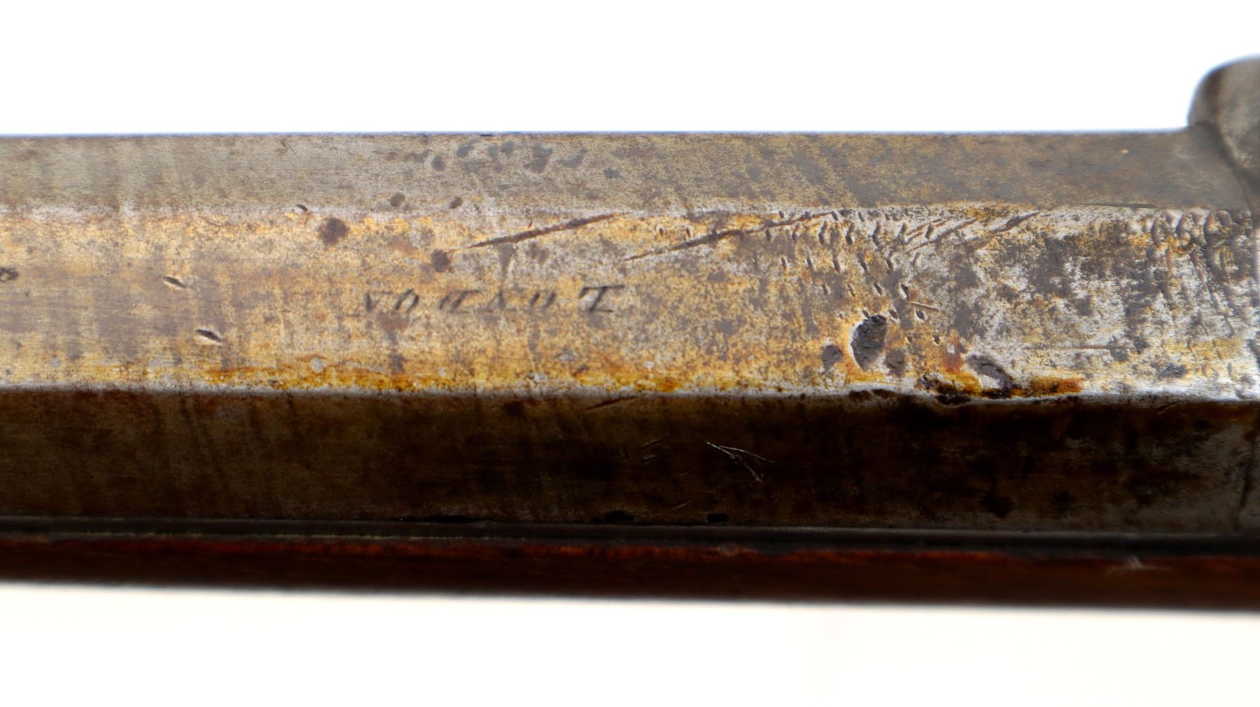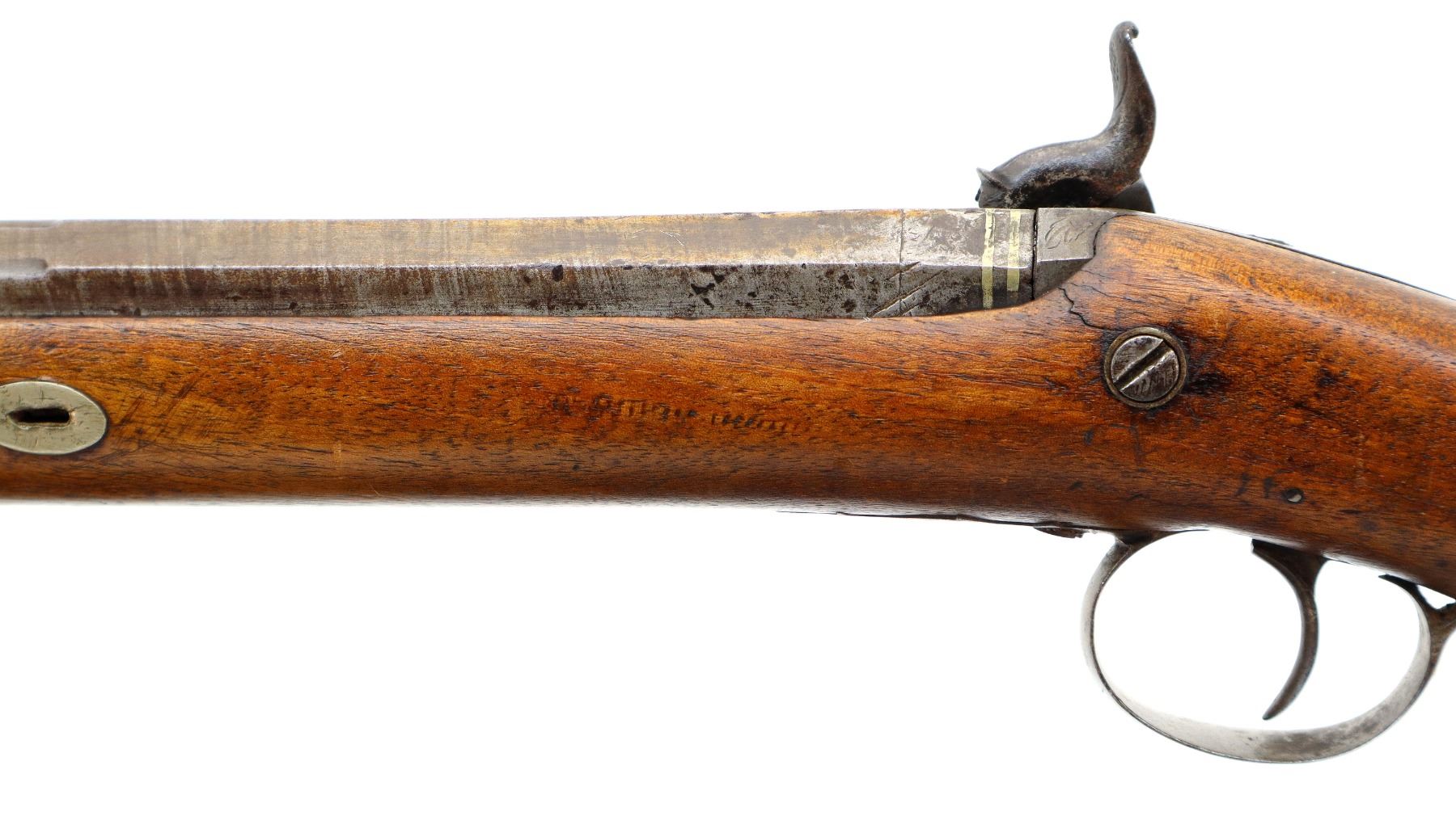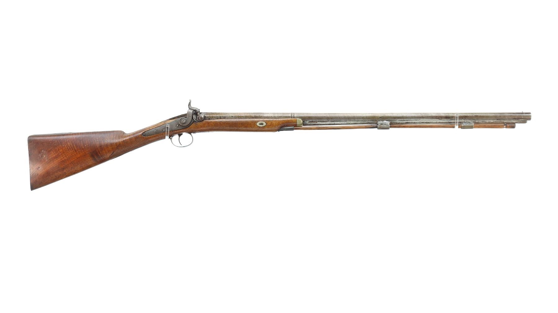 Main Description: Brass bead, Damascus barrel, 1/4 octagon and 2/3rd round barrel, engraved tang and back action lock with checkered spur hammer that functions. One piece half length wood stock, broken forearm wedge, checkered straight grip with vanity plate, stock chipped, cracked and broken behind lock, tang and barrel, smooth steel butt plate, replaced wood ramrod, ramrod pipes have been soldered on.
