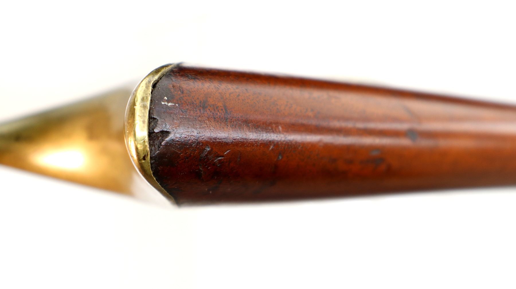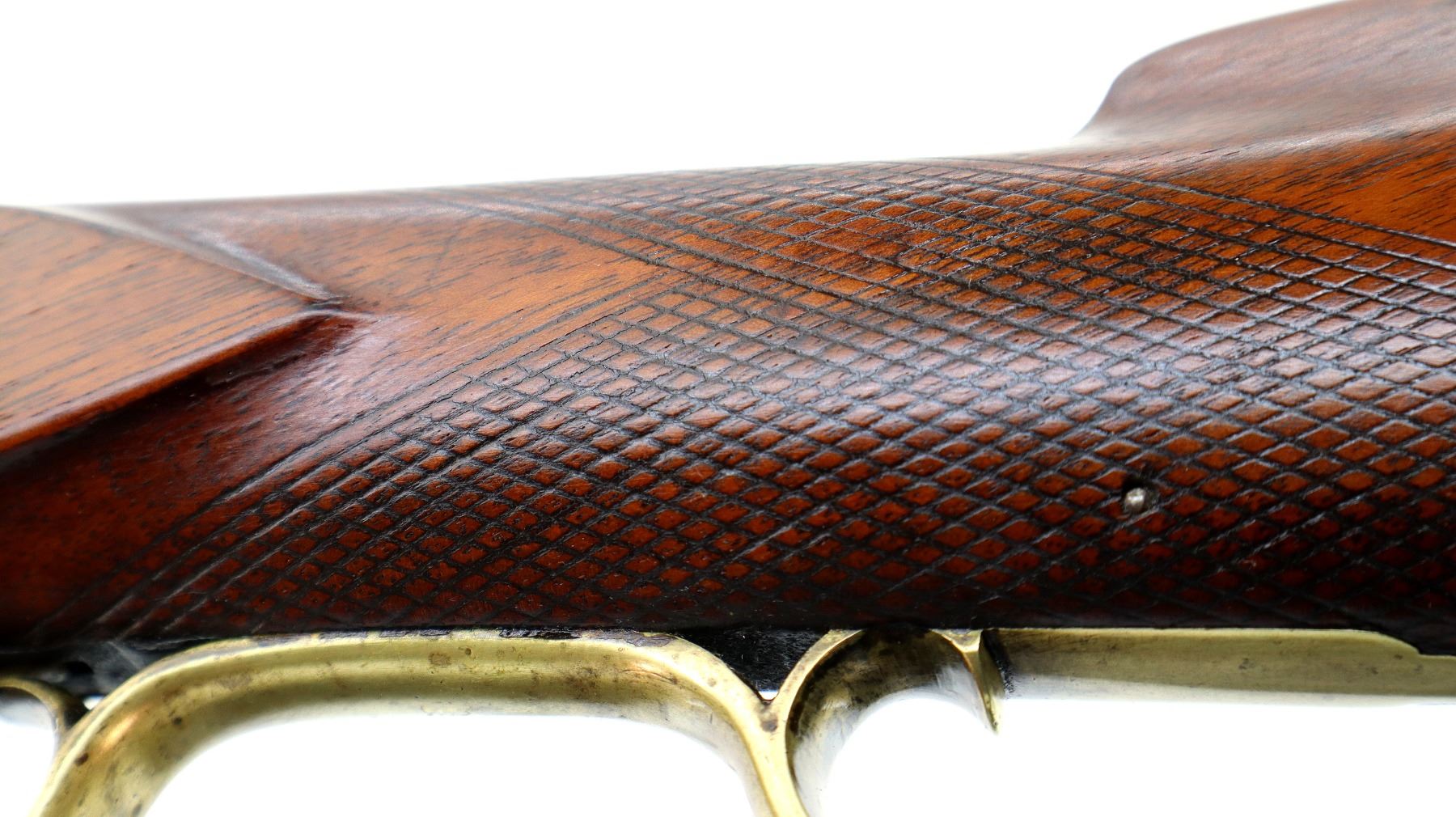 Main Description: Blade front sight, u notched rear sight missing elevator, heavy octagon barrel, engraved lock with checkered spur hammer, mainspring is light, nipple is intact. One piece half length wood stock, single forend wedge, forearm is chipped, checkered straight grip, smooth curved brass butt plate, patch box, finger rest trigger guard. Alloy nose cap, wood ramrod with brass tip.