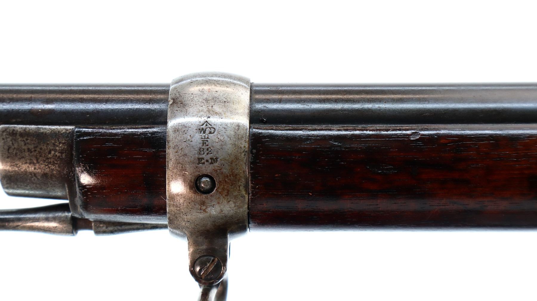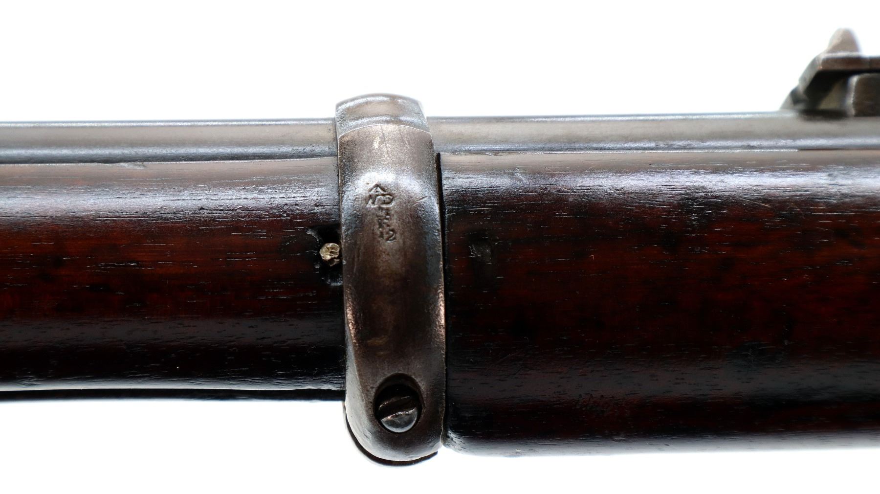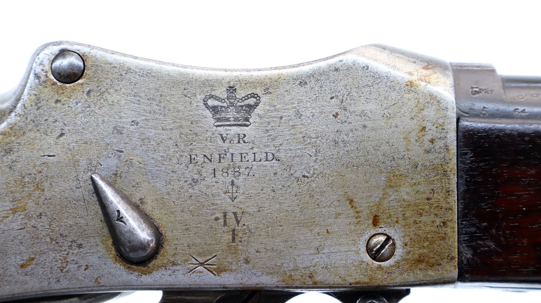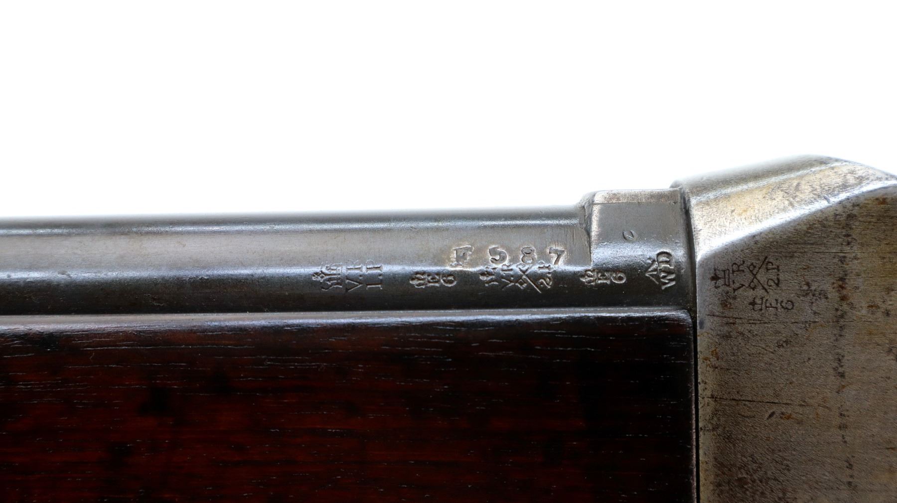 Main Description: Manufactured by Enfield 1887. Blade front sight with ramp, adjustable u notched ladder rear sight, blued finish, small cocking indicator and long lever. Two piece full military wood stocks, straight grip, smooth steel butt plate, various markings on right side of stock, sling swivels, cleaning rod, bayonet lug.
