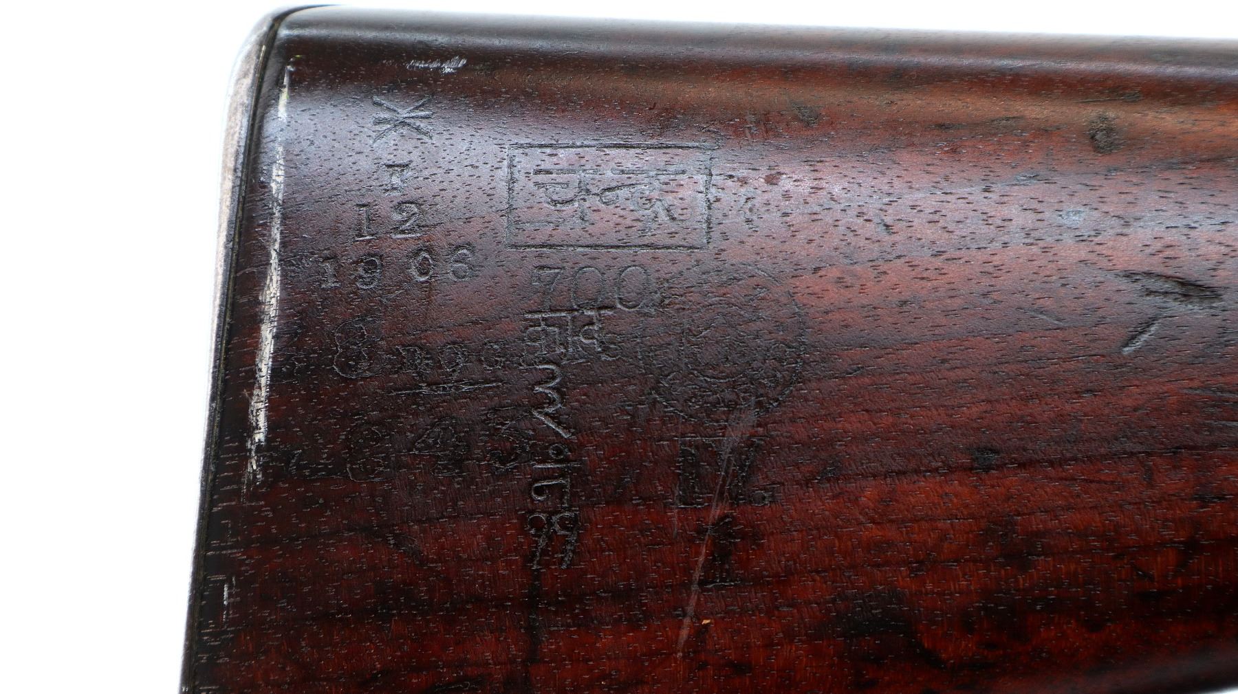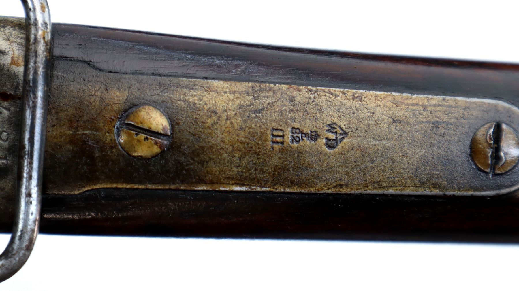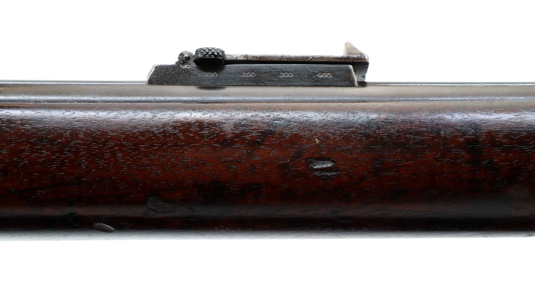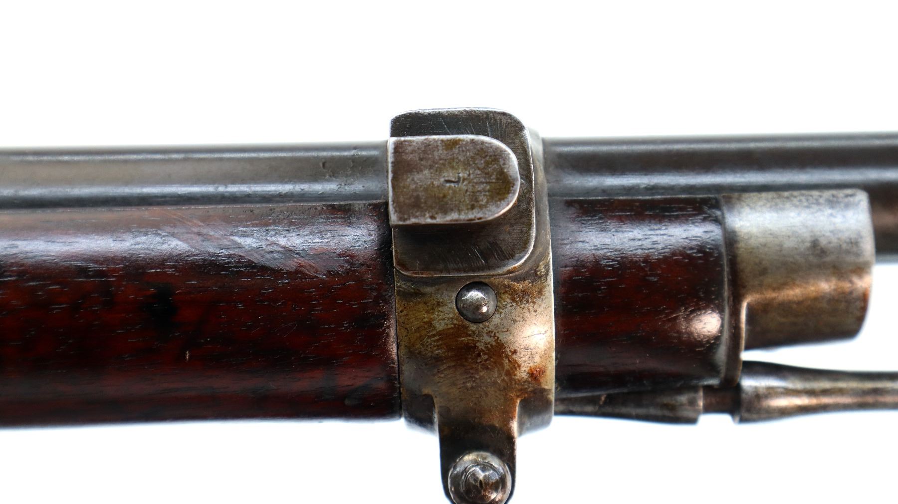 Main Description: Manufactured by Enfield 1887. Blade front sight with ramp, adjustable u notched ladder rear sight, blued finish, small cocking indicator and long lever. Two piece full military wood stocks, straight grip, smooth steel butt plate, various markings on right side of stock, sling swivels, cleaning rod, bayonet lug.