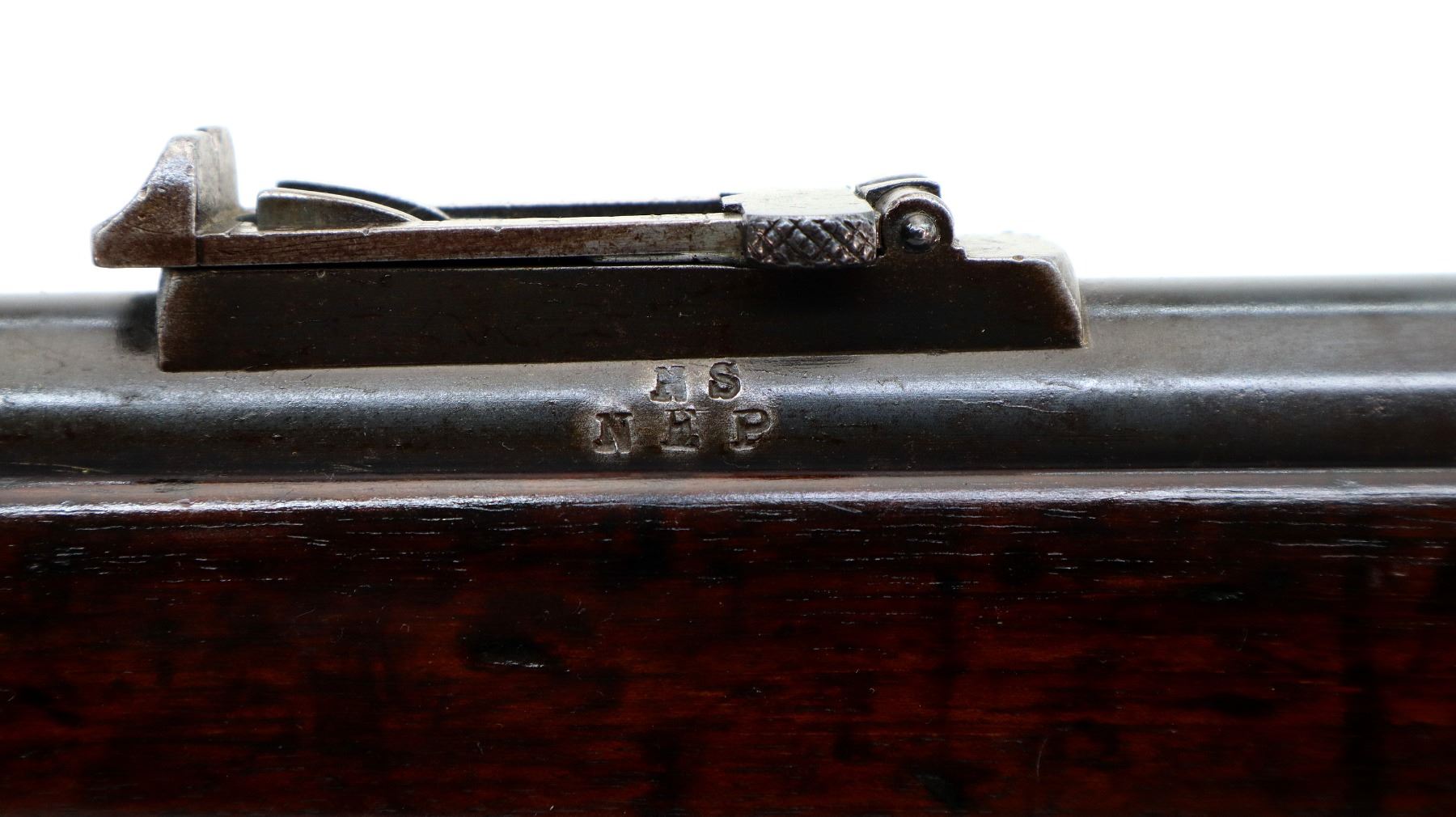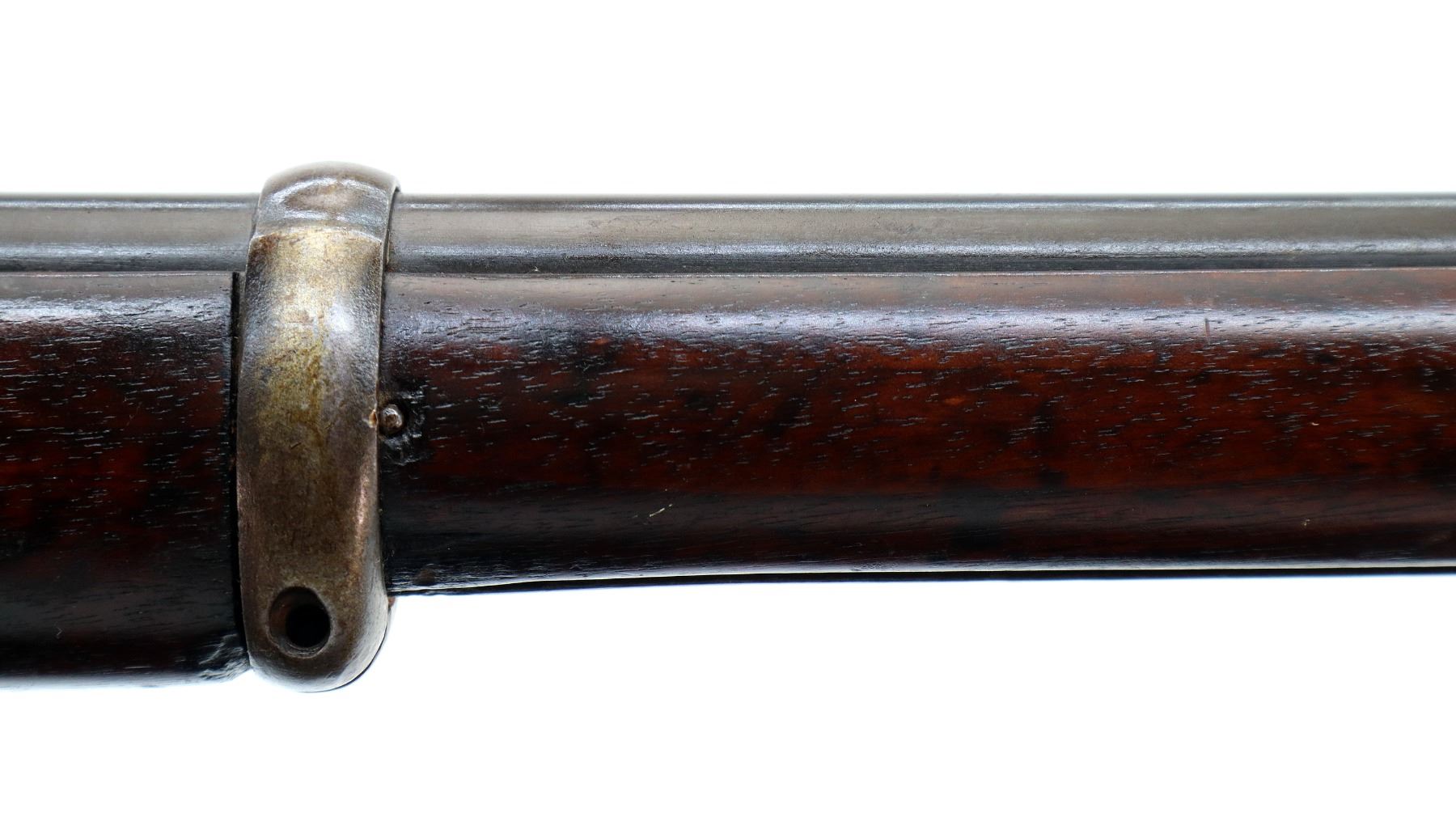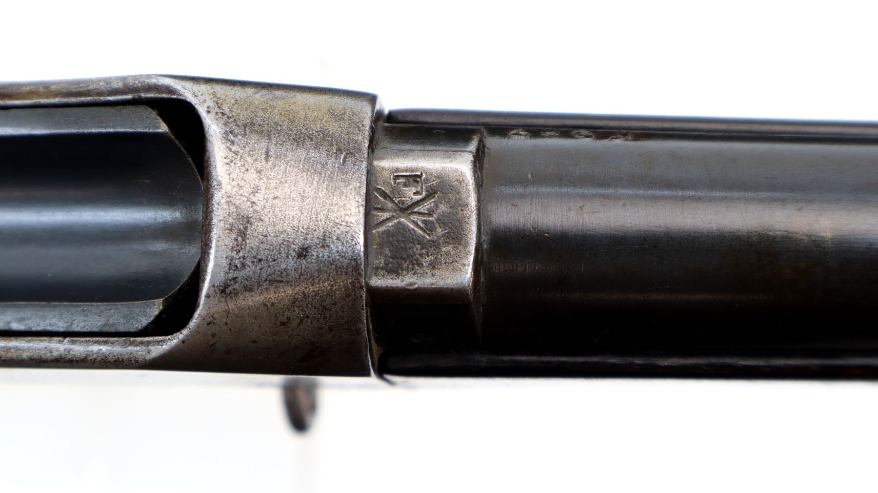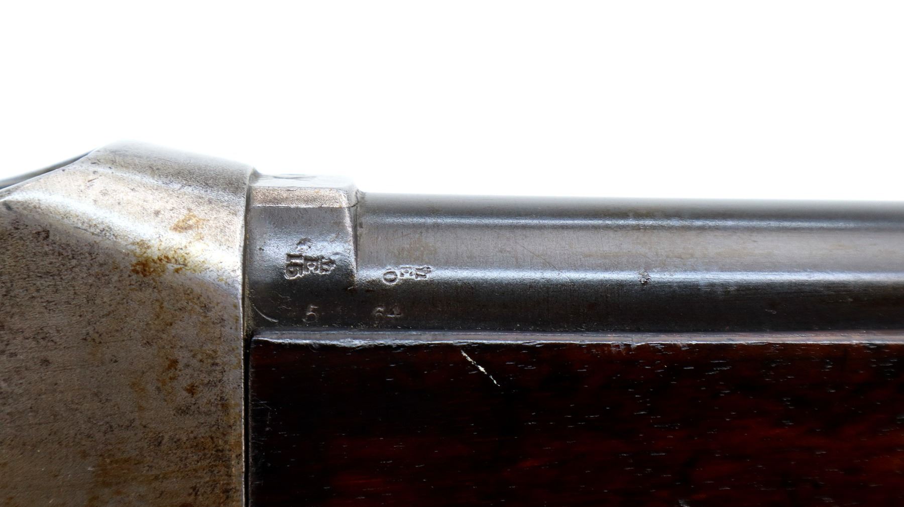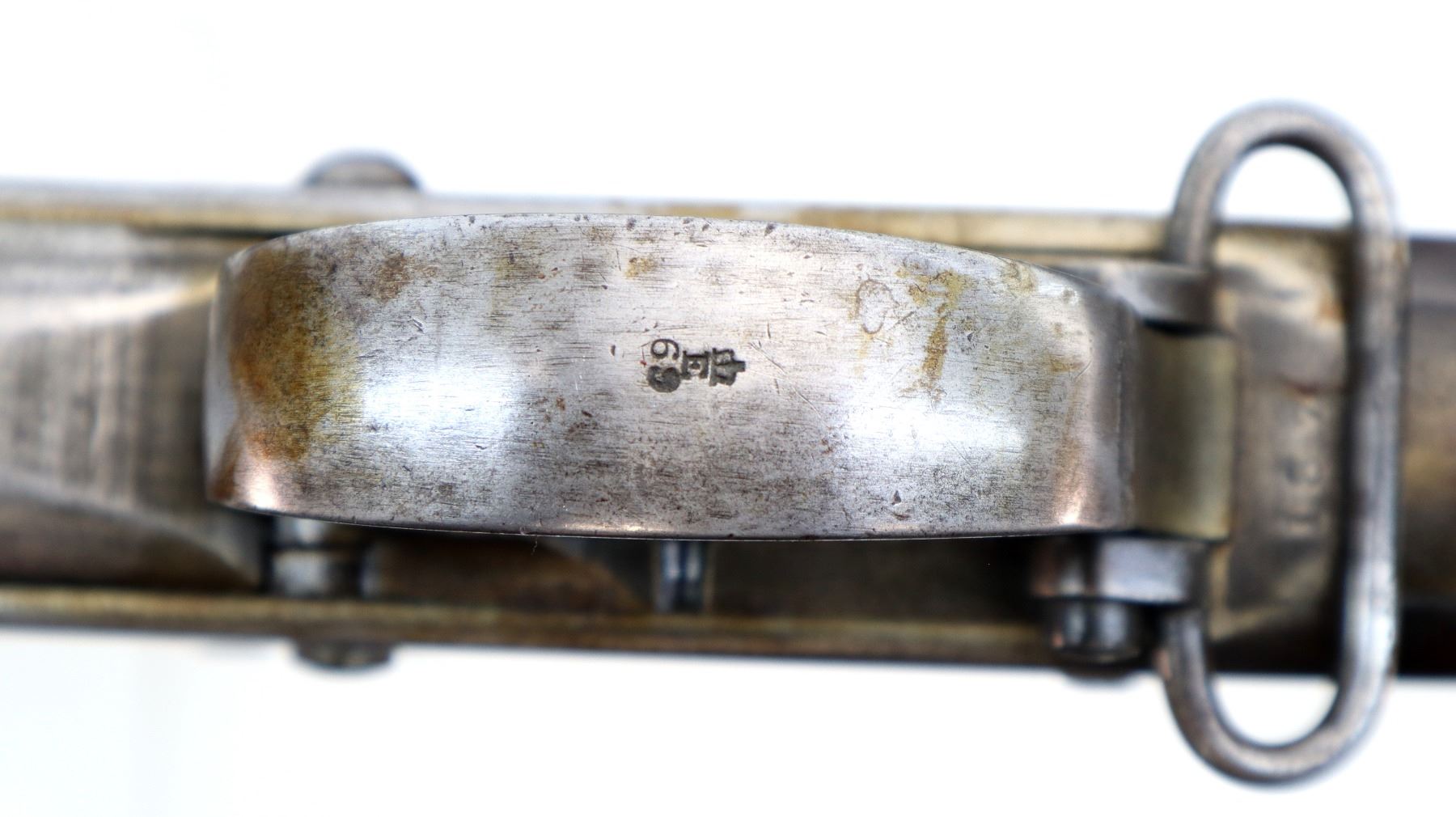 Main Description: Manufactured by Enfield 1887. Blade front sight with ramp, adjustable u notched ladder rear sight, blued finish, small cocking indicator and long lever. Two piece full military wood stocks, straight grip, smooth steel butt plate, various markings on right side of stock, sling swivels, cleaning rod, bayonet lug.