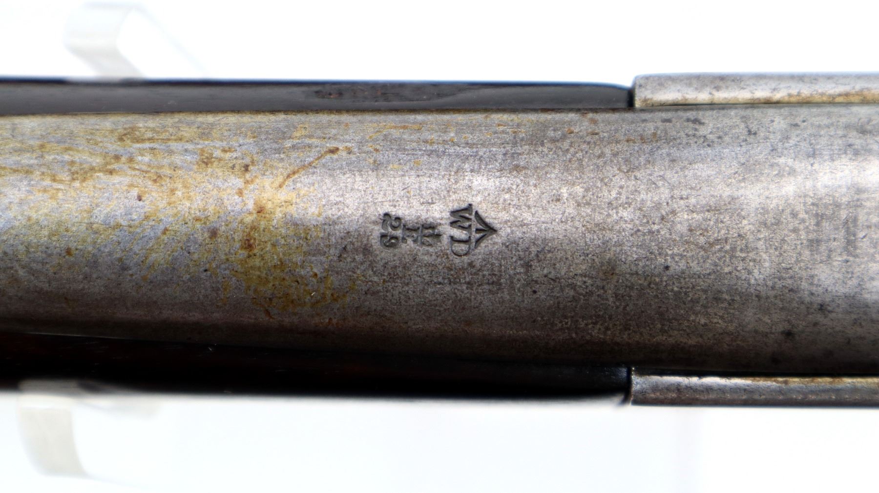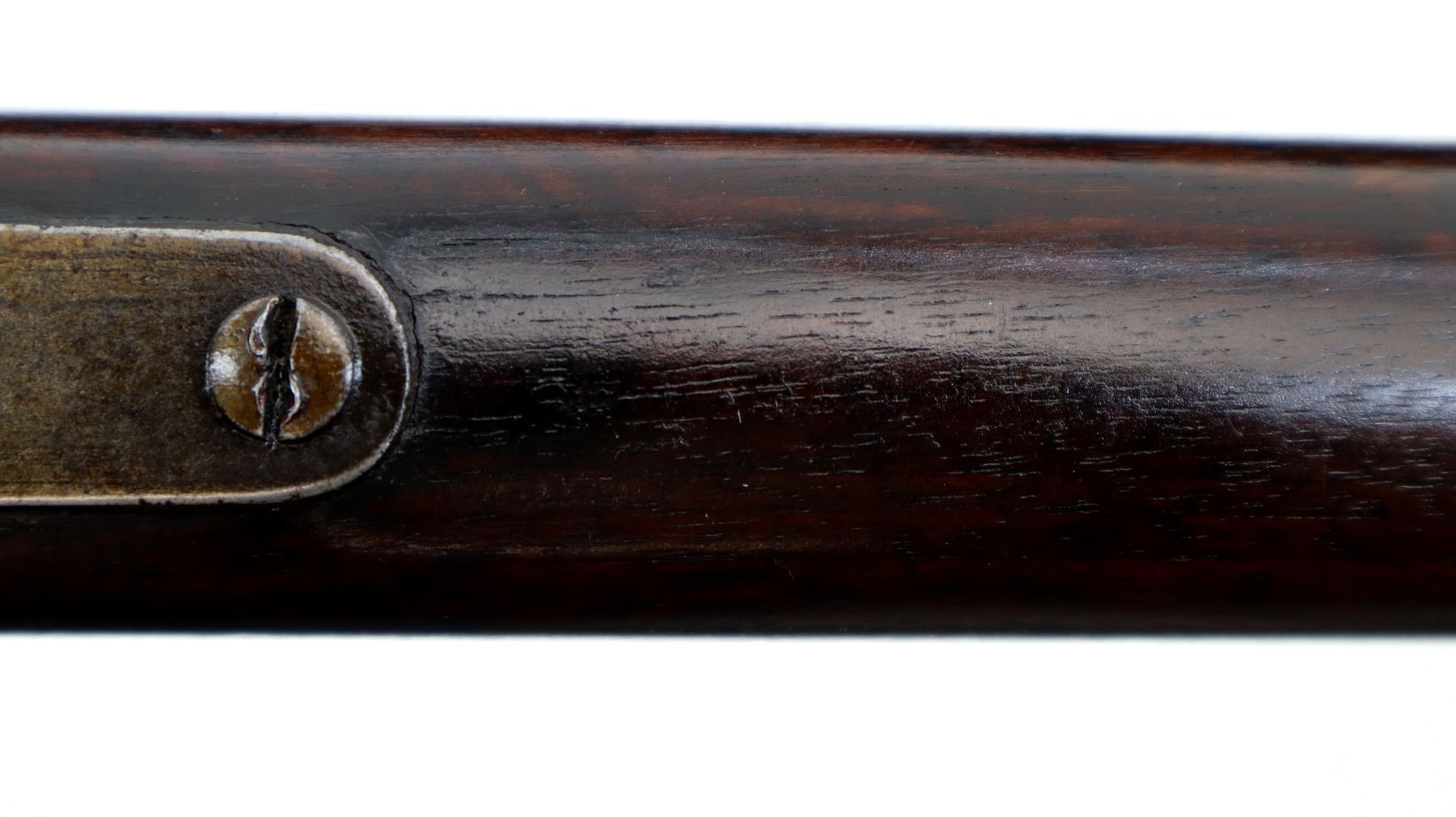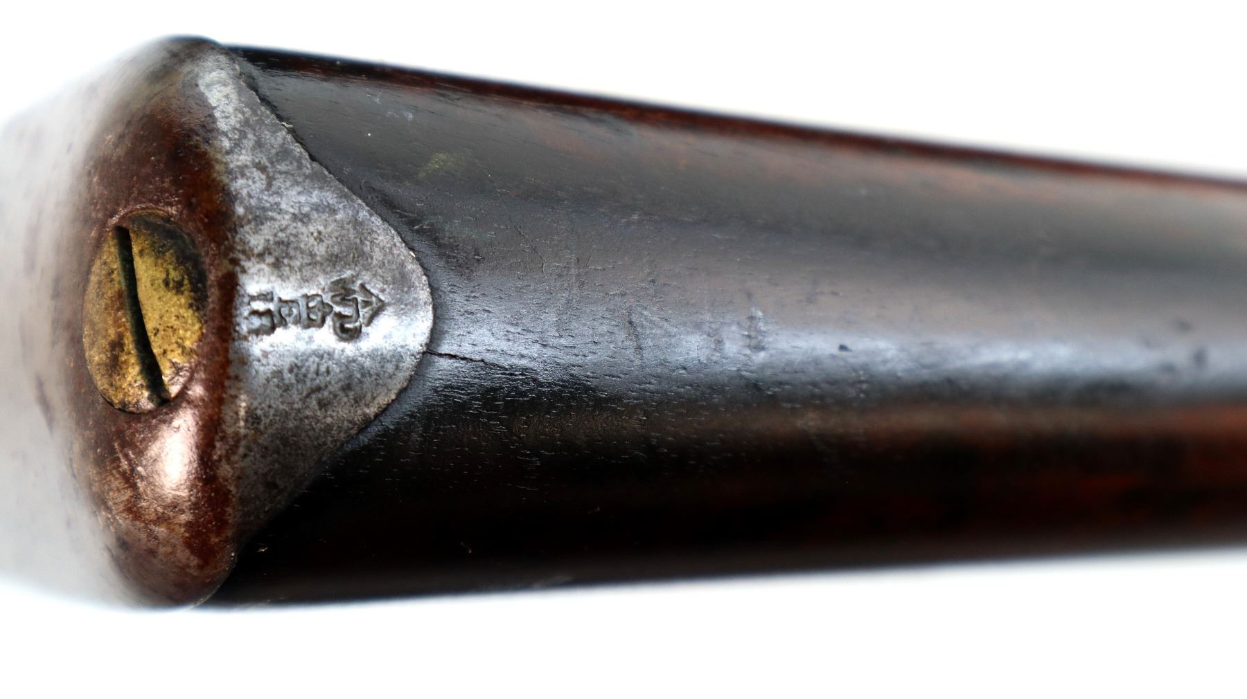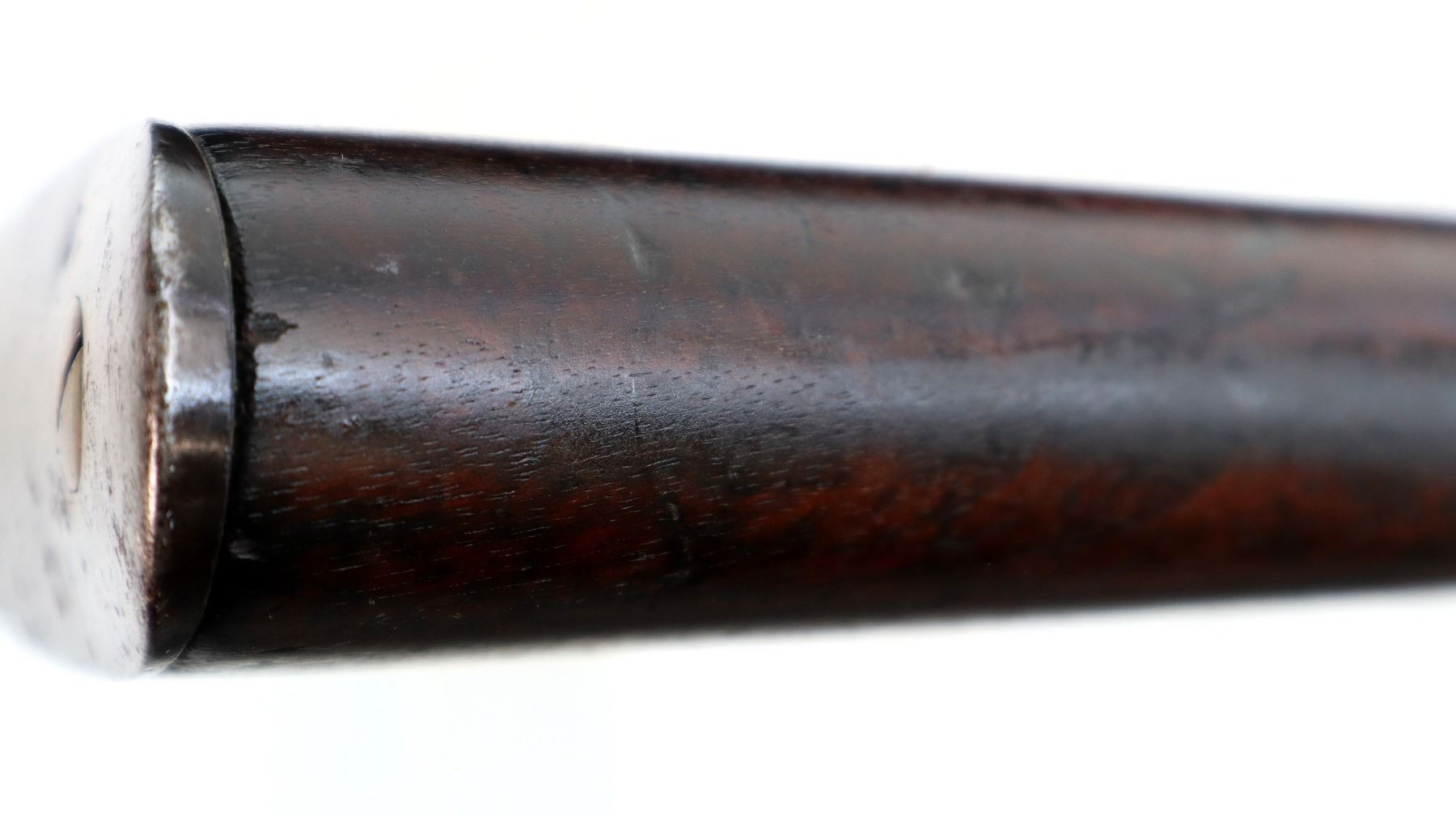 Main Description: Manufactured by Enfield 1887. Blade front sight with ramp, adjustable u notched ladder rear sight, blued finish, small cocking indicator and long lever. Two piece full military wood stocks, straight grip, smooth steel butt plate, various markings on right side of stock, sling swivels, cleaning rod, bayonet lug.