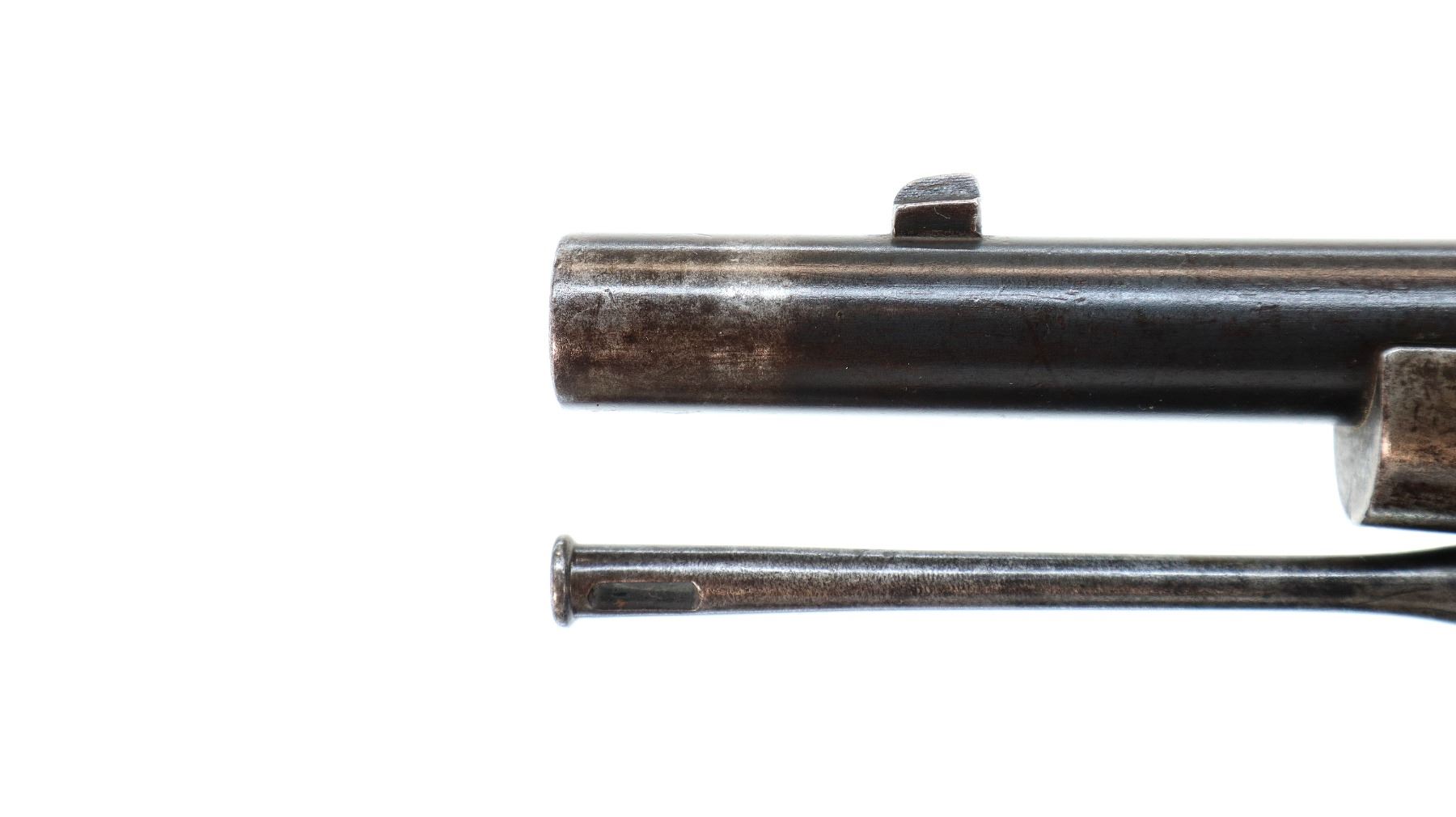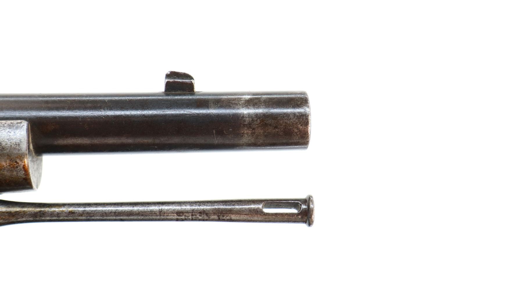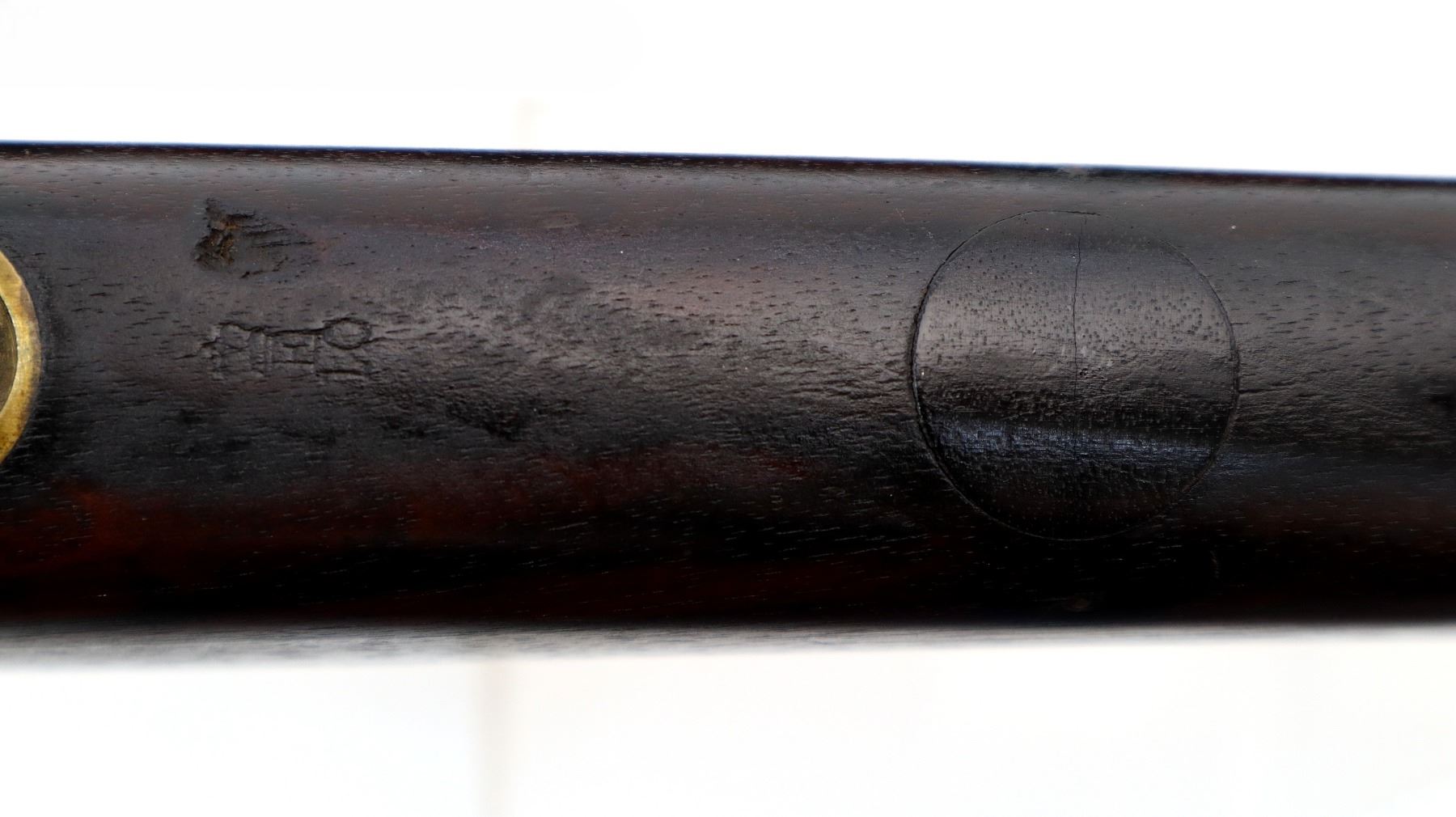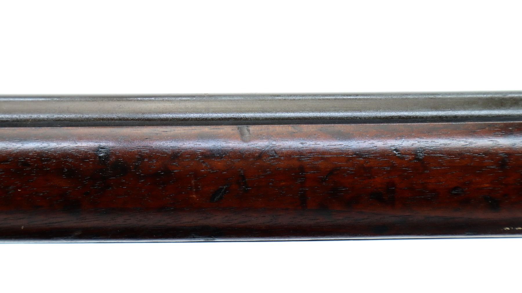 Main Description: Manufactured by Enfield 1887. Blade front sight with ramp, adjustable u notched ladder rear sight, blued finish, small cocking indicator and long lever. Two piece full military wood stocks, straight grip, smooth steel butt plate, various markings on right side of stock, sling swivels, cleaning rod, bayonet lug.