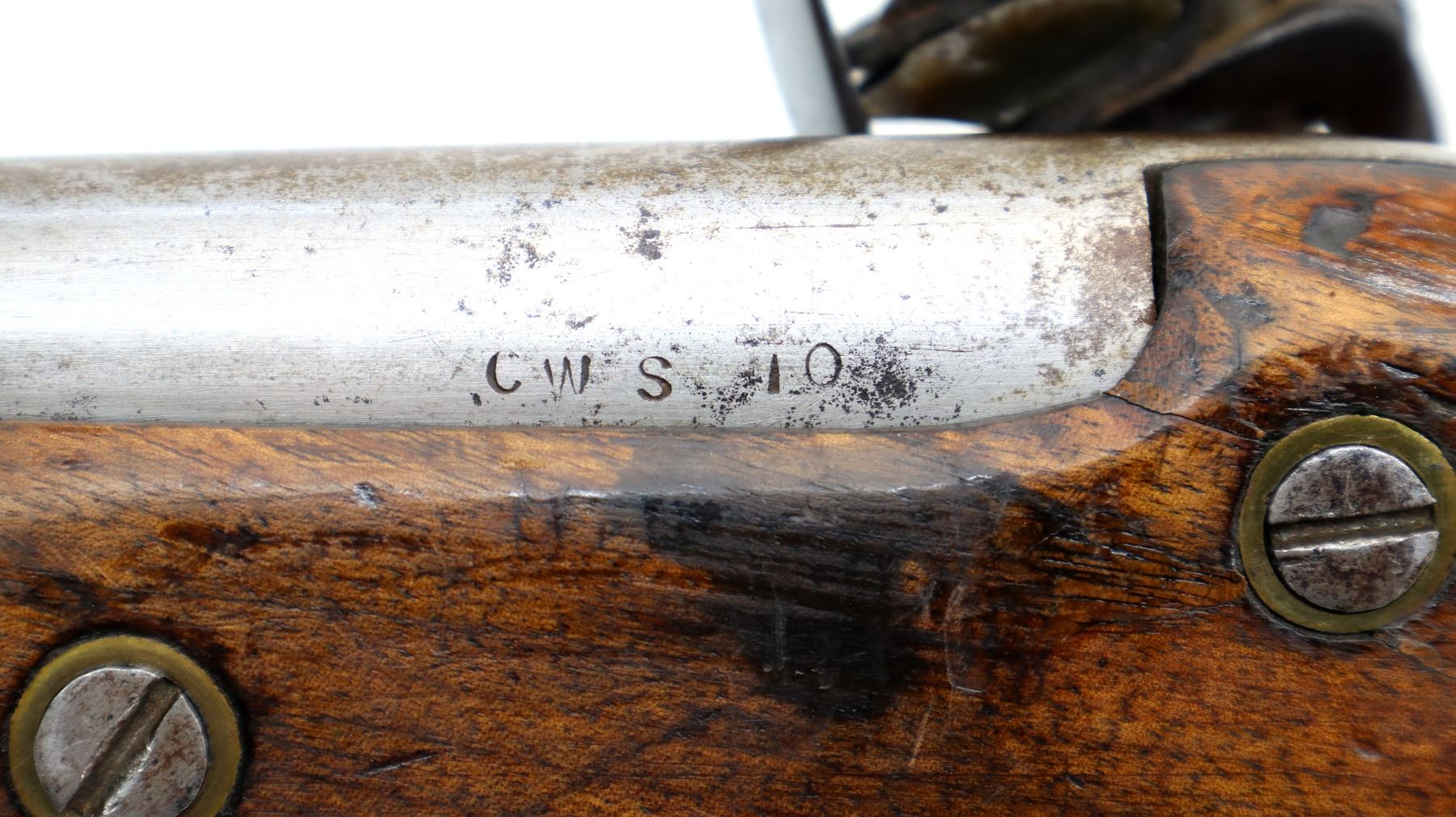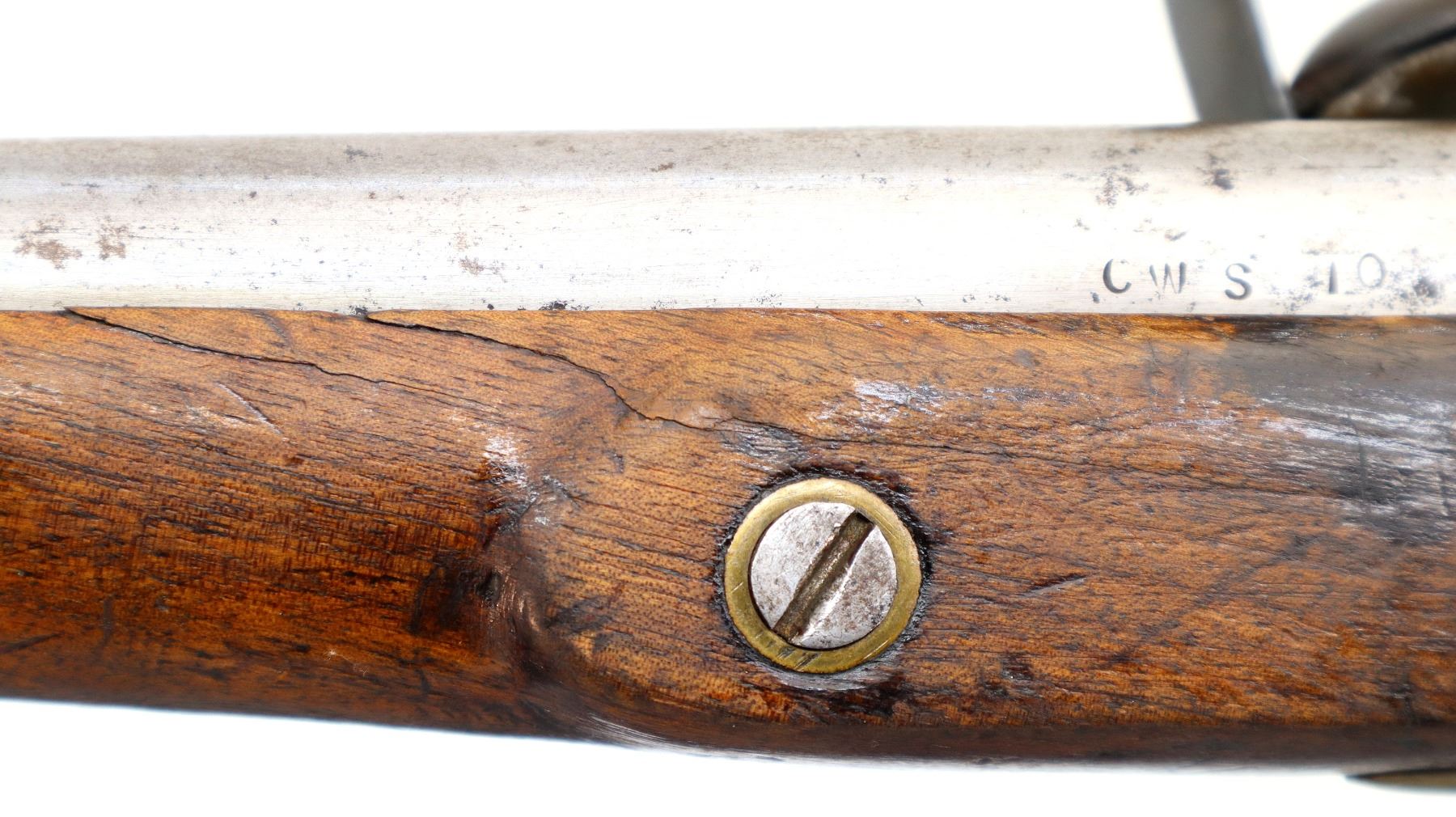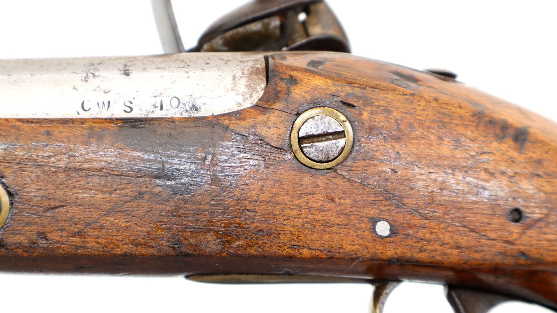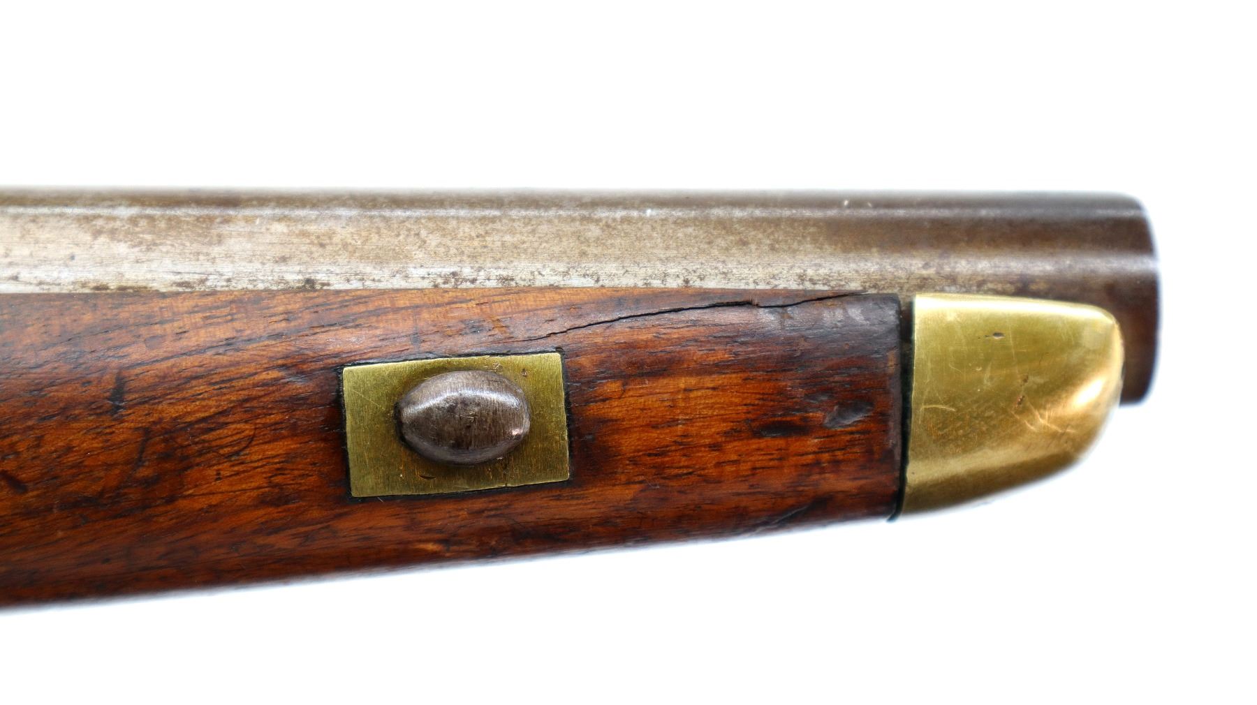 Main Description: No sights, tapered round barrel, smooth lock with initials CL logo, hammer and frizzen that function. One piece wood grip, forearm is cracked with single wedge, pistol grip, brass pommel cap with steel ring, stock cracked on left side, brass trigger guard and nose cap.
