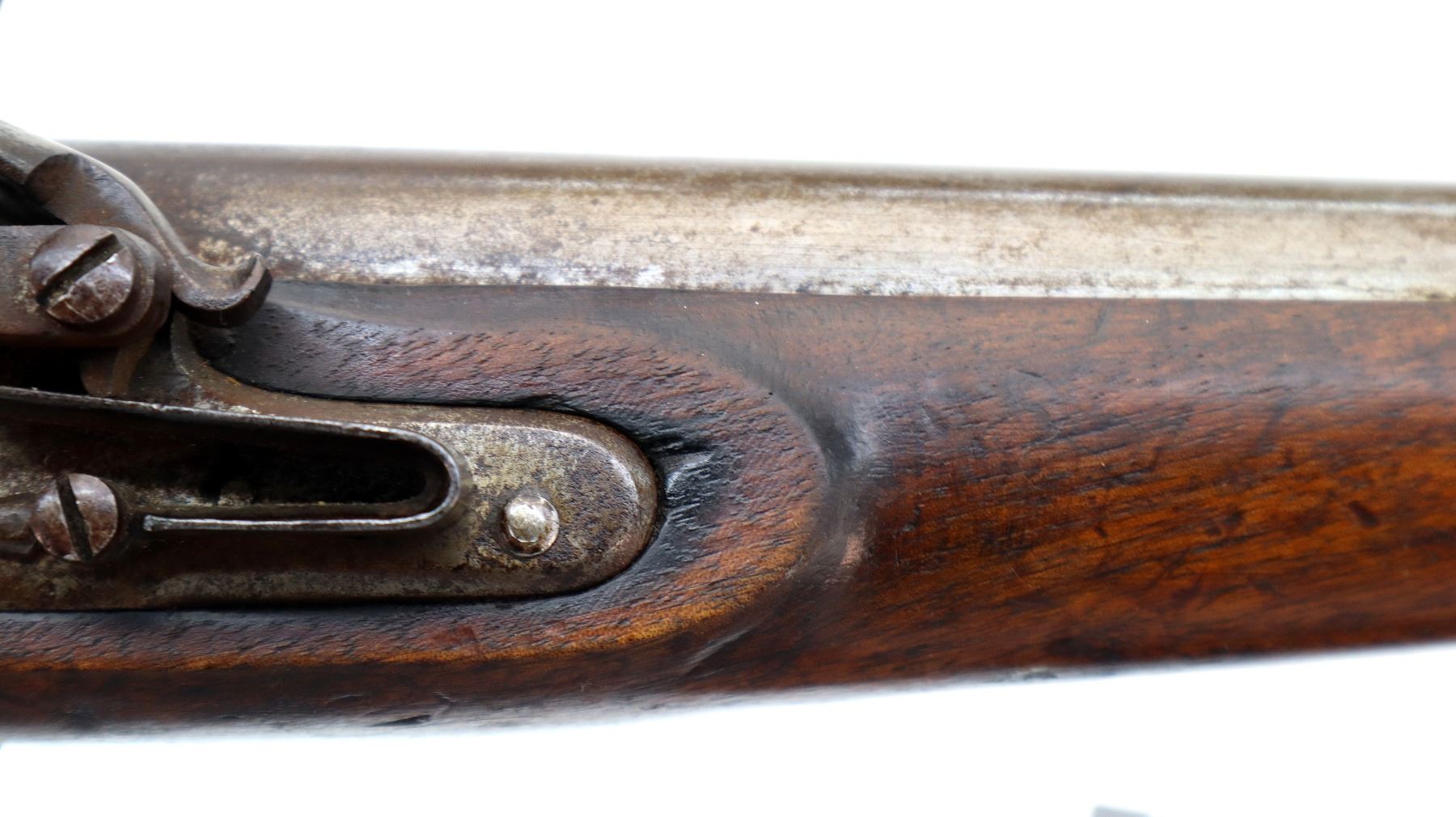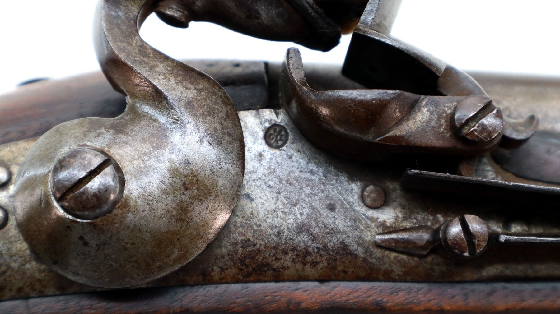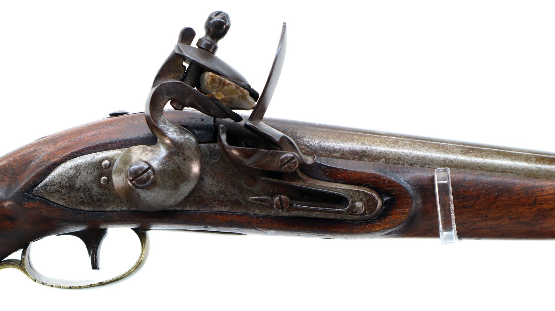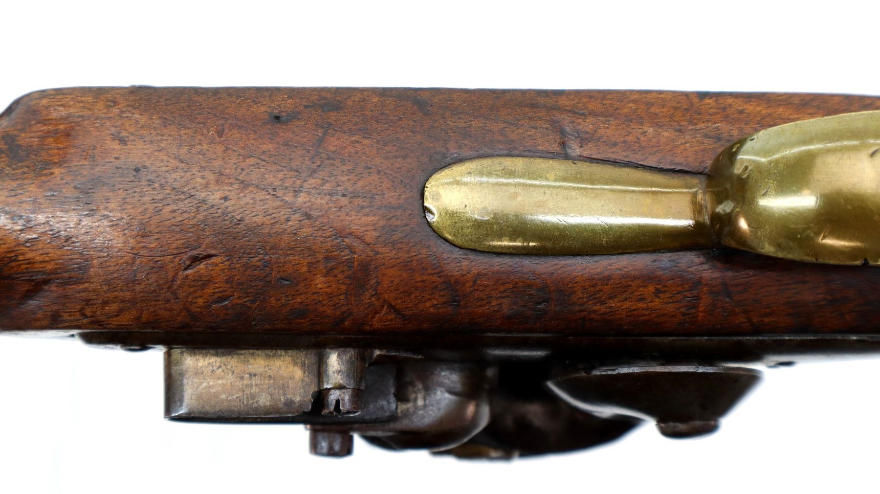 Main Description: No sights, tapered round barrel, smooth lock with initials CL logo, hammer and frizzen that function. One piece wood grip, forearm is cracked with single wedge, pistol grip, brass pommel cap with steel ring, stock cracked on left side, brass trigger guard and nose cap.