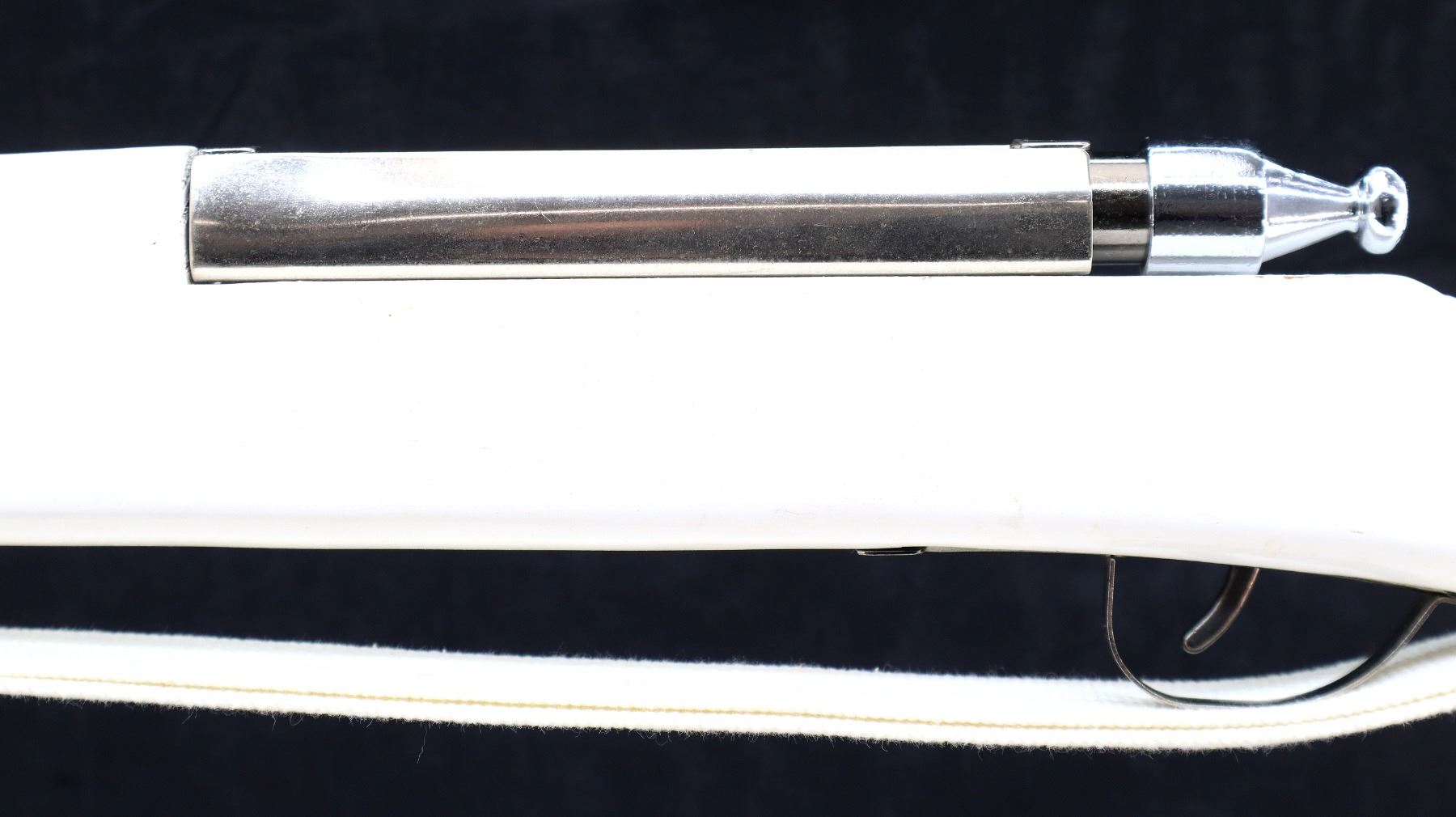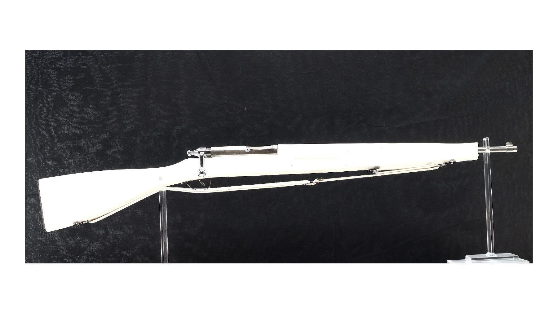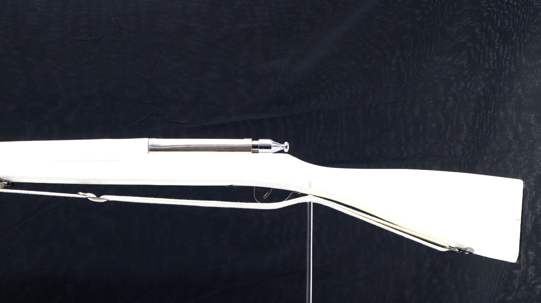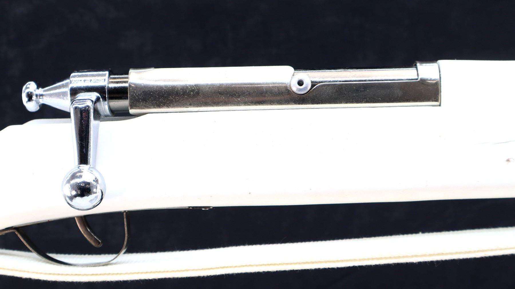 Main Description: Blade front sight, no rear sight, chrome finish, bolt moves action clicks when trigger is pulled. One piece white painted wood stock with age cracks, finger grooved forearm, straight grip, textured black polymer butt plate, sling swivels with white cotton sling.