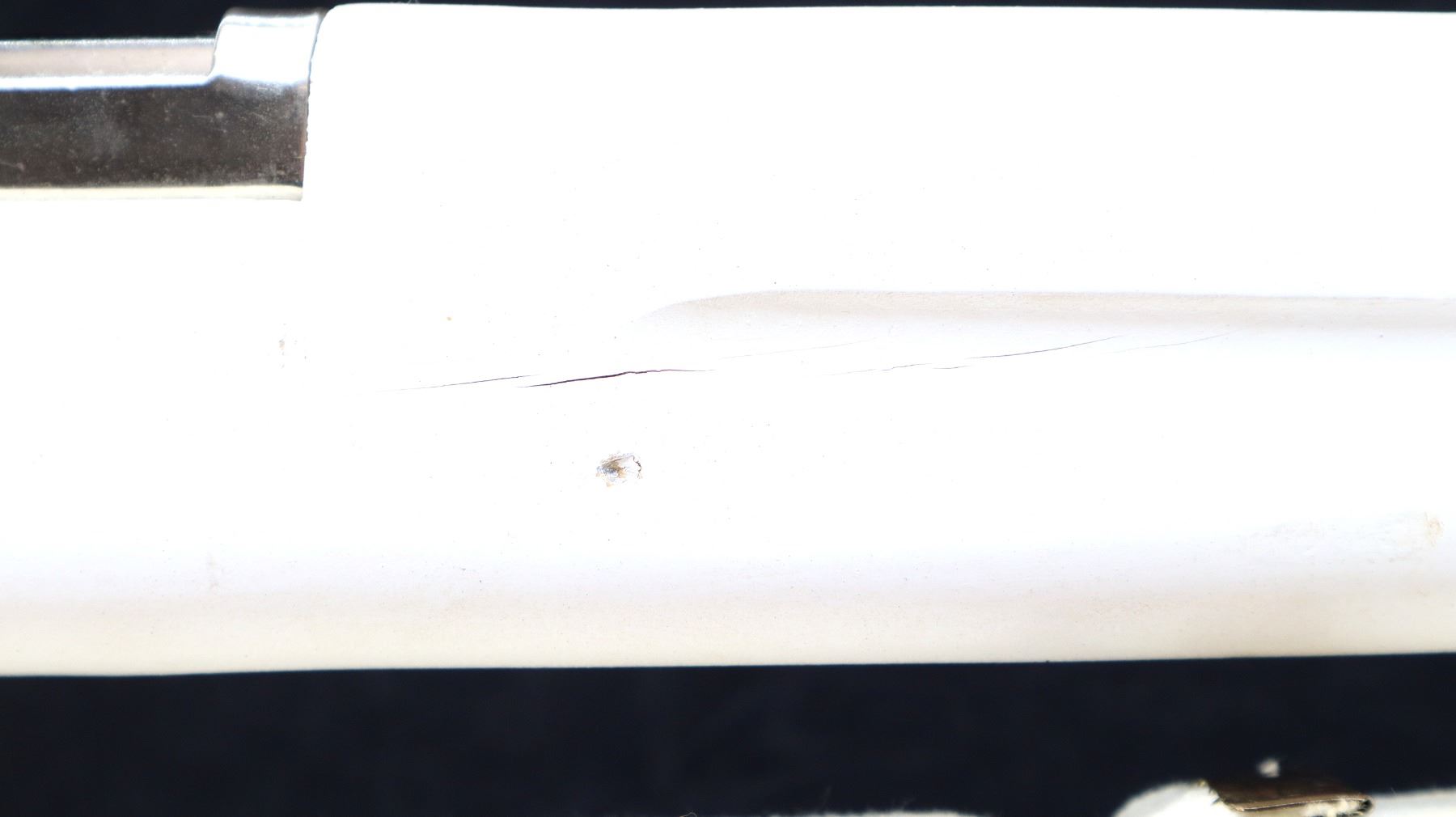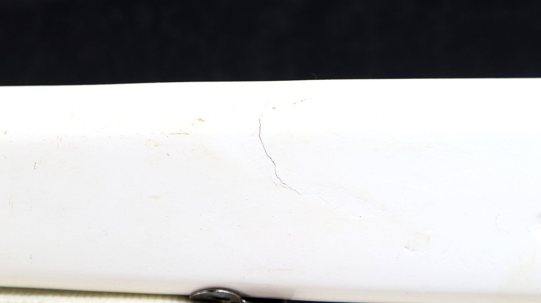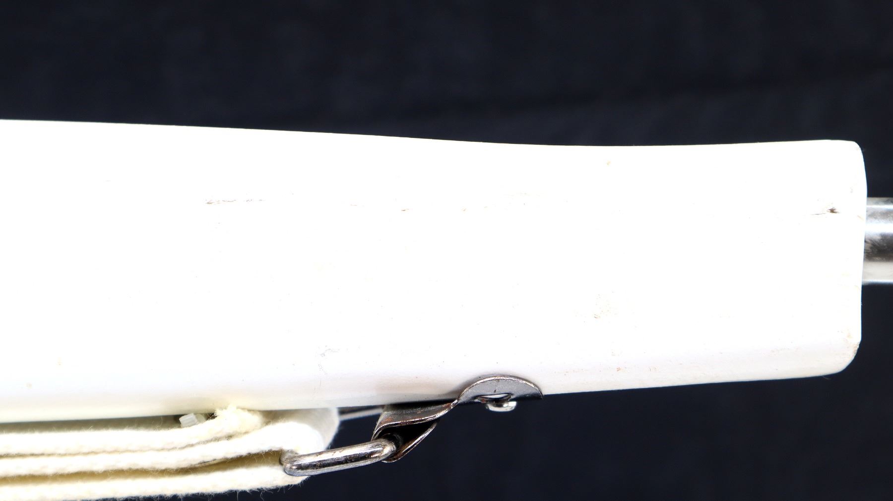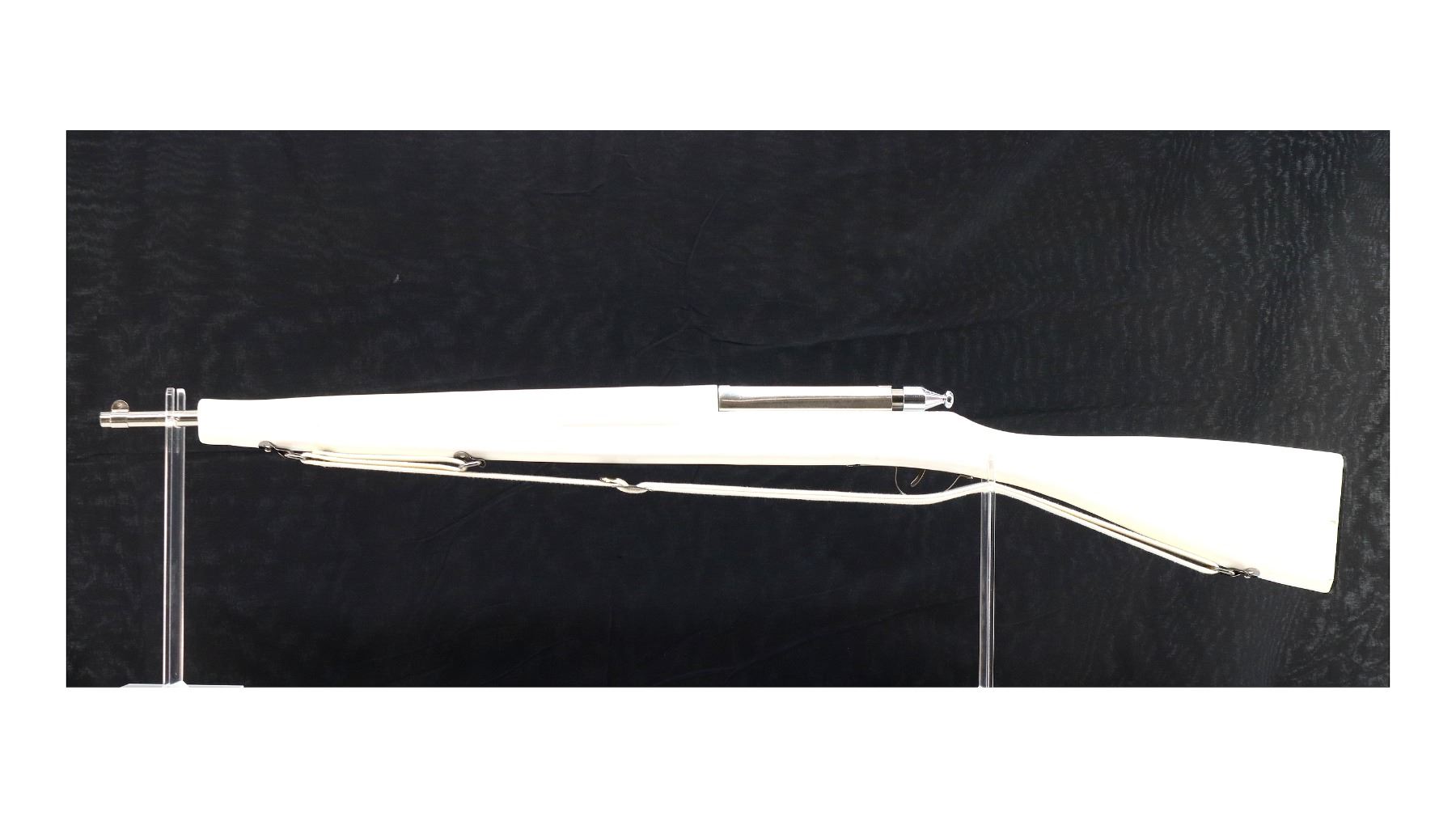 Main Description: Blade front sight, no rear sight, chrome finish, bolt moves action clicks when trigger is pulled. One piece white painted wood stock with age cracks, finger grooved forearm, straight grip, textured black polymer butt plate, sling swivels with white cotton sling.