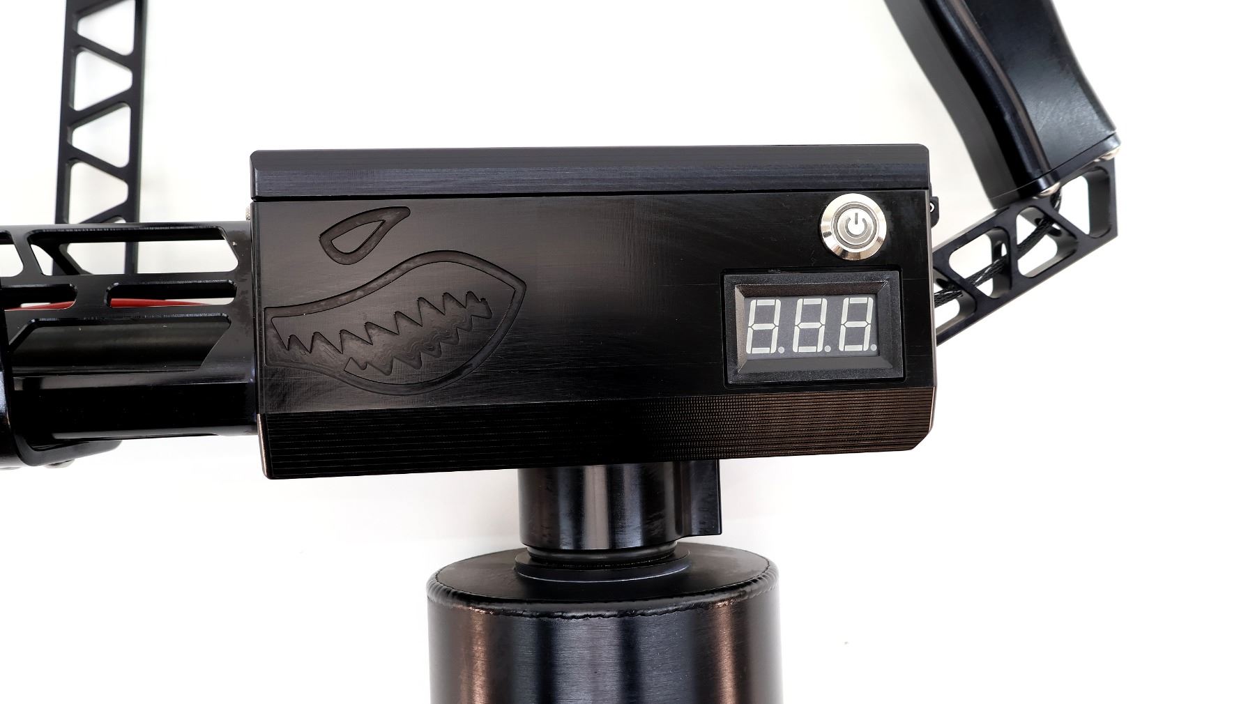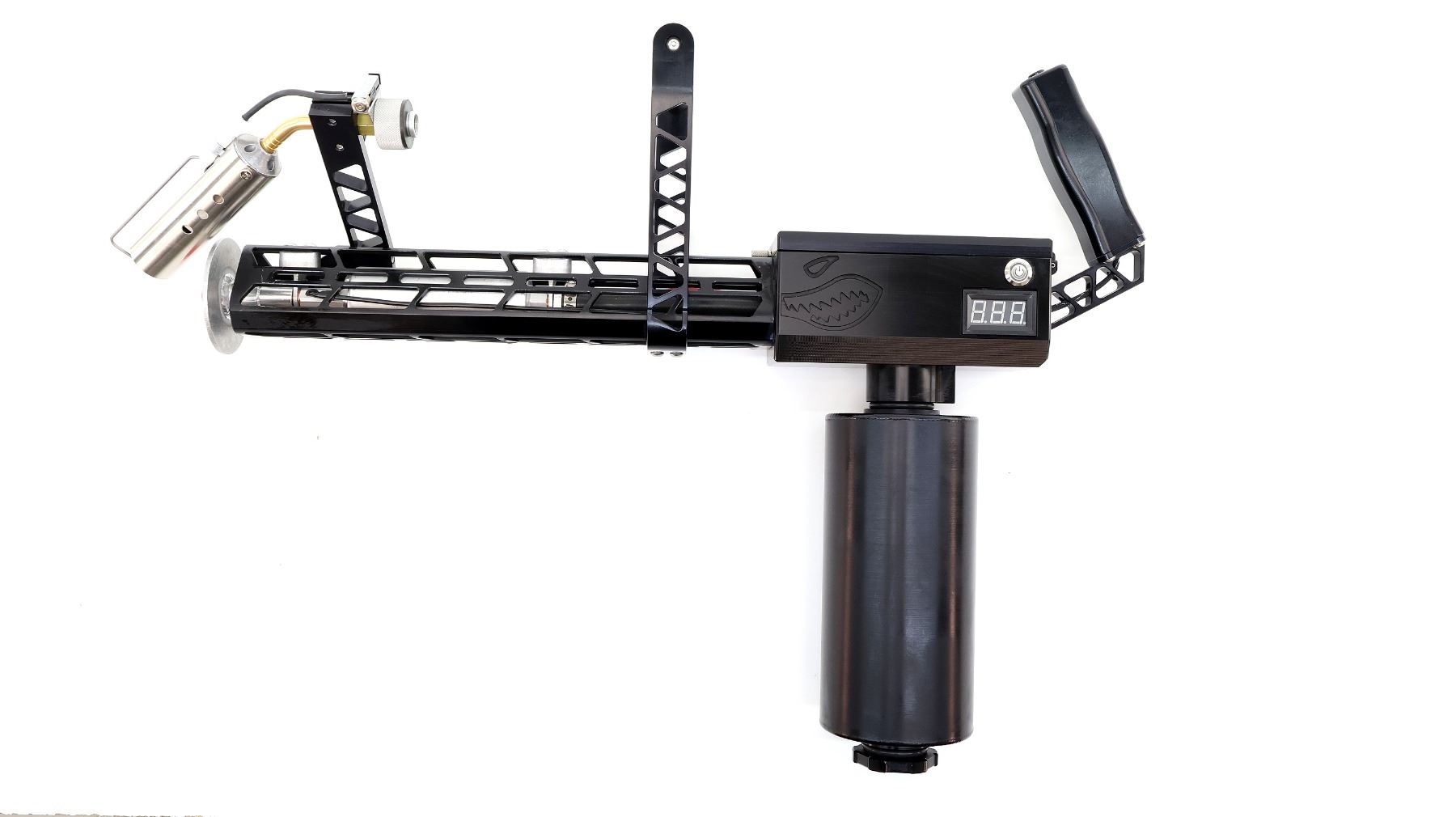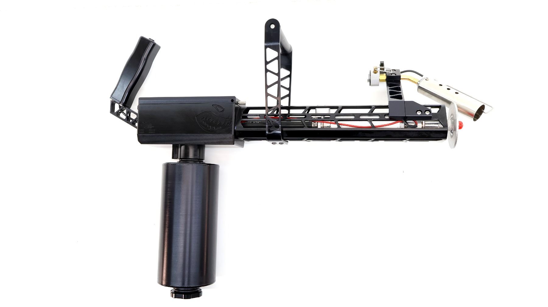 Main Description: No sights, uses Gasoline, Gasoline Diesel mixture or Ethanol, requires a butane/propane canister for pilot light, has a Turnigy high discharge Li-Po battery unsure how to charge. Igniter mounted above left side of barrel, black alloy and polymer construction, chainsaw type carrying handle, vertical pistol grip with firing button, power indicator on left side, large fuel tank mounted on bottom, more details can be found online.