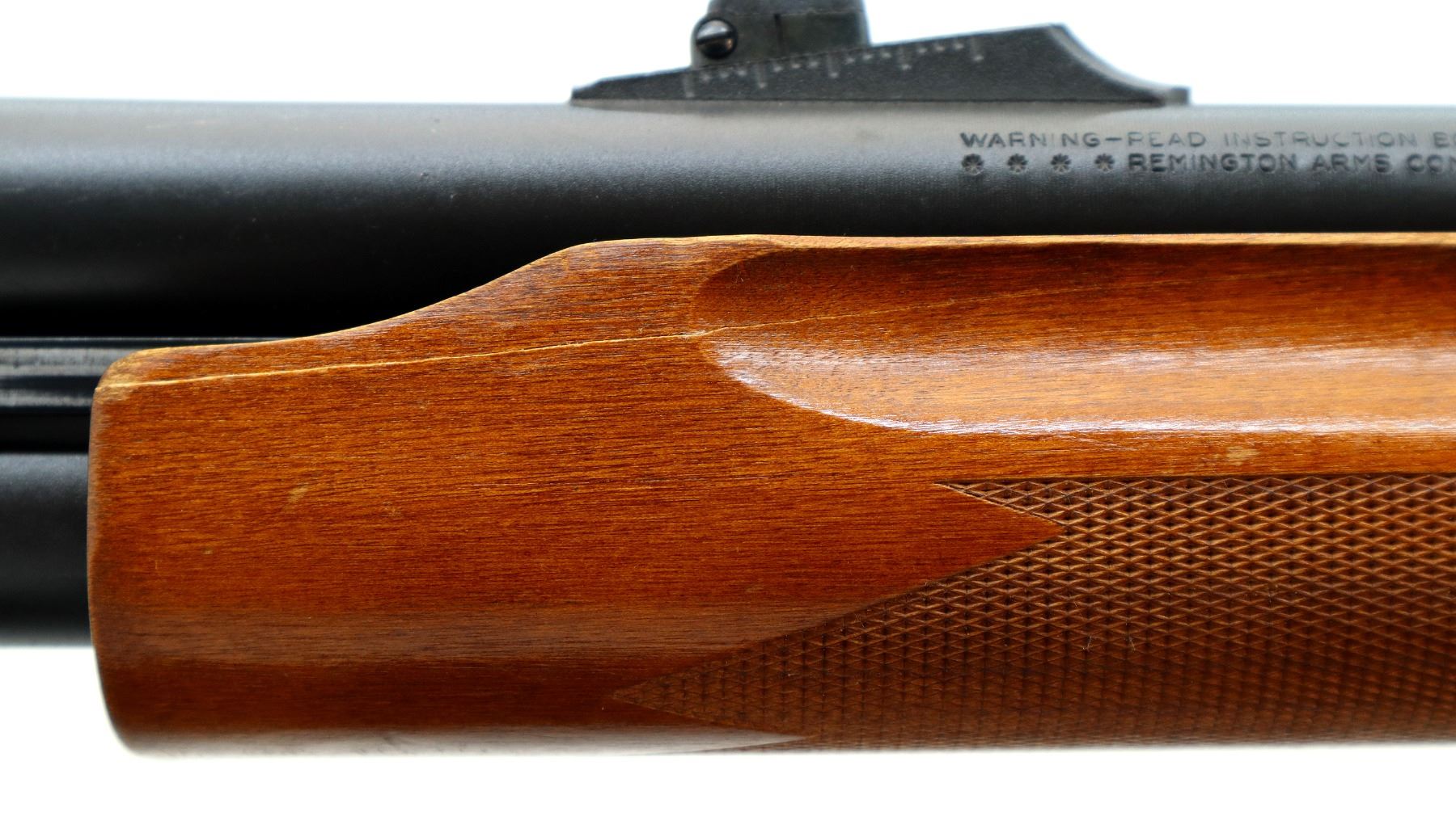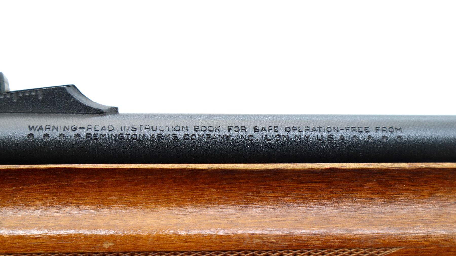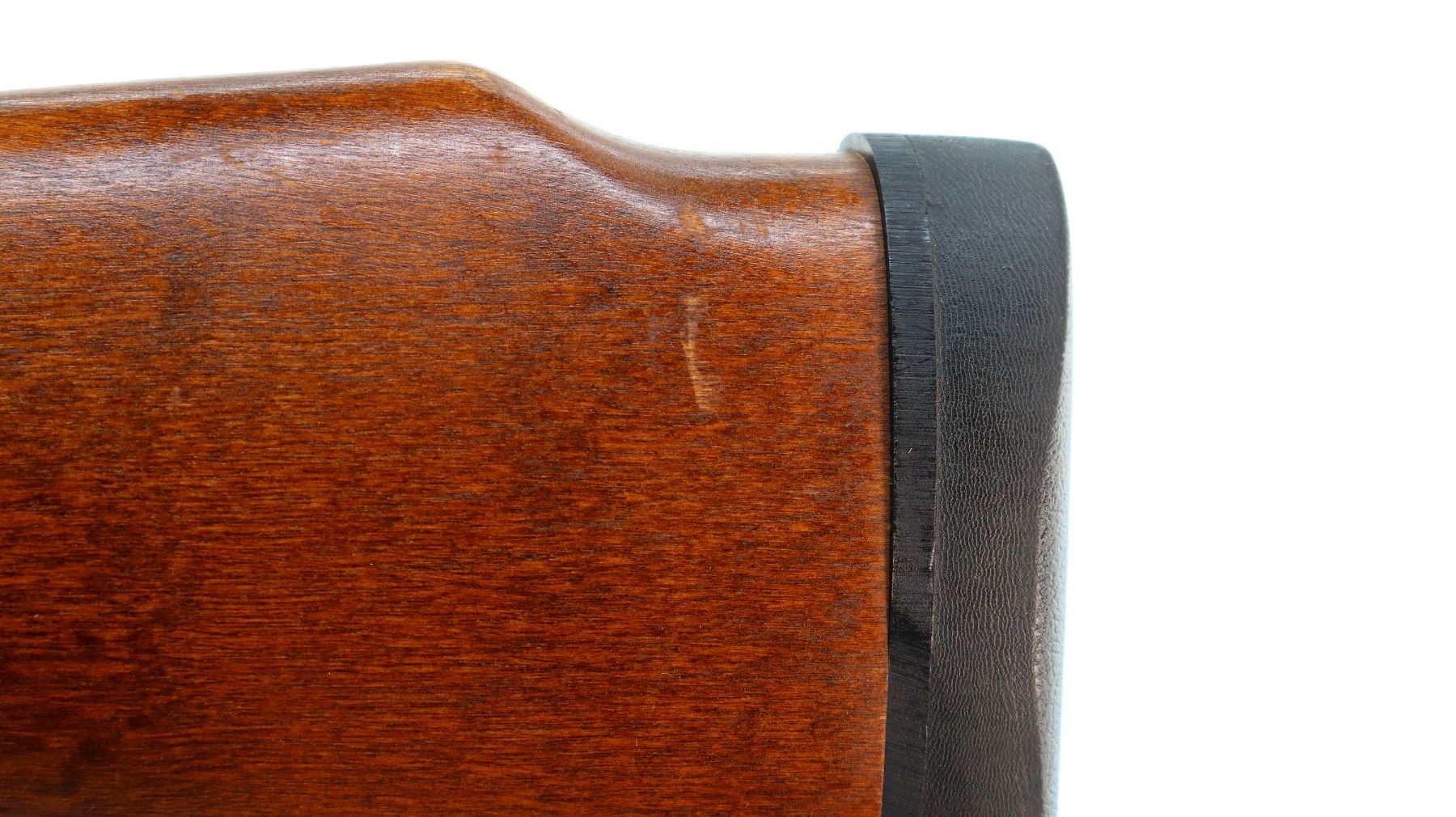 Main Description: Blade front sight with ramp, adjustable u notched rear sight, Parkerized metal finish. Two piece wood stocks, finger grooved checkered forearm (cracked on right side) and pistol grip, raised comb, black rubber recoil pad, 14.25" LOP, sling swivels with brown leather sling.