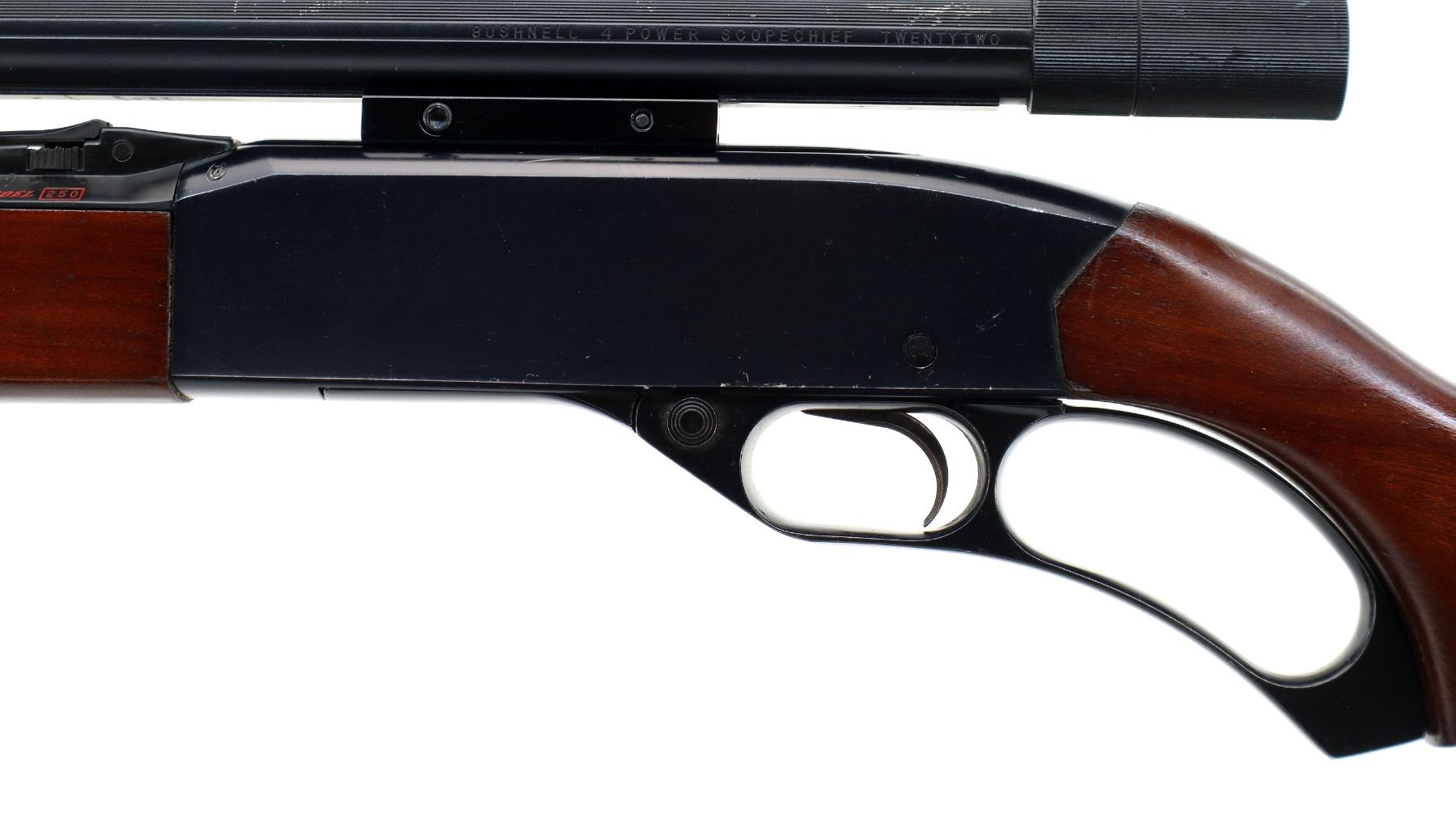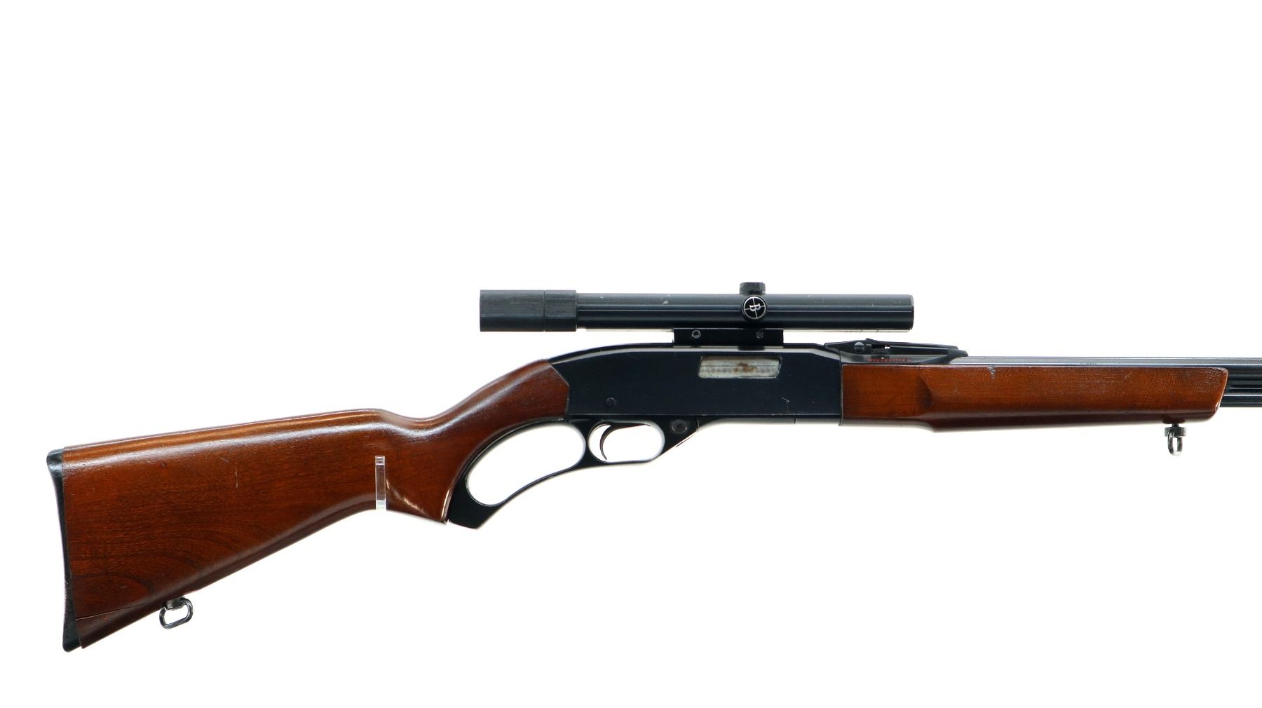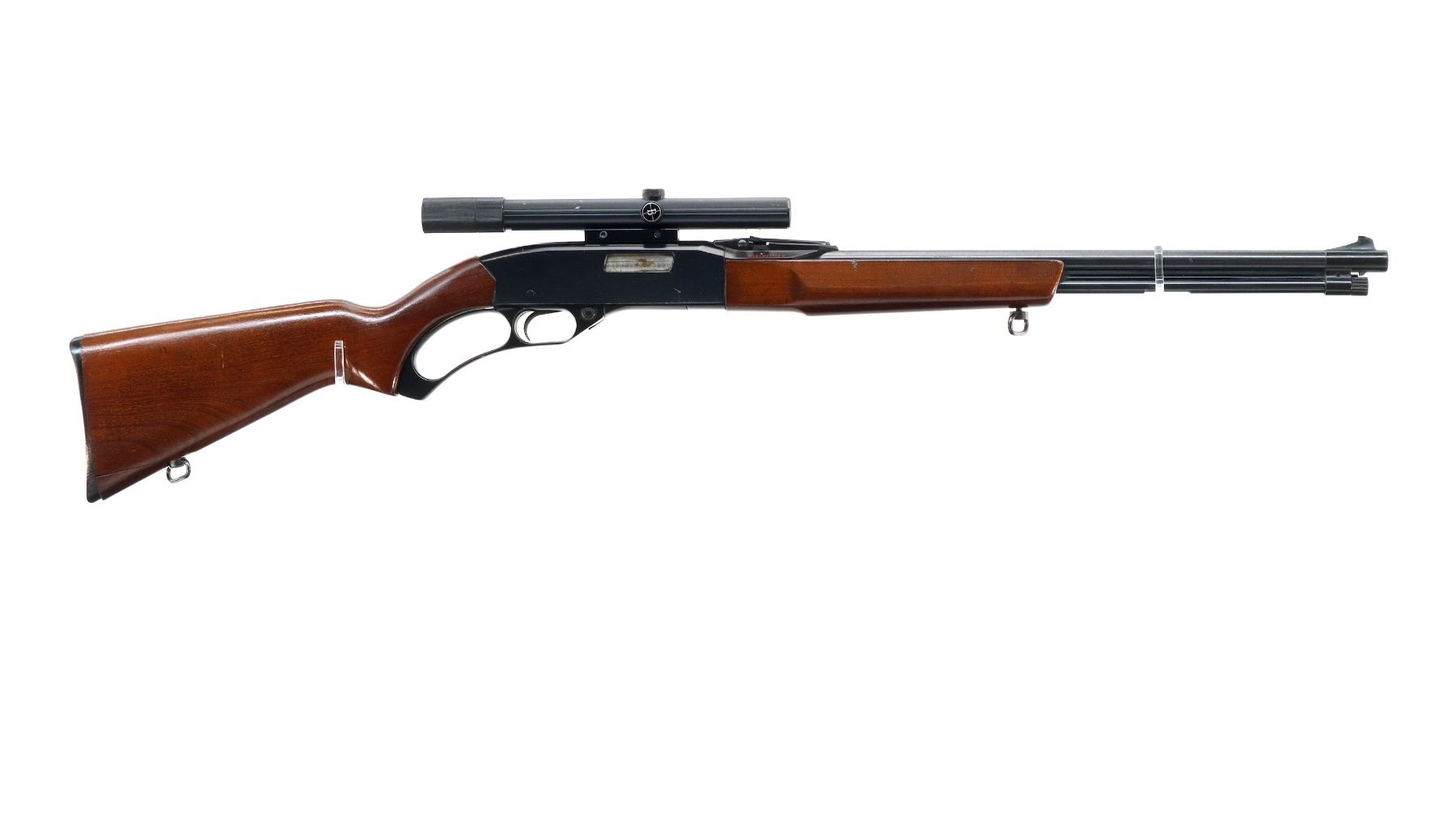 Main Description: Blade front sight, adjustable u notched rear sight with numbers/letters stamped on left side, blued barrel and outer magtube, grooved black alloy receiver with Bushnell 4 power Scopechief twenty two scope installed, clear optics with fine crosshair. Two piece wood stocks, pistol grip, small chips behind receiver, grooved black polymer butt plate, stock cracked at toe, sling swivels.