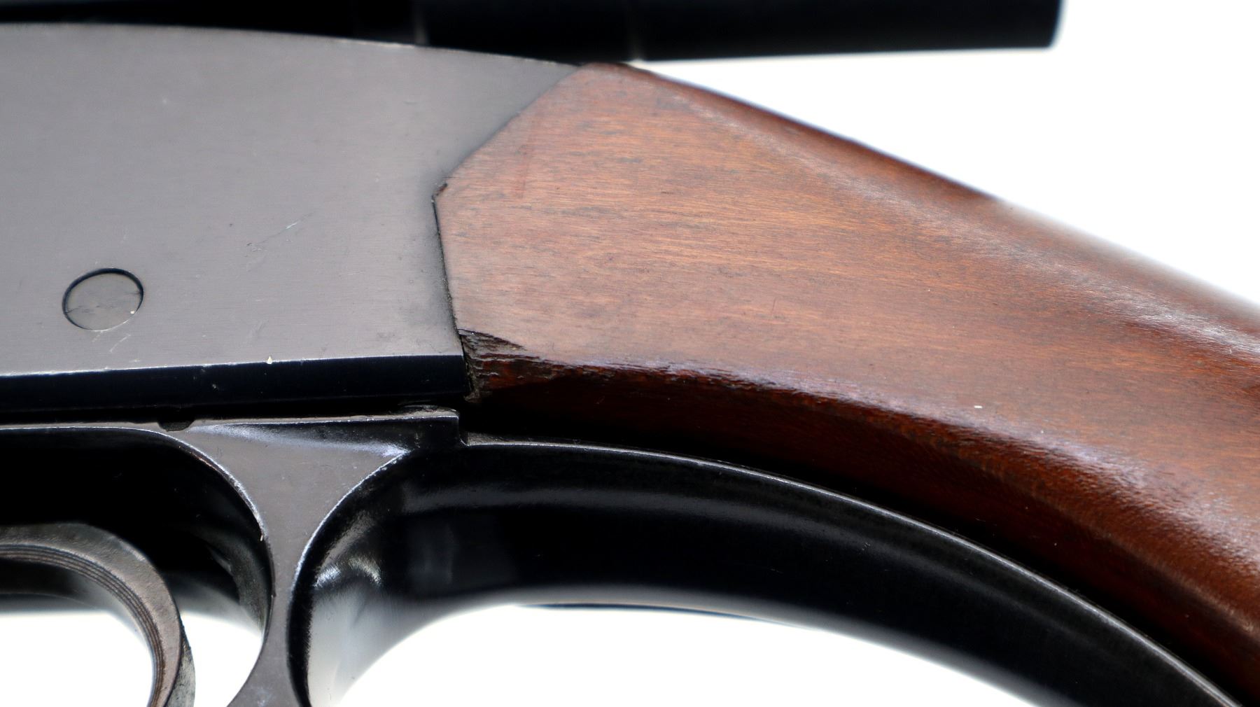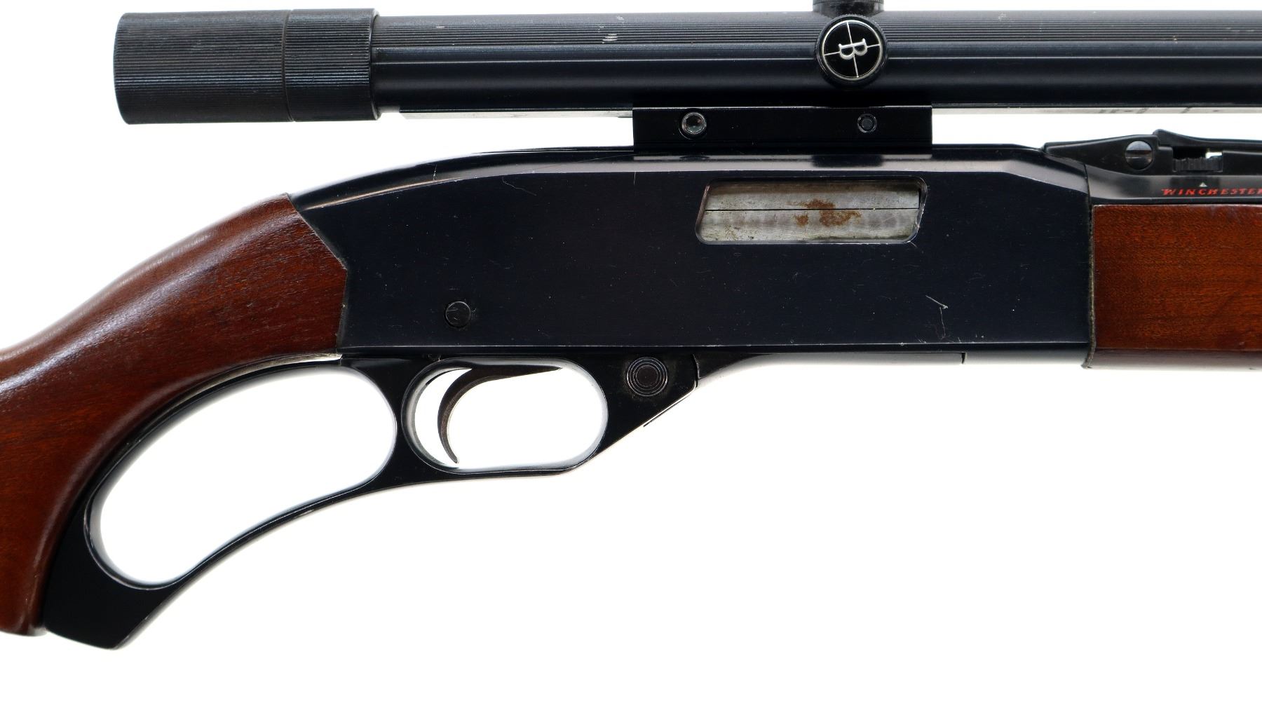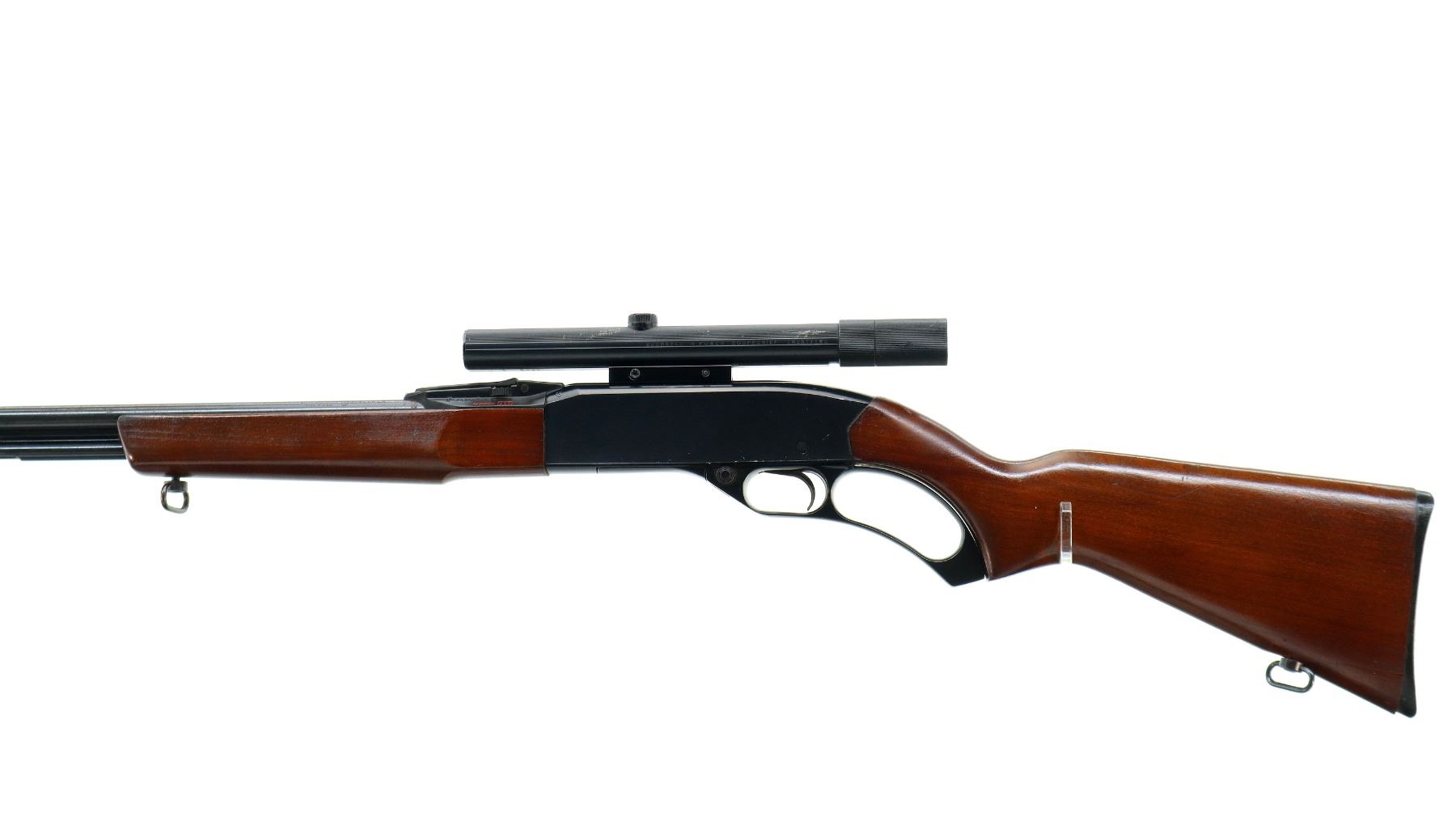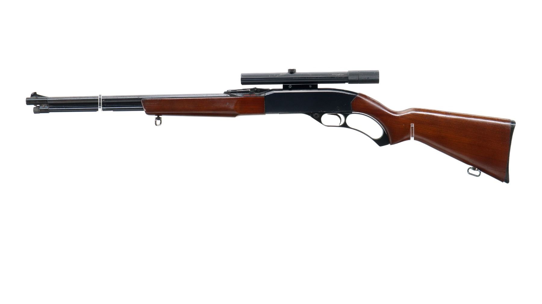 Main Description: Blade front sight, adjustable u notched rear sight with numbers/letters stamped on left side, blued barrel and outer magtube, grooved black alloy receiver with Bushnell 4 power Scopechief twenty two scope installed, clear optics with fine crosshair. Two piece wood stocks, pistol grip, small chips behind receiver, grooved black polymer butt plate, stock cracked at toe, sling swivels.