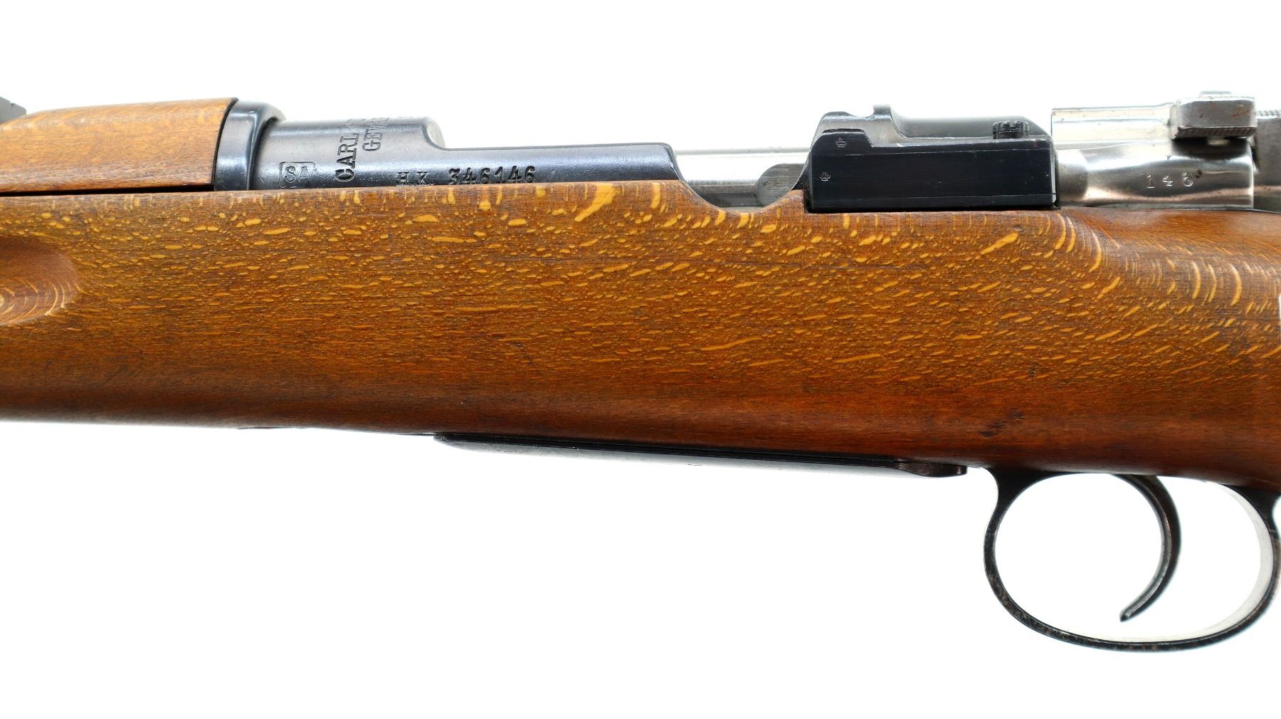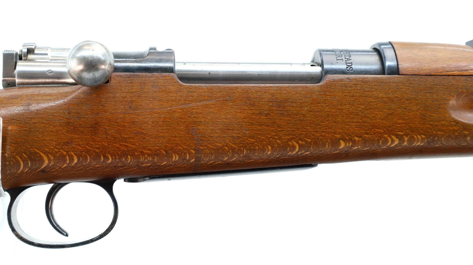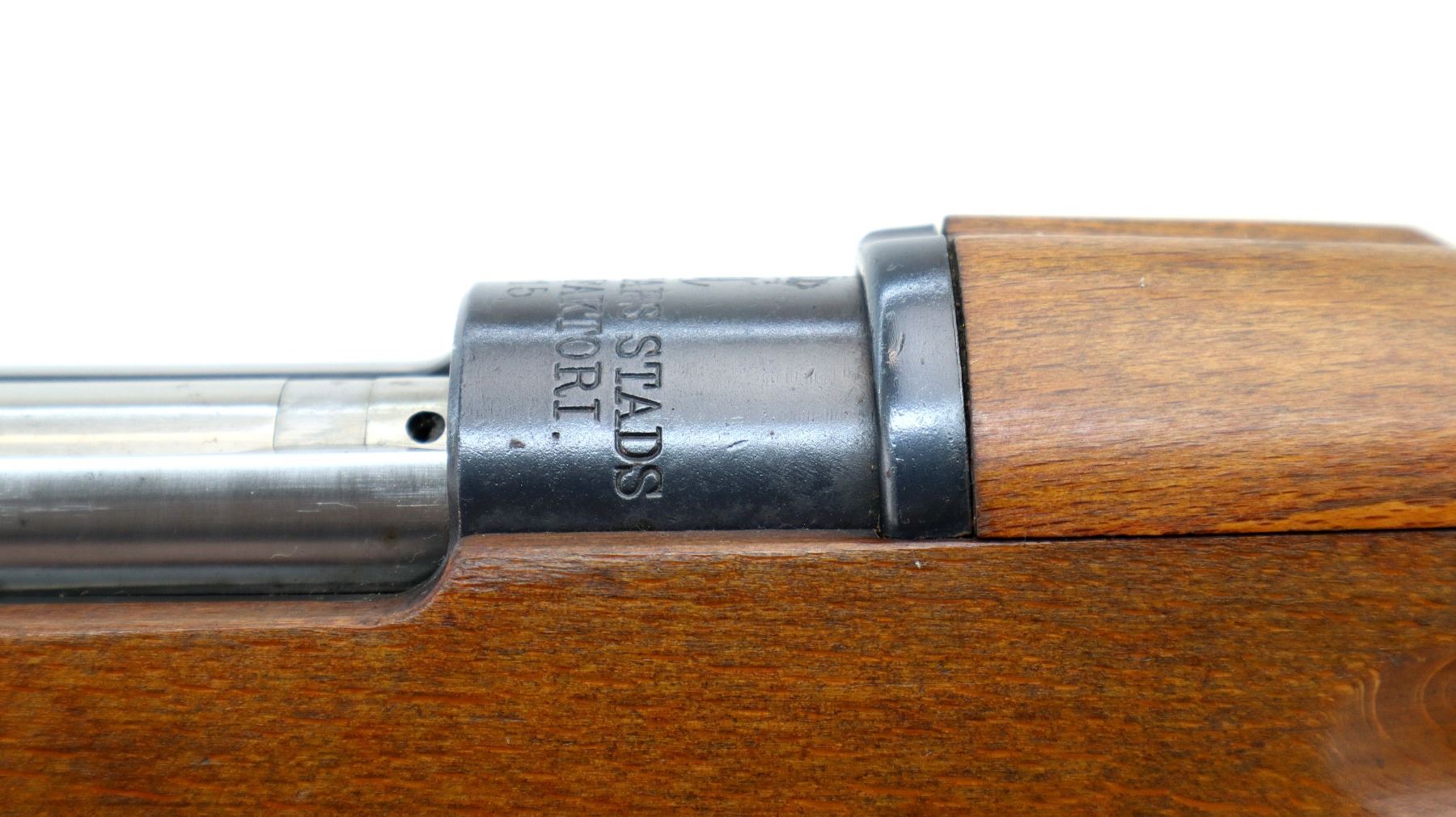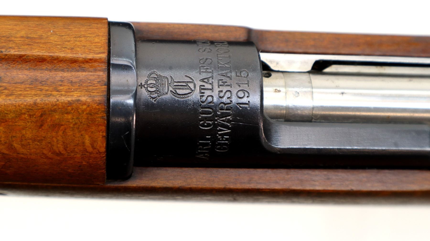 Main Description: Manufactured by Carl Gustafs 1915, visible serial numbers match. Blade front sight with ramp, adjustable u notched rear sight, blued finish, receiver has SA stamped in a box indicating Finnish Military ownership, silver bolt with straight handle. Two piece full military wood stocks, finger grooved forearm, stock chipped and cracked in front of trigger guard, straight grip cracked behind receiver, smooth steel butt plate, brass stock disk, sling swivels, cleaning rod and bayonet lug.