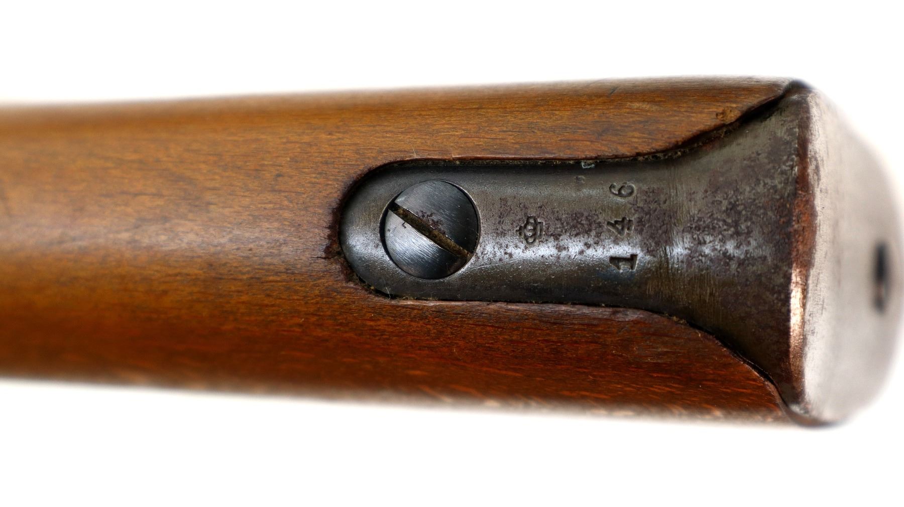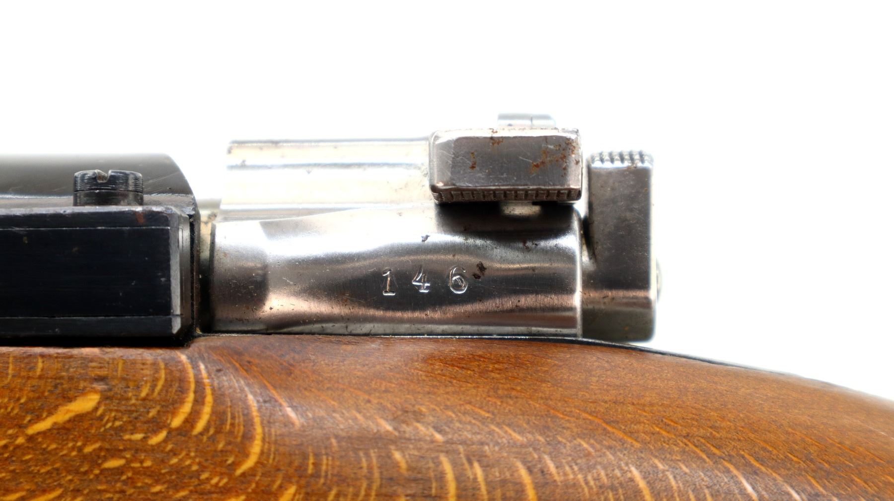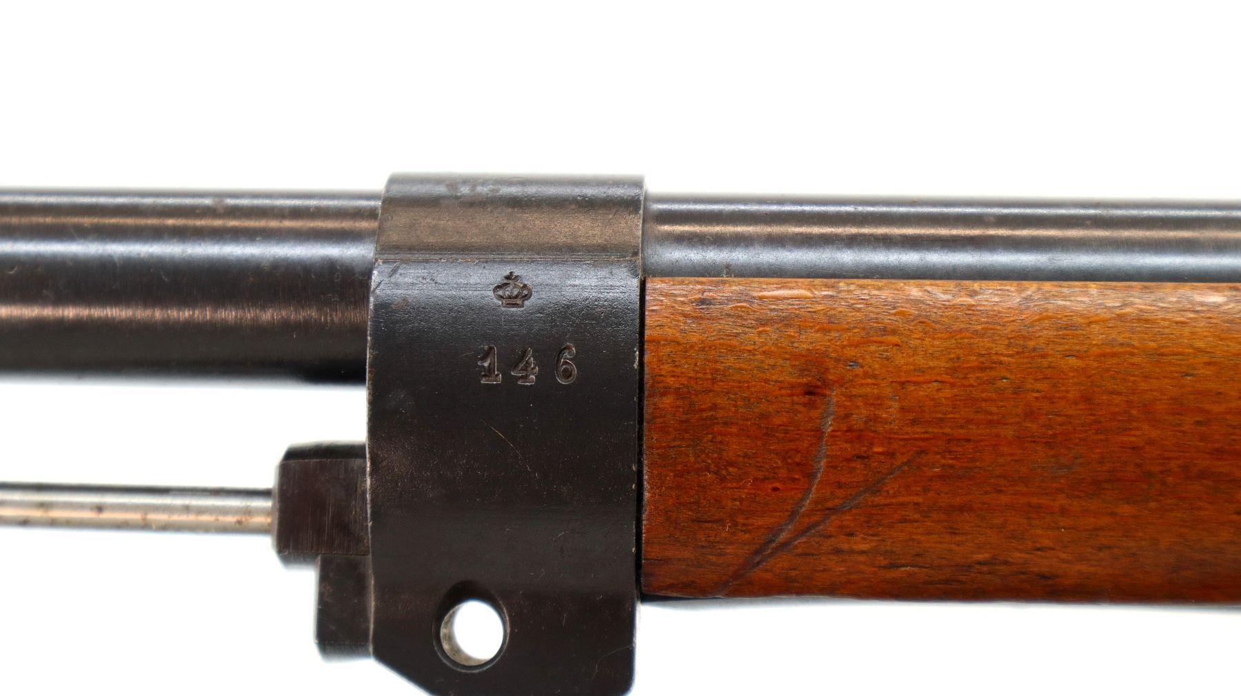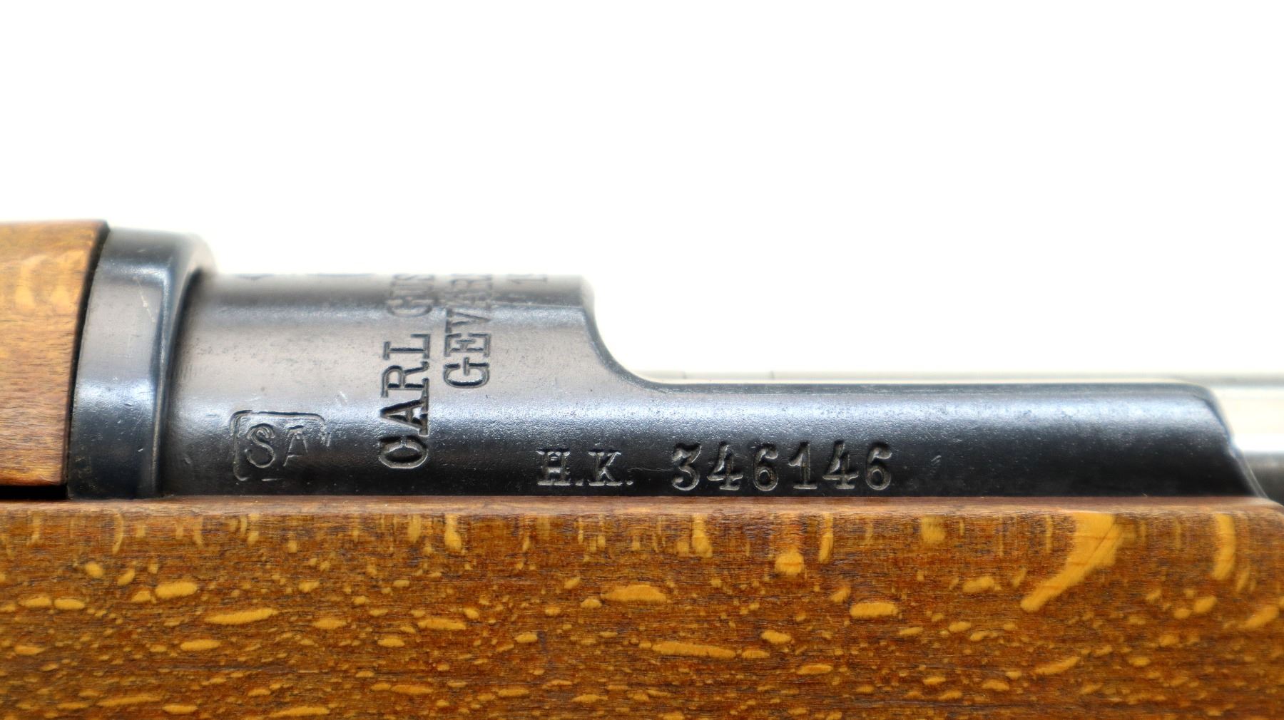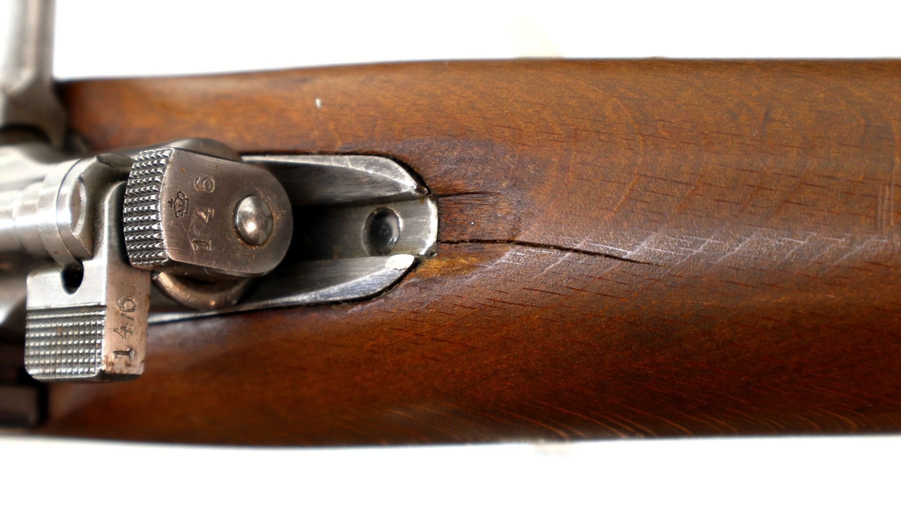 Main Description: Manufactured by Carl Gustafs 1915, visible serial numbers match. Blade front sight with ramp, adjustable u notched rear sight, blued finish, receiver has SA stamped in a box indicating Finnish Military ownership, silver bolt with straight handle. Two piece full military wood stocks, finger grooved forearm, stock chipped and cracked in front of trigger guard, straight grip cracked behind receiver, smooth steel butt plate, brass stock disk, sling swivels, cleaning rod and bayonet lug.