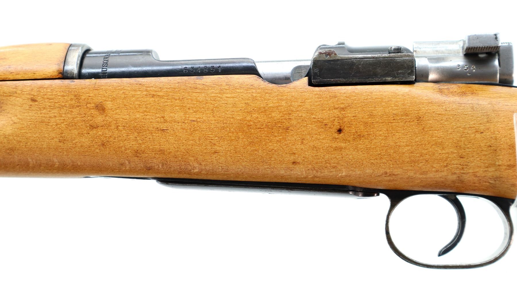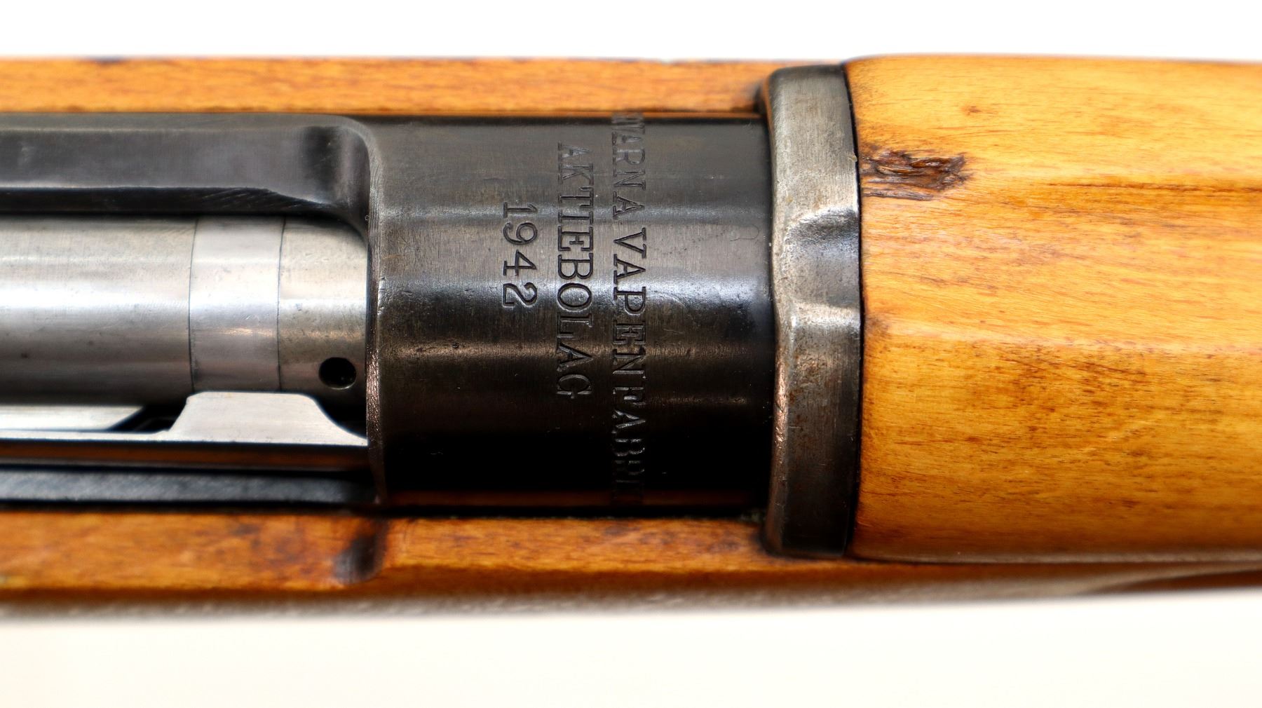 Main Description: Manufactured by Husqvarna 1942, arsenal rebuilt numbered to match except floor plate. Blade front sight with ramp, adjustable u notched rear sight, blued finish, silver bolt with turned down handle. Two piece full military wood stocks, finger grooved forearm, straight grip, smooth steel butt plate, stock cracked on left side, brass stock disk, sling swivels, cleaning rod, bayonet lug, threaded muzzle with plastic cap.