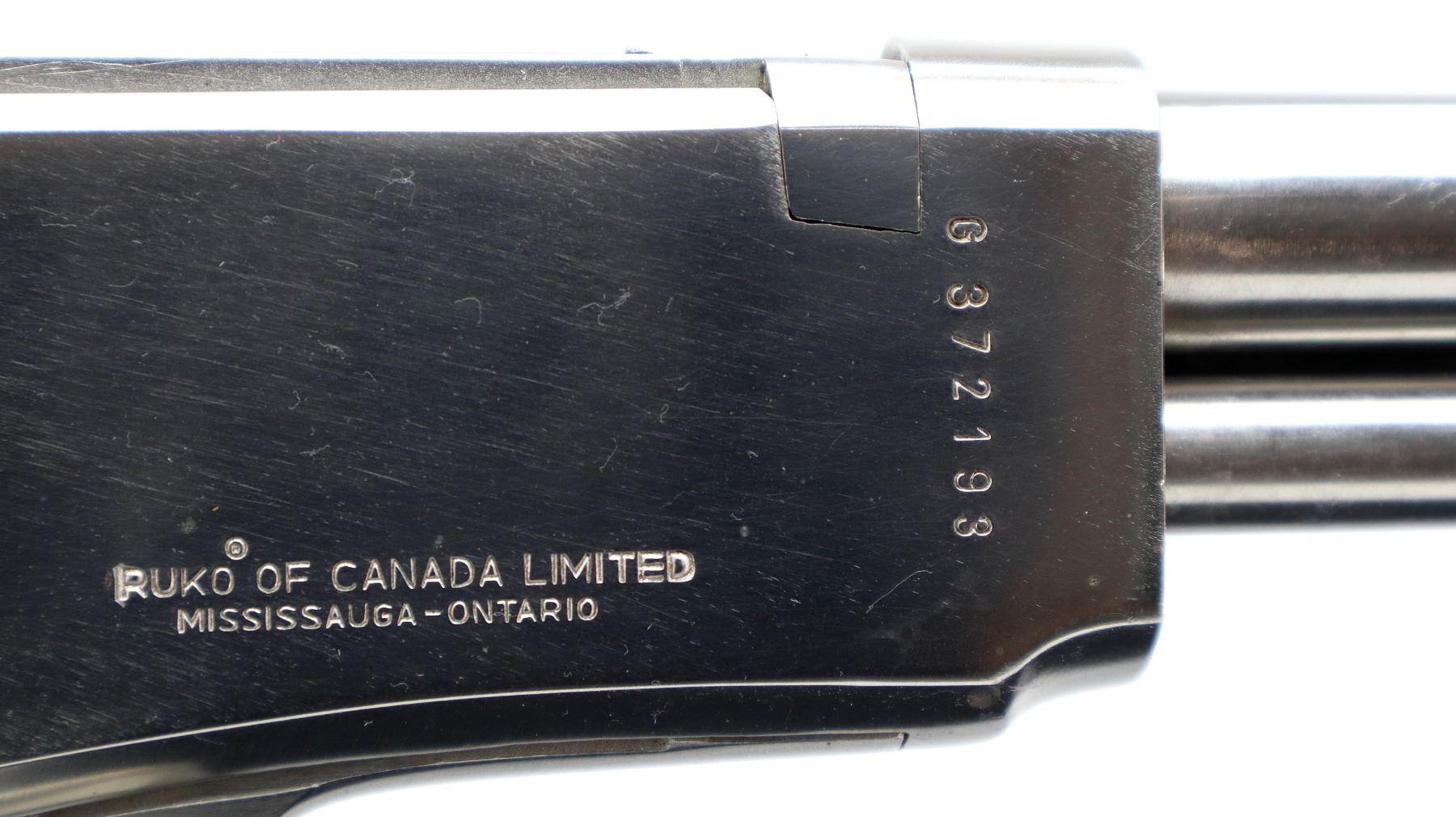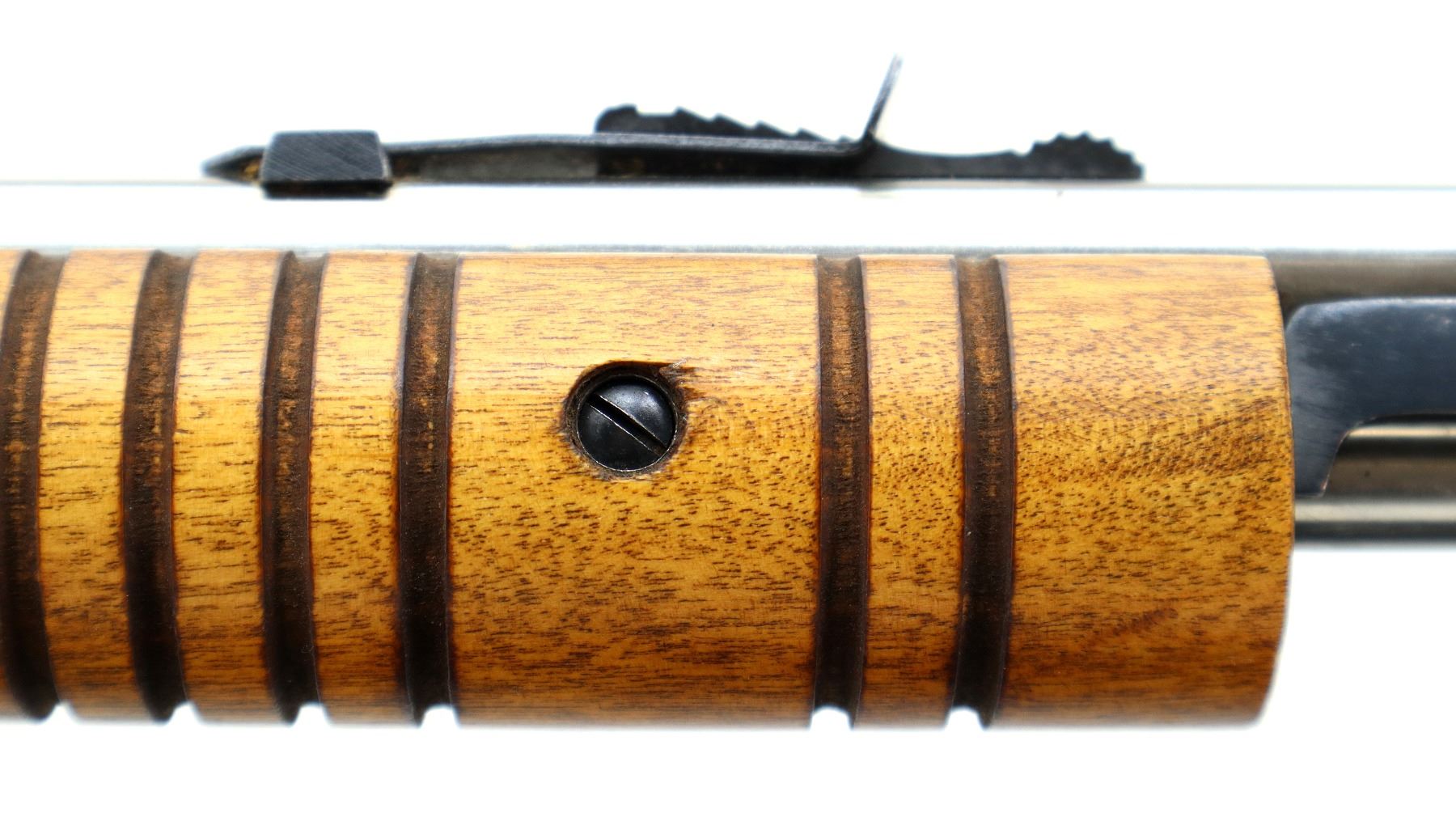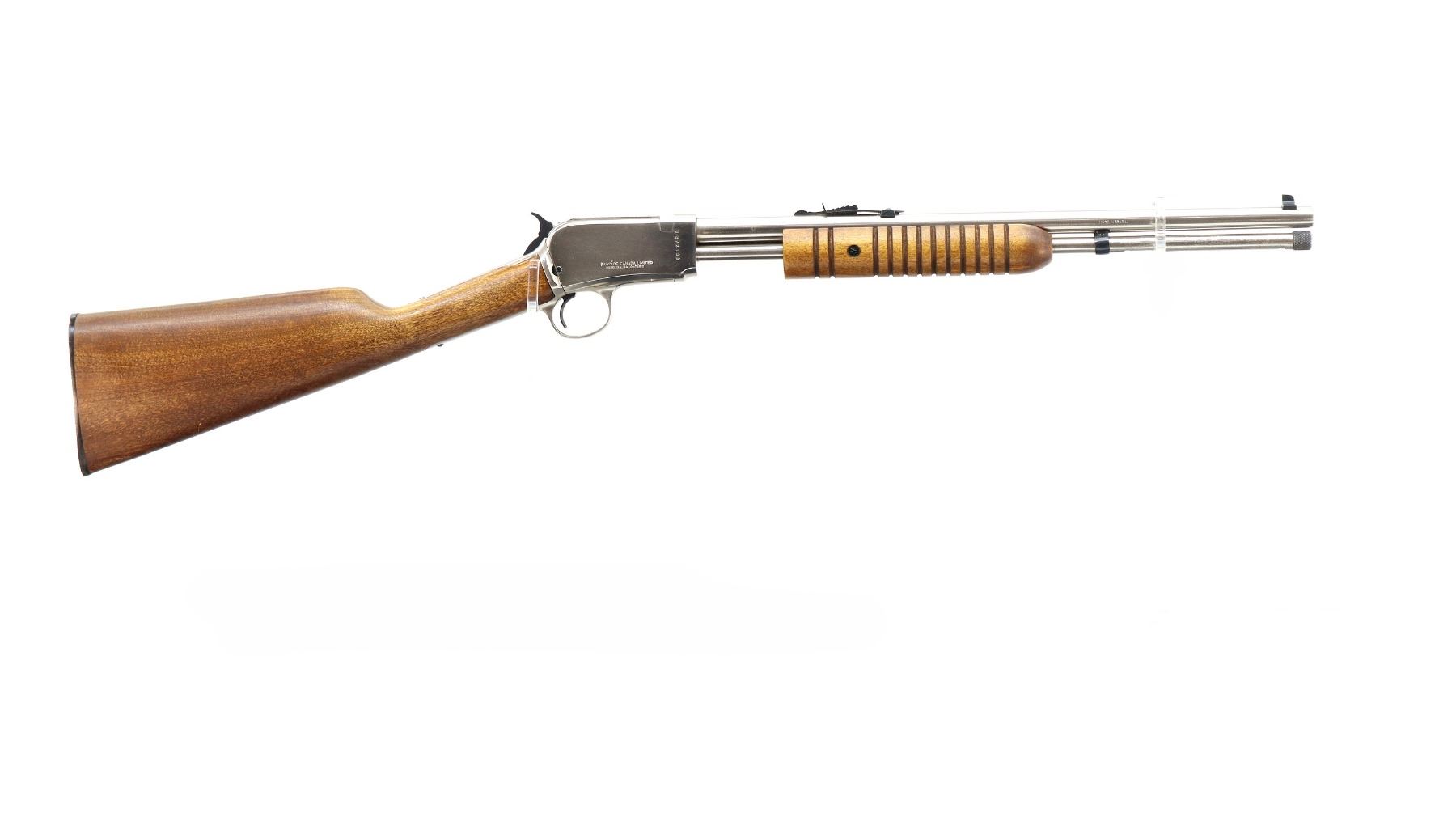 Main Description: Blade front sight, adjustable u notched rear sight, stainless finish, receiver drilled and tapped with no plug screws installed, grooved spur hammer. Two piece wood stocks, grooved forearm, straight grip, grooved black polymer butt plate, 13.25" LOP, full length magtube.