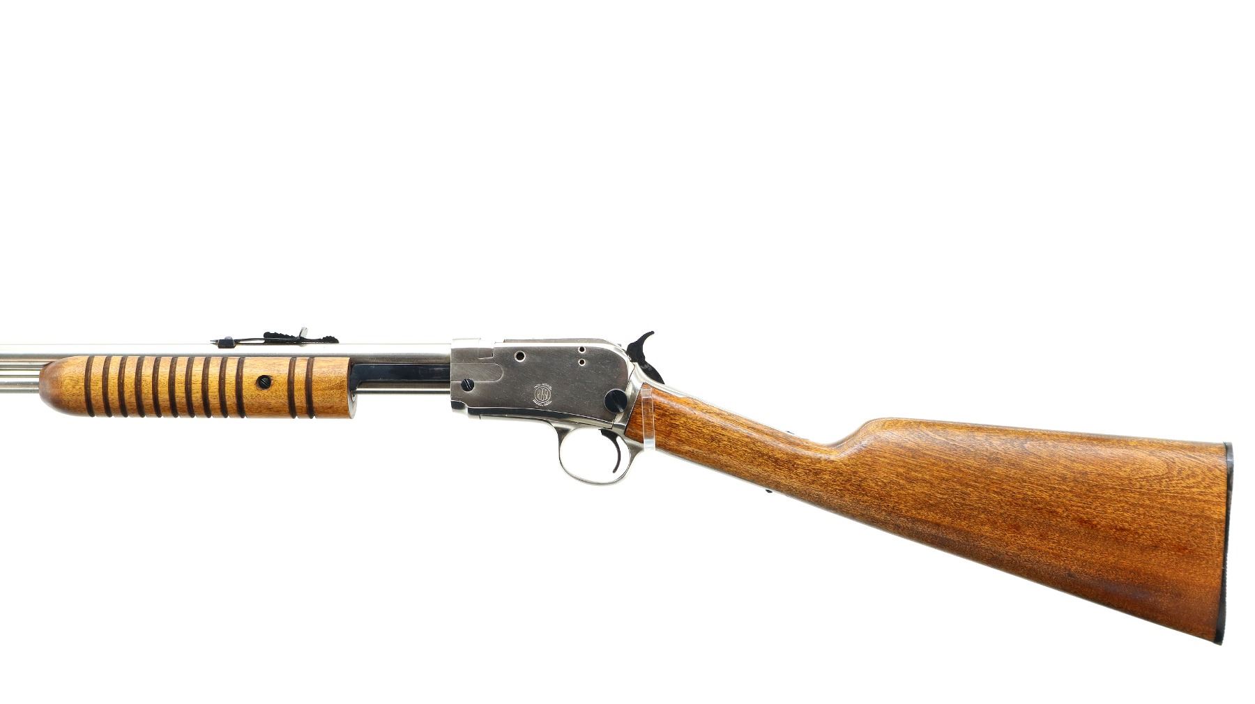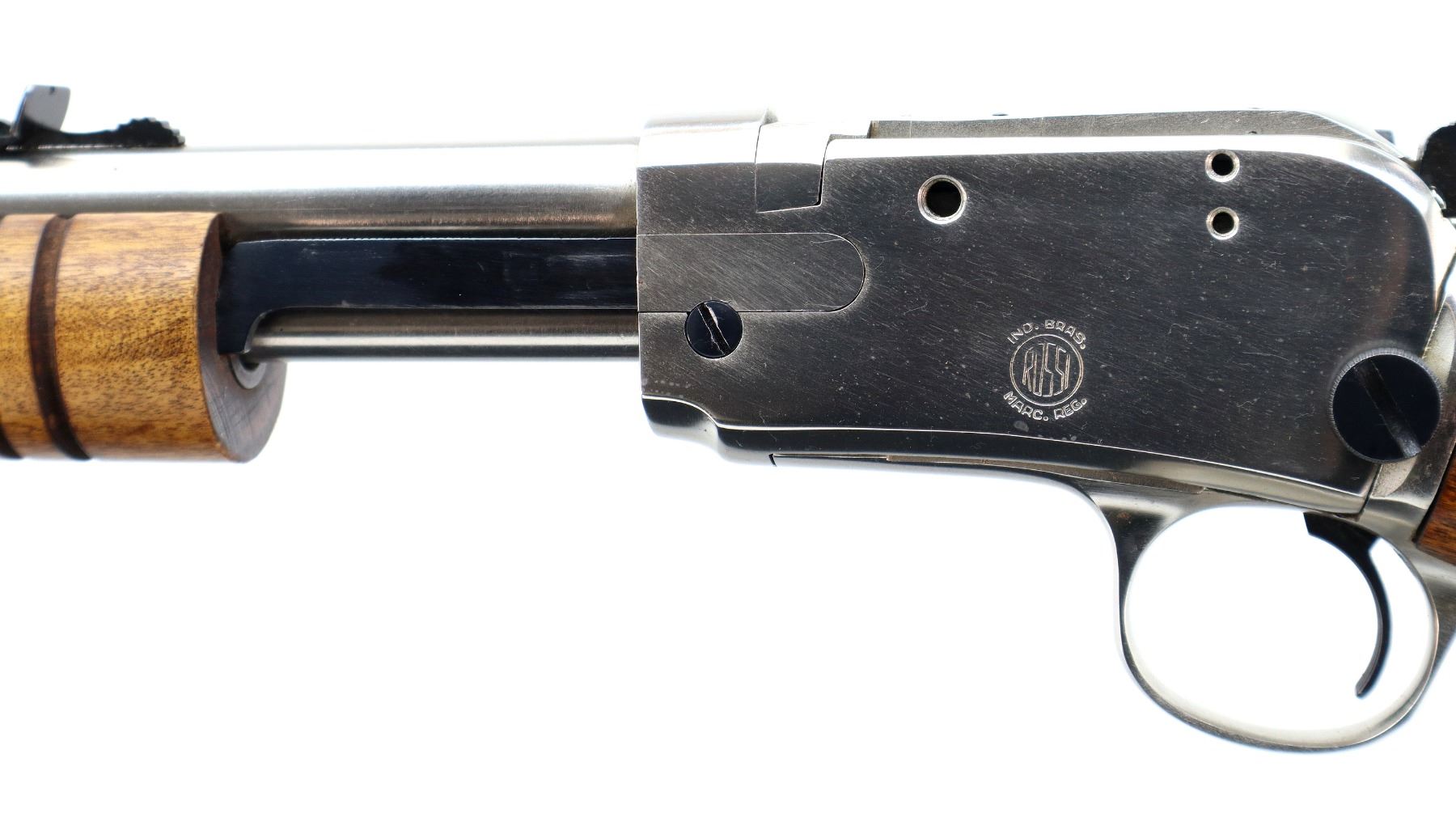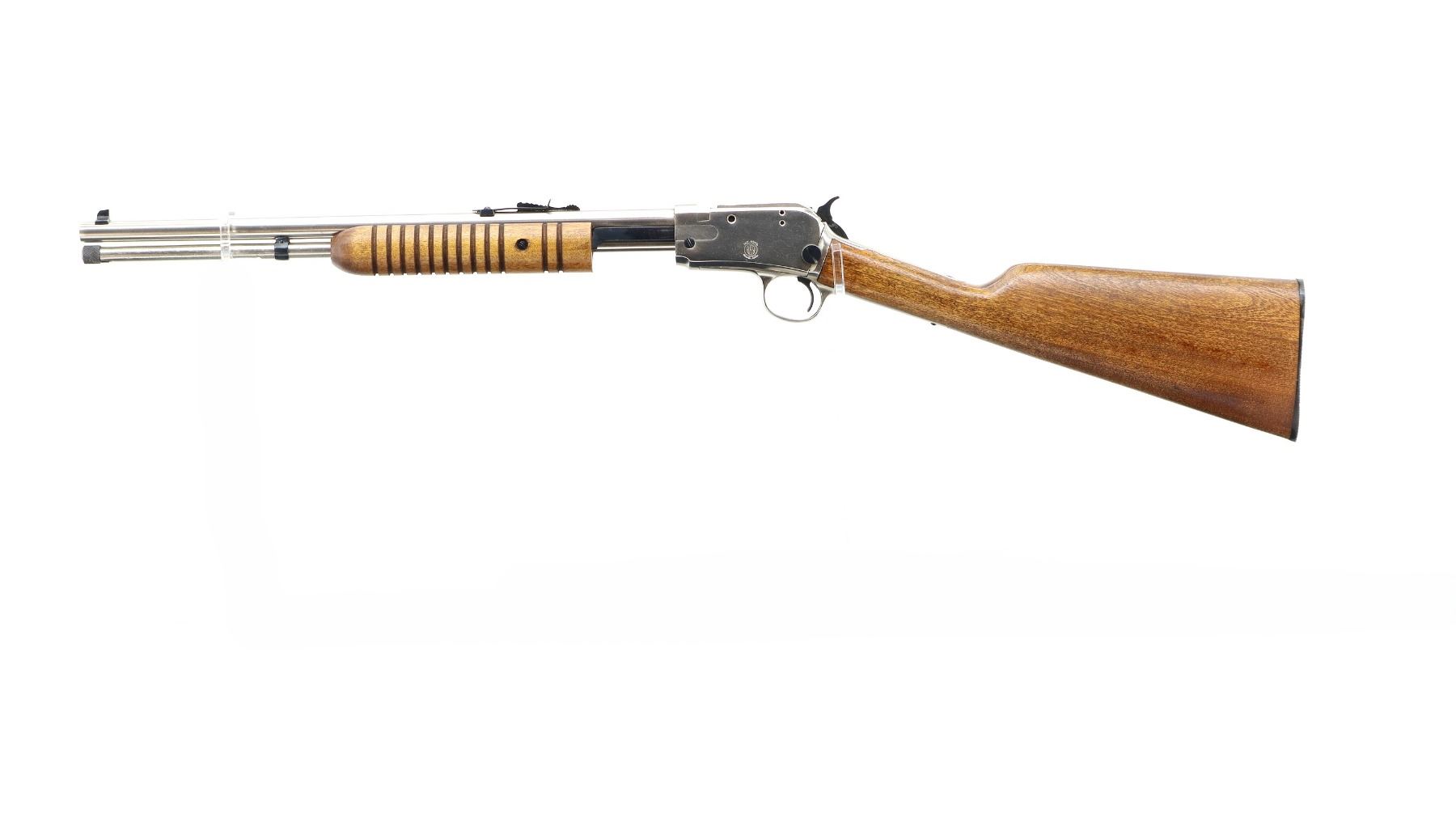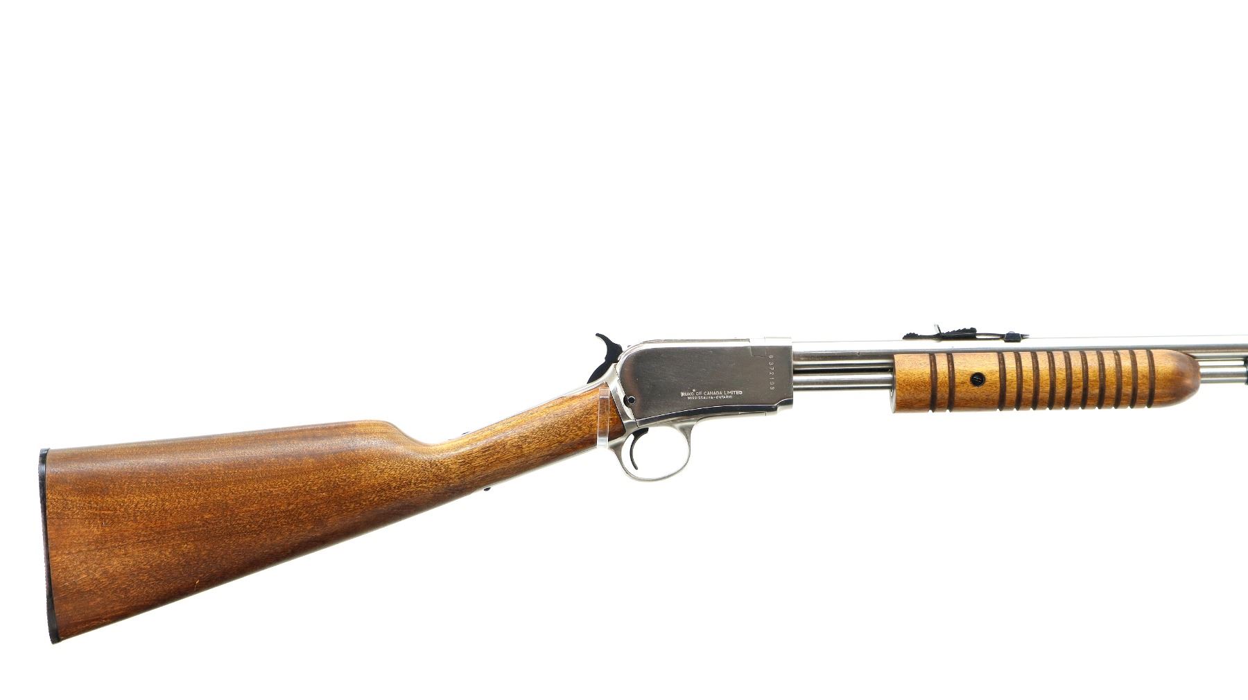 Main Description: Blade front sight, adjustable u notched rear sight, stainless finish, receiver drilled and tapped with no plug screws installed, grooved spur hammer. Two piece wood stocks, grooved forearm, straight grip, grooved black polymer butt plate, 13.25" LOP, full length magtube.