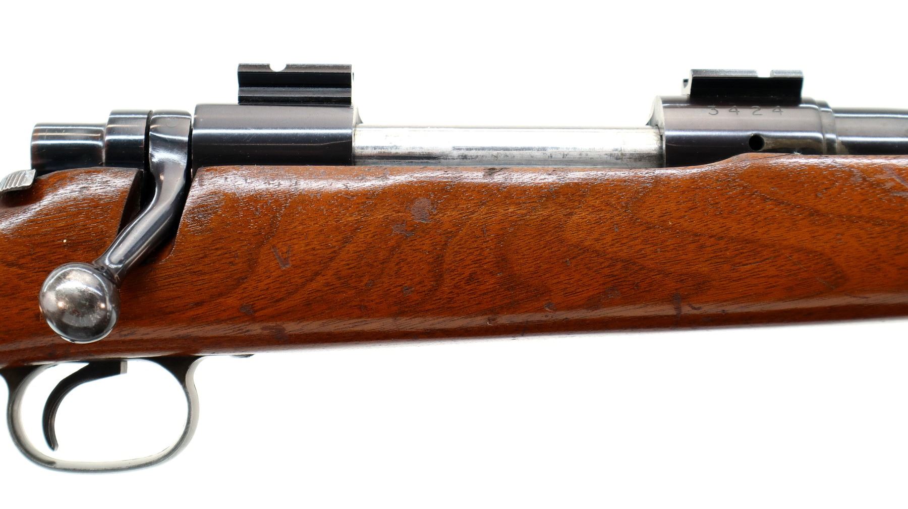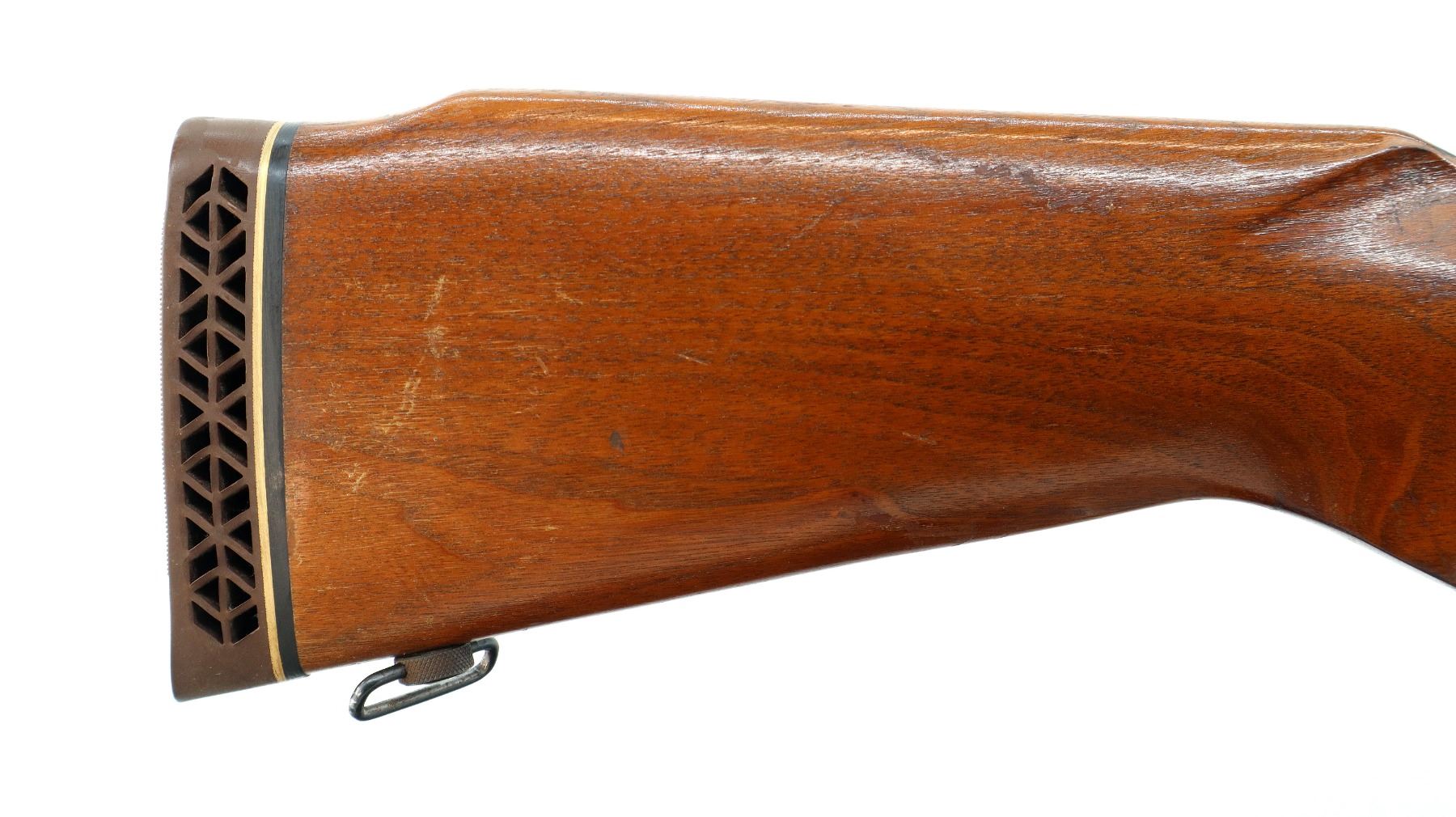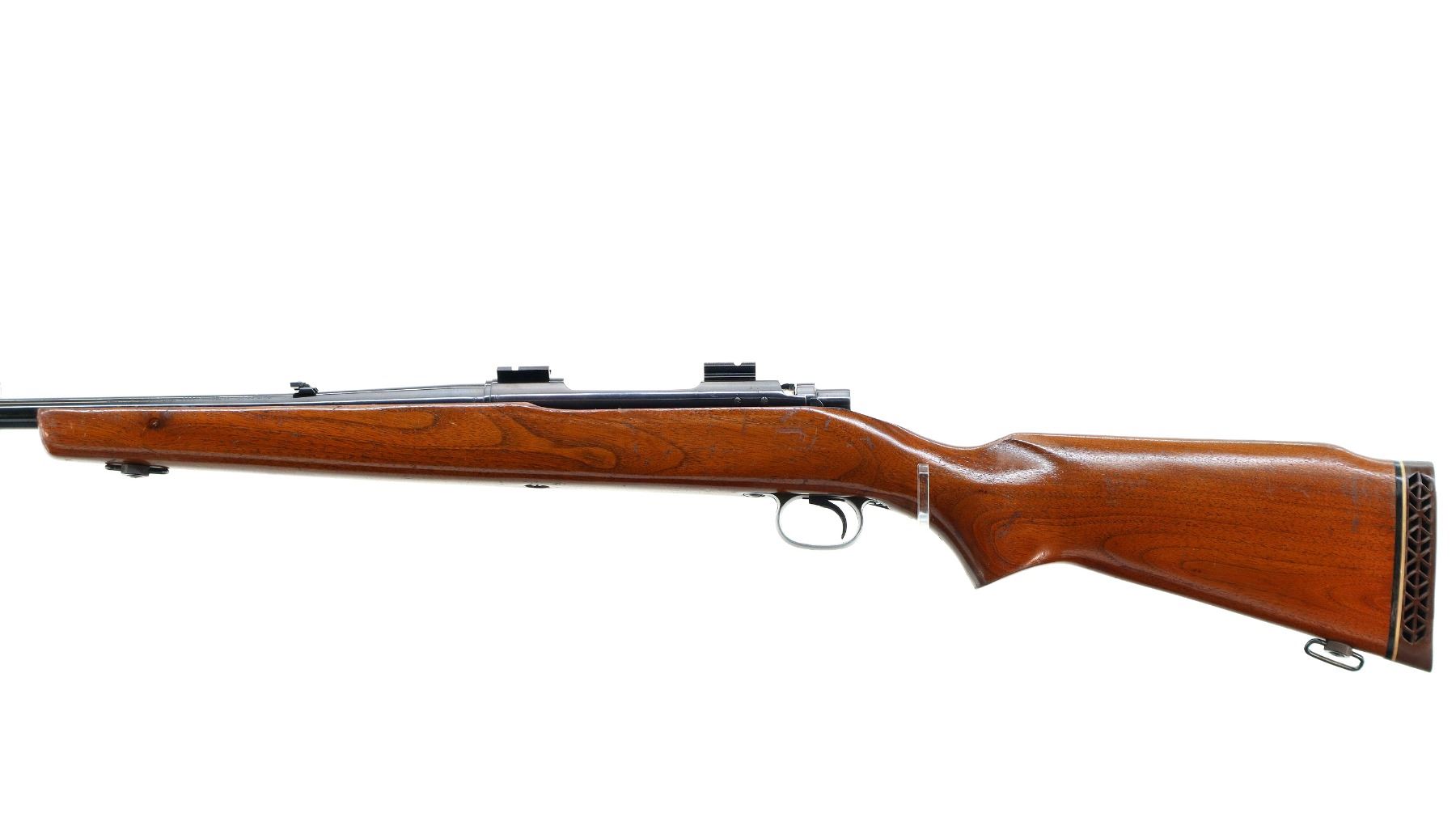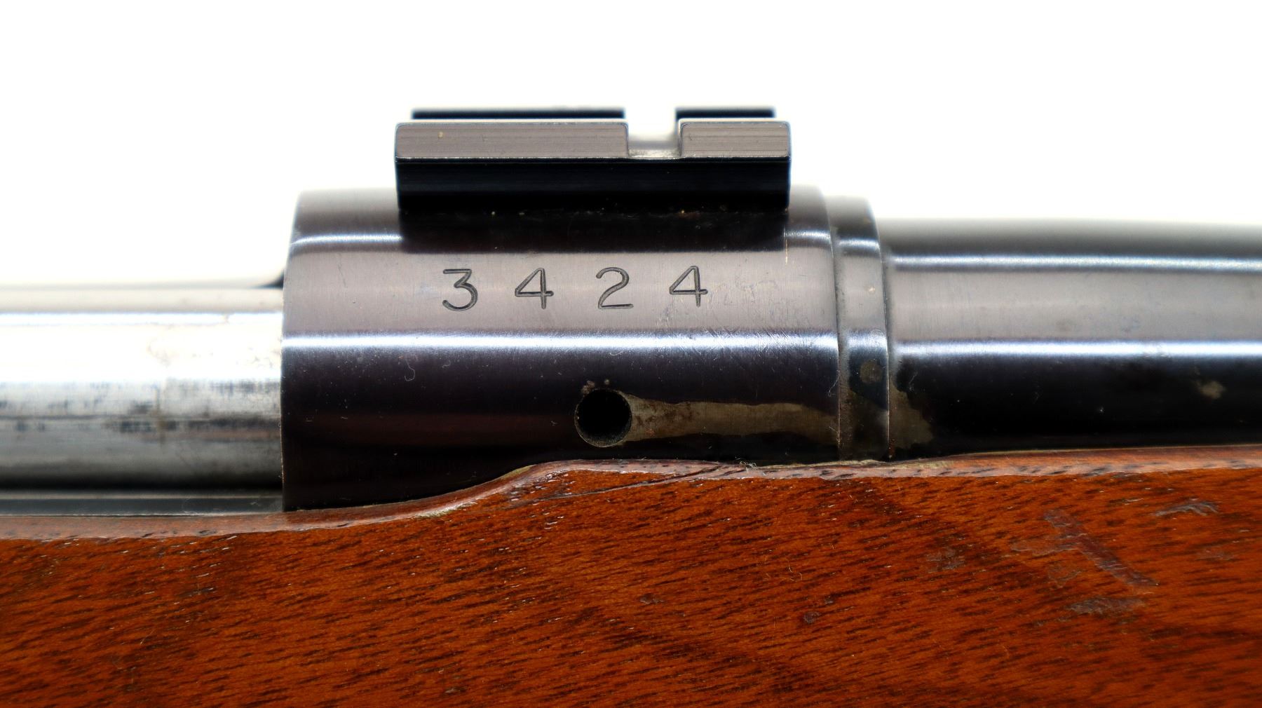 Main Description: Blade front sight with ramp, adjustable folding u notched rear sight, blued finish, receiver drilled and tapped with two piece bases installed, smooth bolt knob. One piece wood stock, pistol grip, small chip behind receiver, raised comb, brown vented rubber recoil pad, 13.5" LOP, blind magazine, sling swivels.