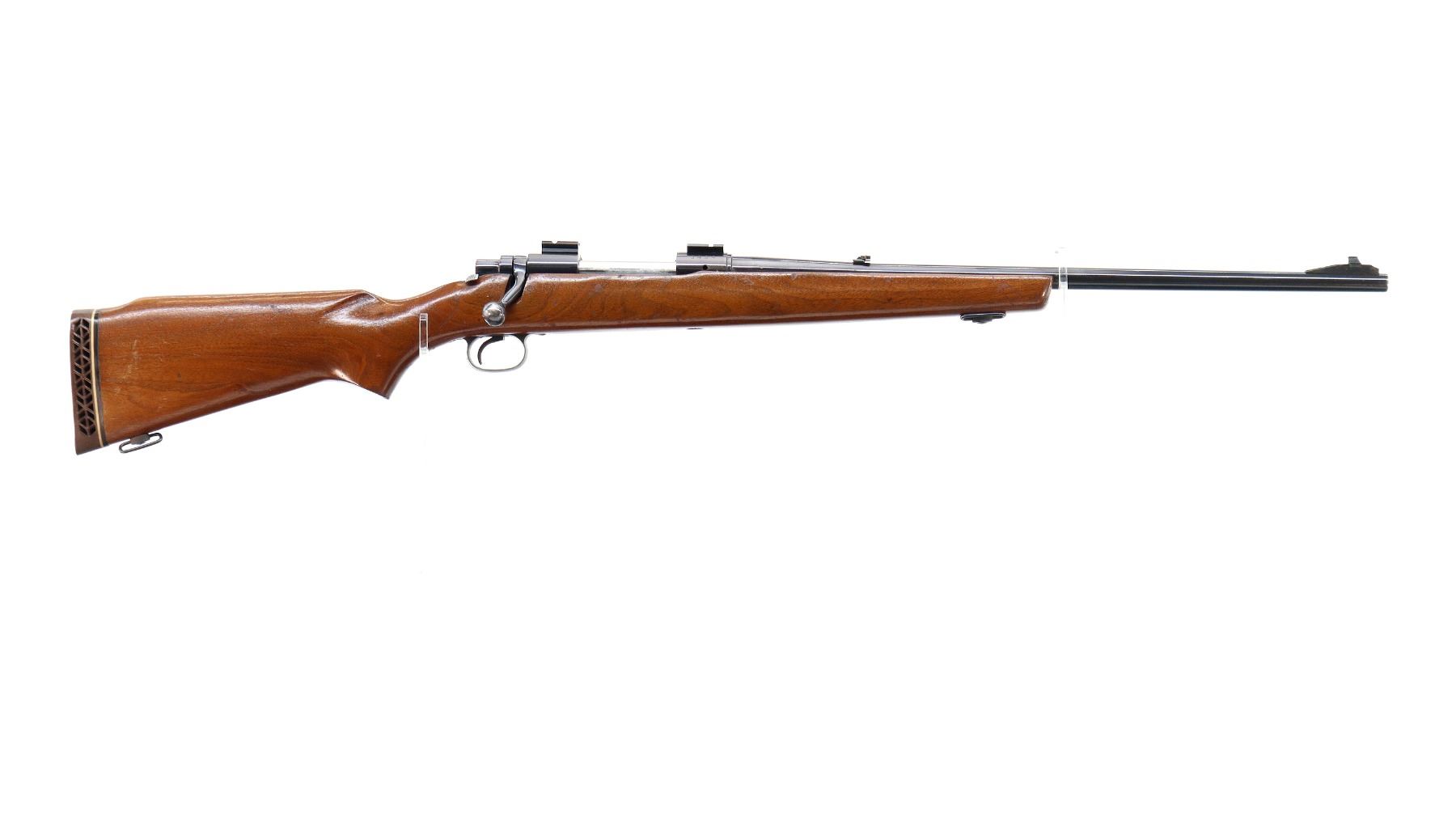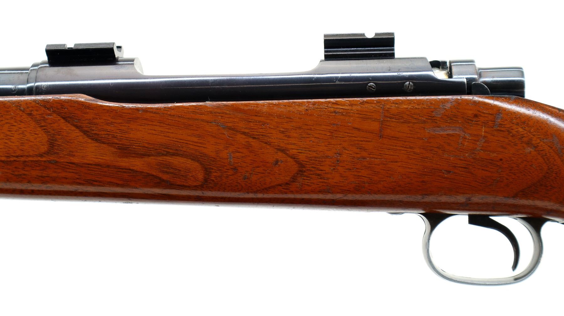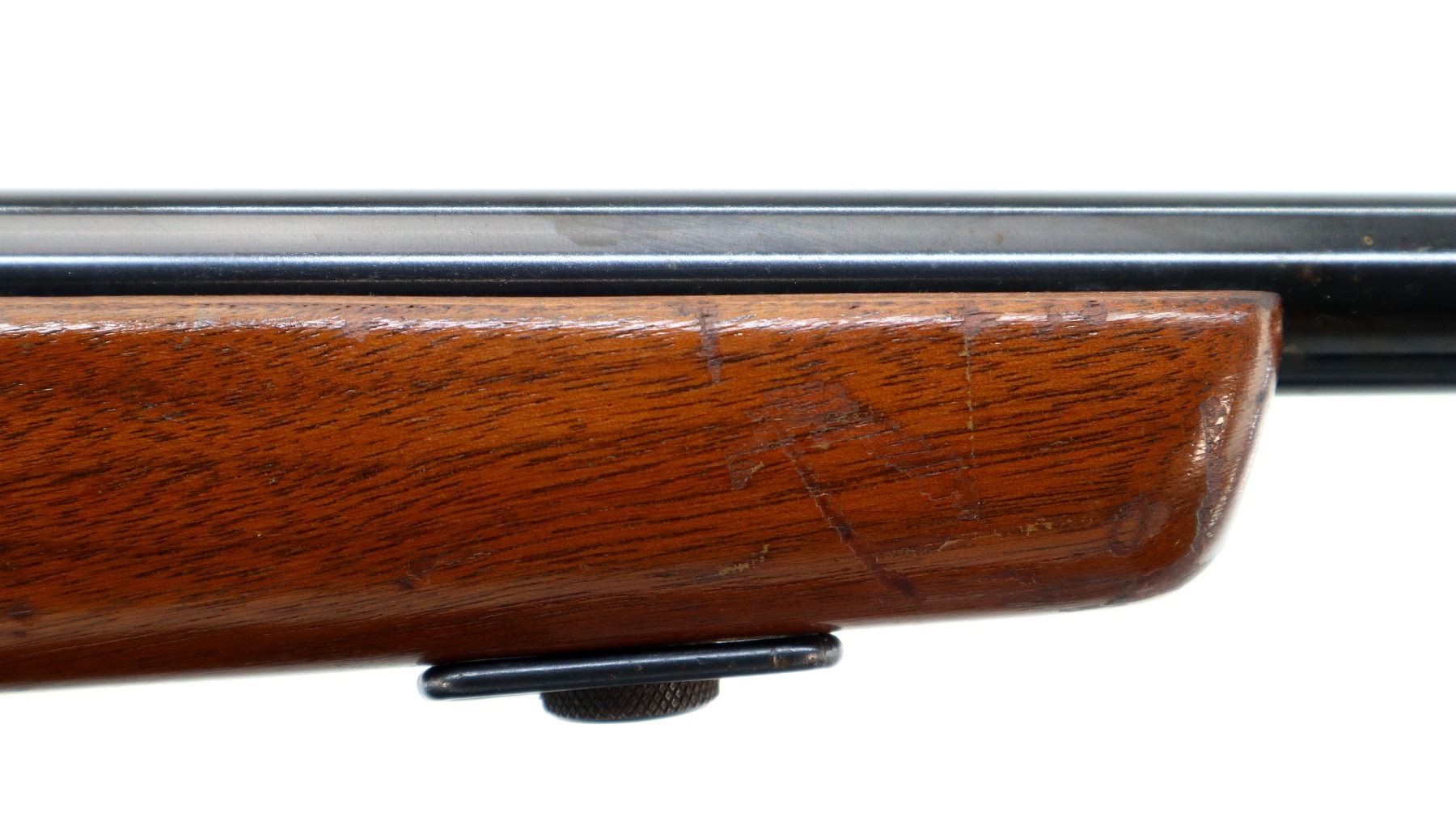 Main Description: Blade front sight with ramp, adjustable folding u notched rear sight, blued finish, receiver drilled and tapped with two piece bases installed, smooth bolt knob. One piece wood stock, pistol grip, small chip behind receiver, raised comb, brown vented rubber recoil pad, 13.5" LOP, blind magazine, sling swivels.
